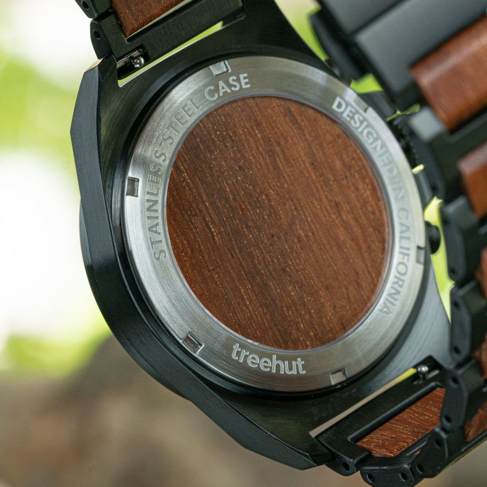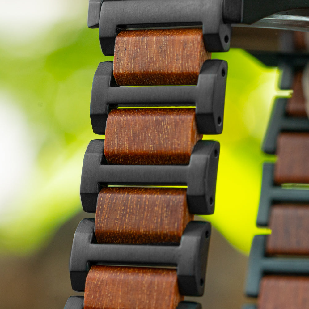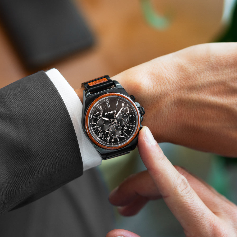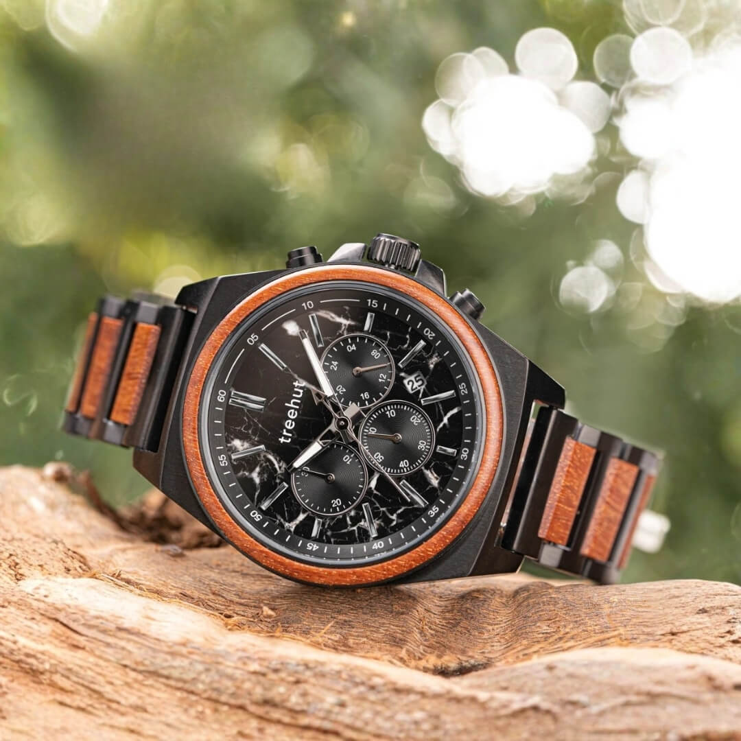 The Aster Black Marble Padauk stands out with a natural black marble dial and a black stainless steel case. A red padauk wood inlay wraps the bezel in warmth, while the sleek three-link strap completes the look. Among today’s chronograph watches for men, this black chronograph watch blends edge and elegance effortlessly.