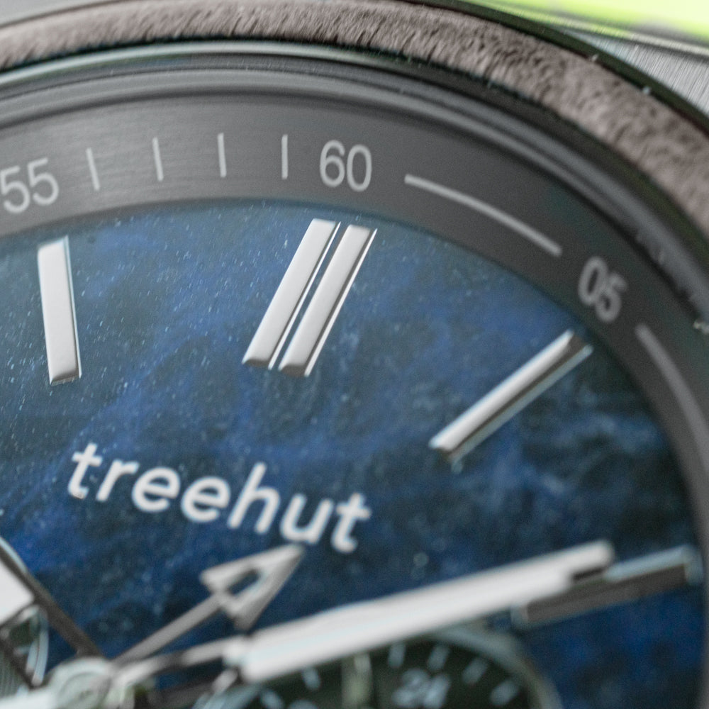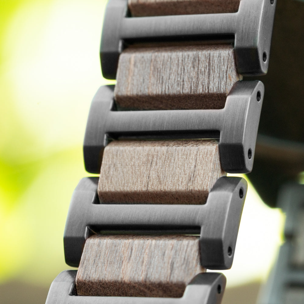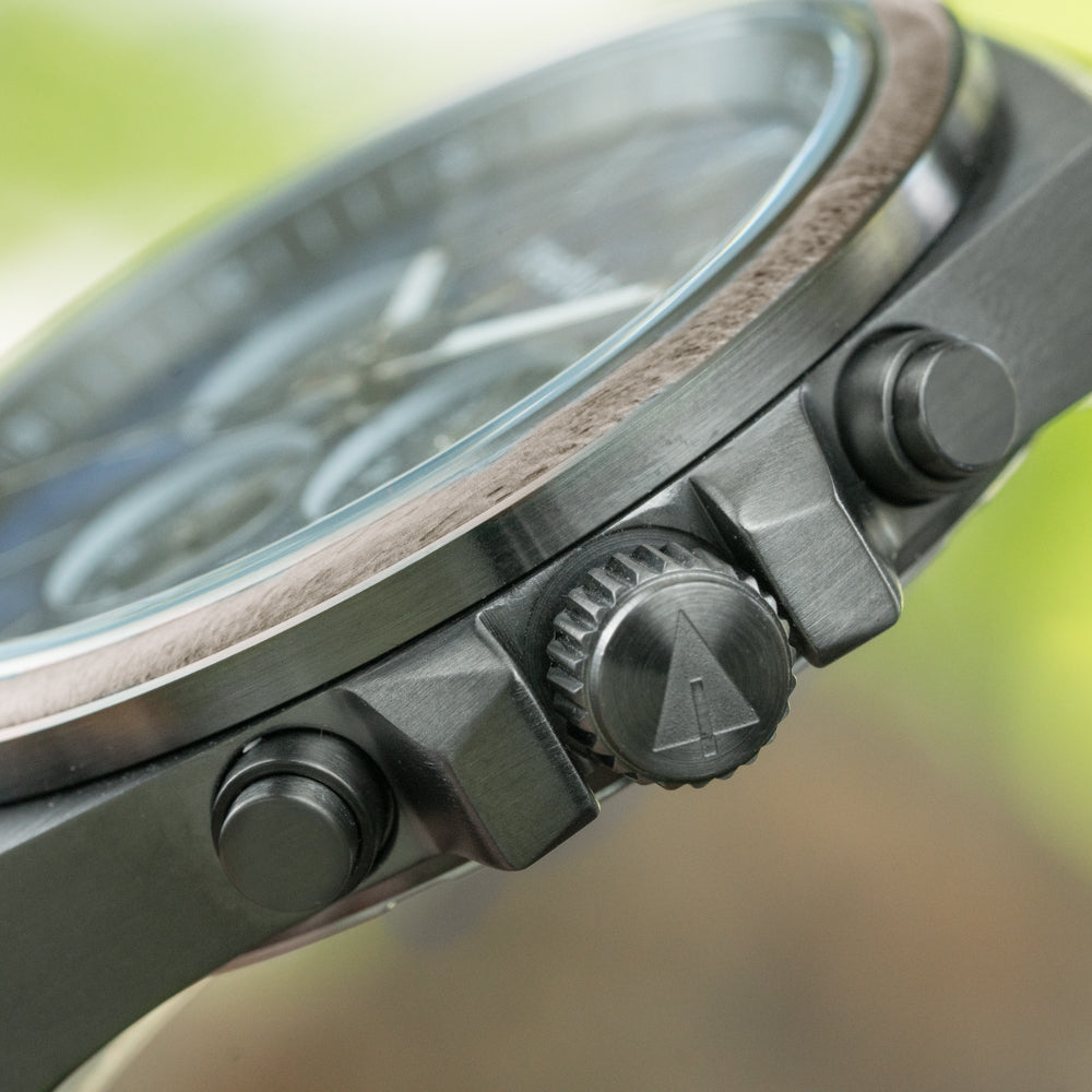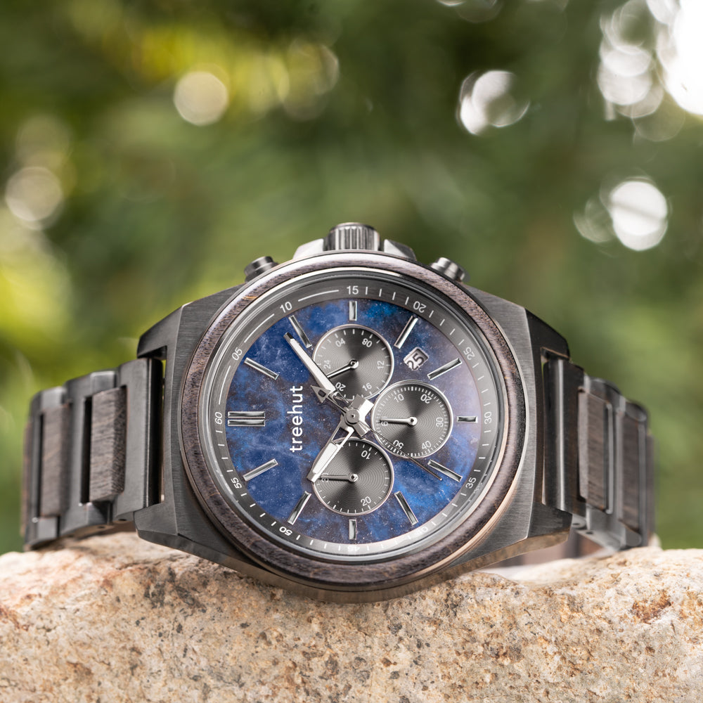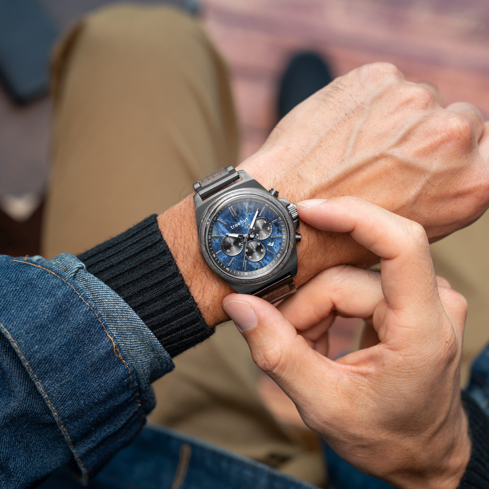 The Aster Blue Marble Grey Maple chronograph features a swirling blue marble watch dial – cool and dimensional – encased in gunmetal stainless steel. A grey maple wood inlay and matching three-link band add a grounded, natural balance to its sport-ready silhouette. It’s a timepiece for momentum, precision, and personality.