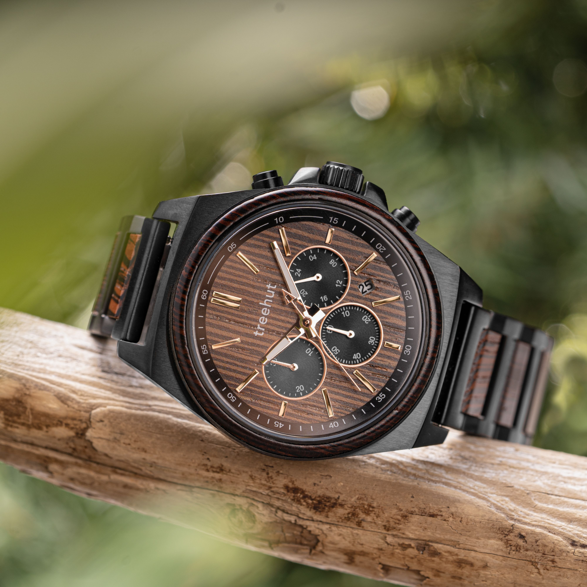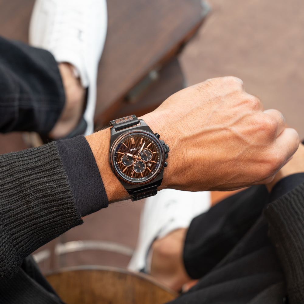 The Aster Burgundy Wenge brings rhythm and purpose to everyday wear. Designed for motion, this burgundy watch men’s edition features a chronograph layout with three sub-dials and a date window, all set against a rich wenge wood dial. Subtle rose gold accents add depth, while a stainless steel case grounds the design in durability.