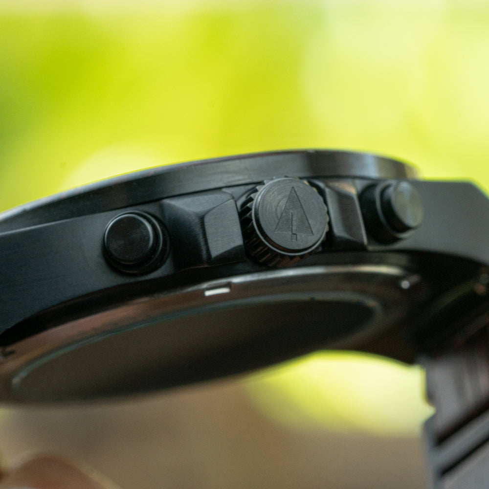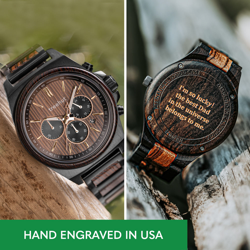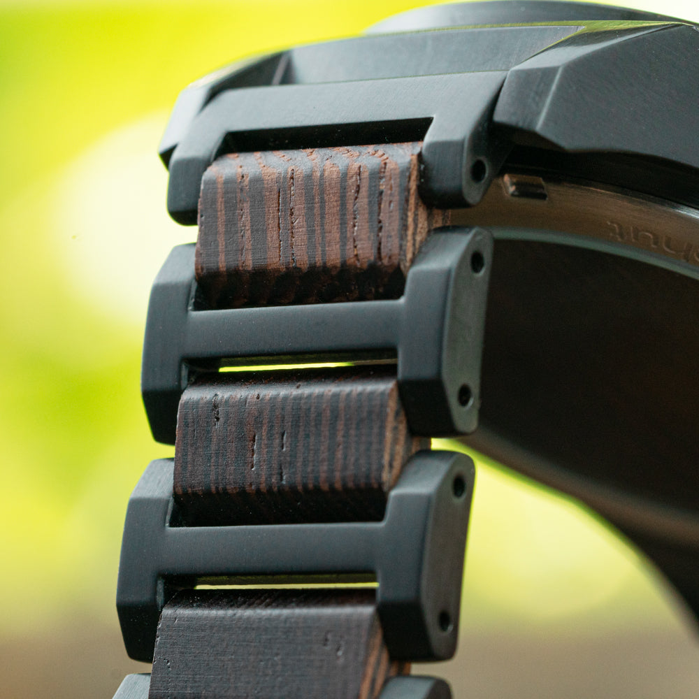 Matched with a three-link wenge band and black steel frame, this timepiece is more than stylish – it’s practical for the man always on the move. Whether dressing up or down, the burgundy watch men’s silhouette captures a fine balance between sport and statement. The black and burgundy watch combination offers bold contrast with organic roots, making it a standout in the Aster Collection.