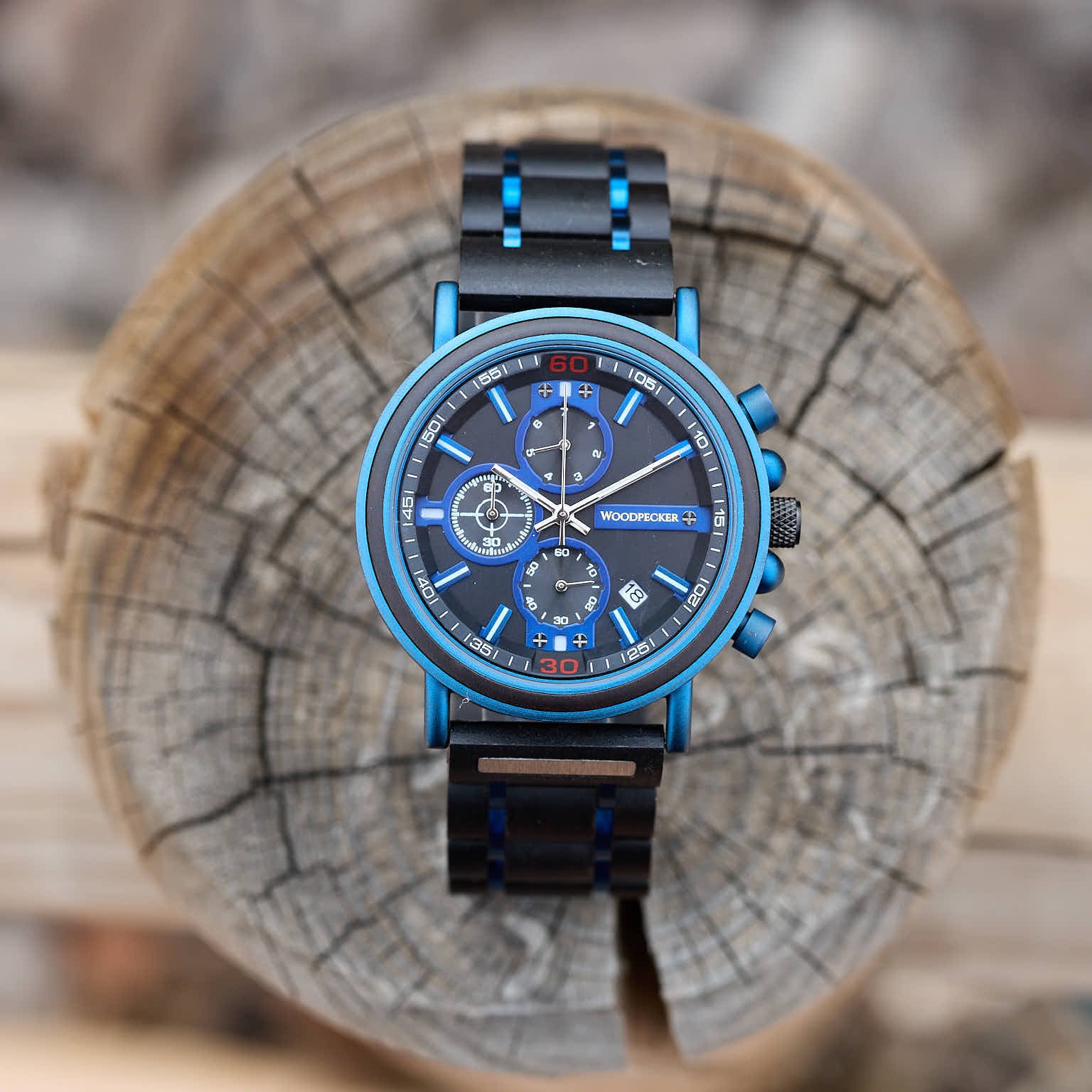Elevate your style or give the perfect personalized gift with this striking wooden watch. Designed with sophistication in mind, this timepiece features a sleek black base complemented by stunning blue details that add a modern flair.
