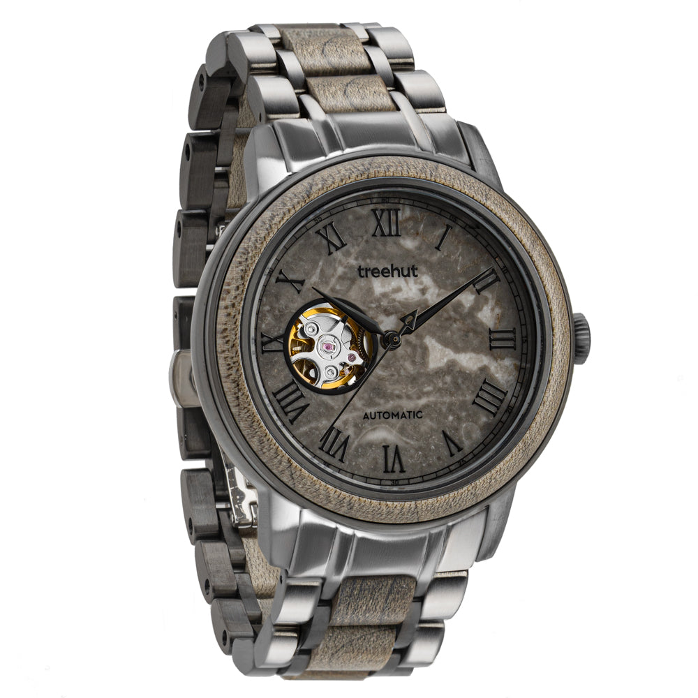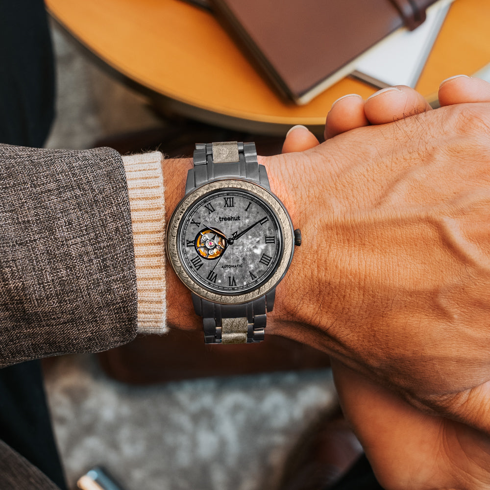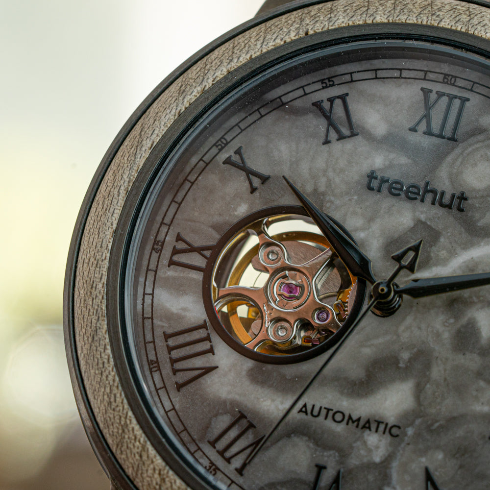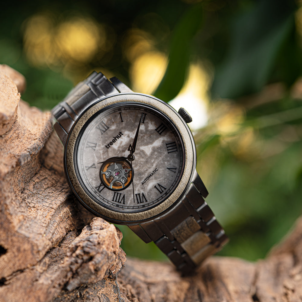 Travel through time with the Atlas Collection – Treehut’s line of automatic timepieces designed for the modern man who values elegant style and intelligent craftsmanship. This series redefines wooden watches for men with a striking mix of raw materials and refined mechanics. Each piece features a real marble dial with a window revealing the movement, set beneath a wood bezel on a vintage-inspired barrel-shaped stainless steel case.