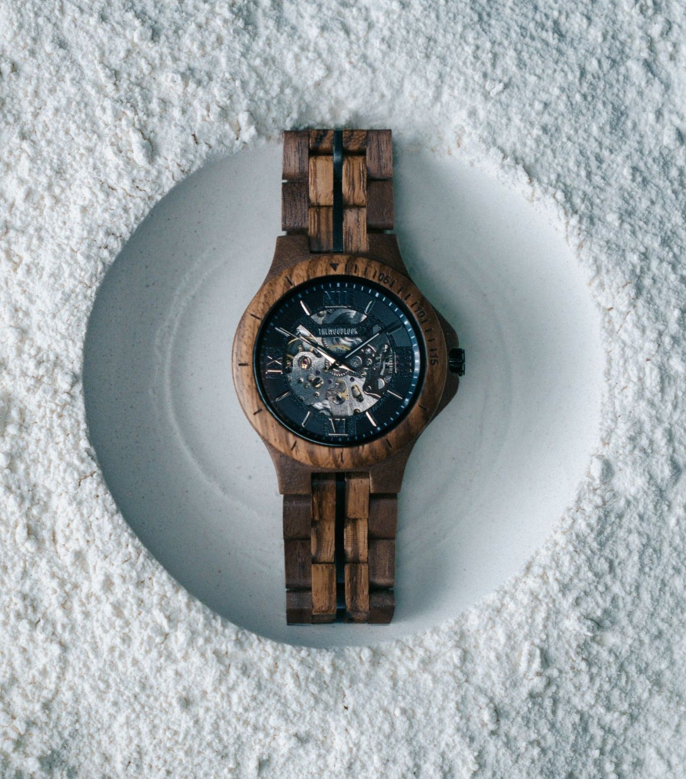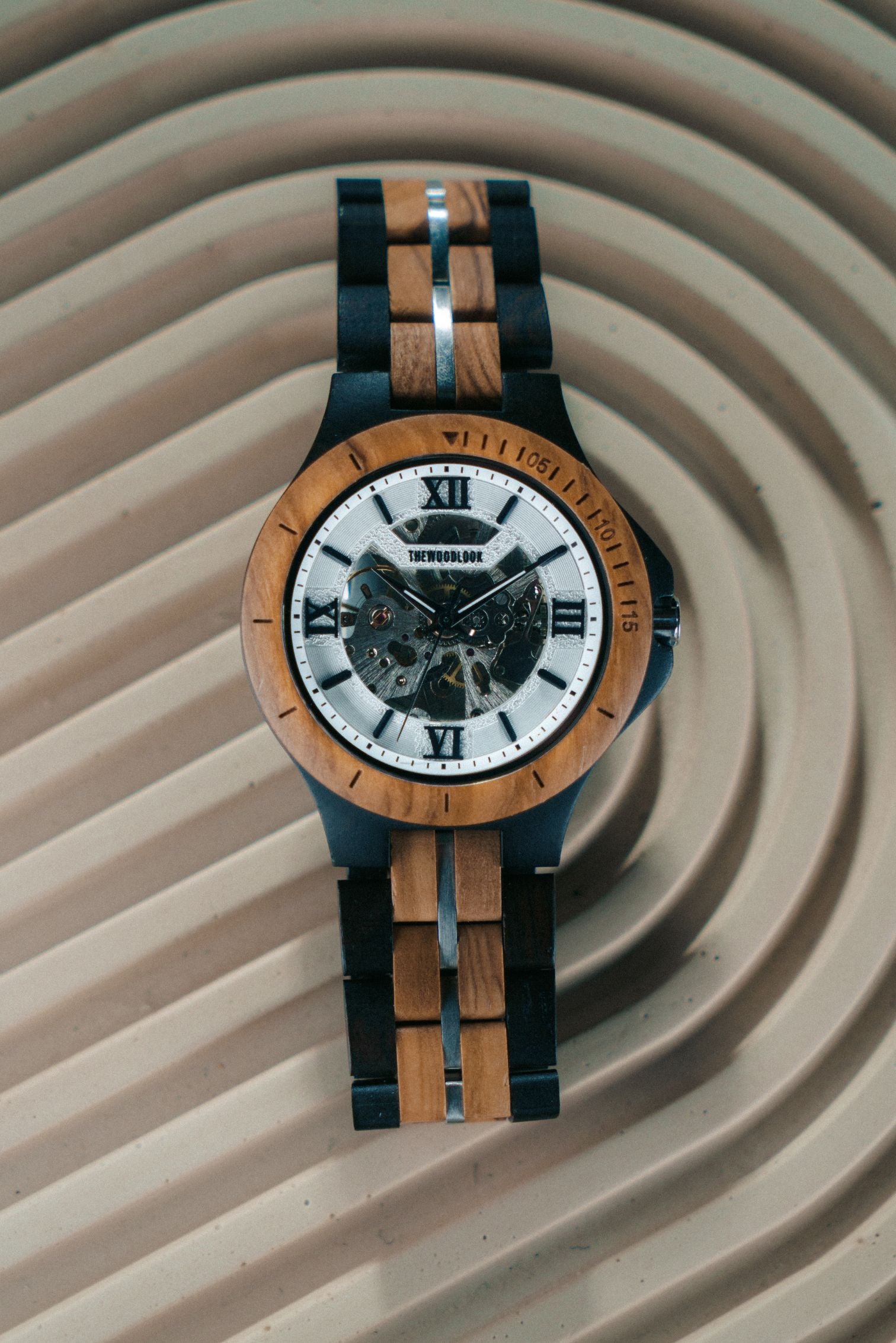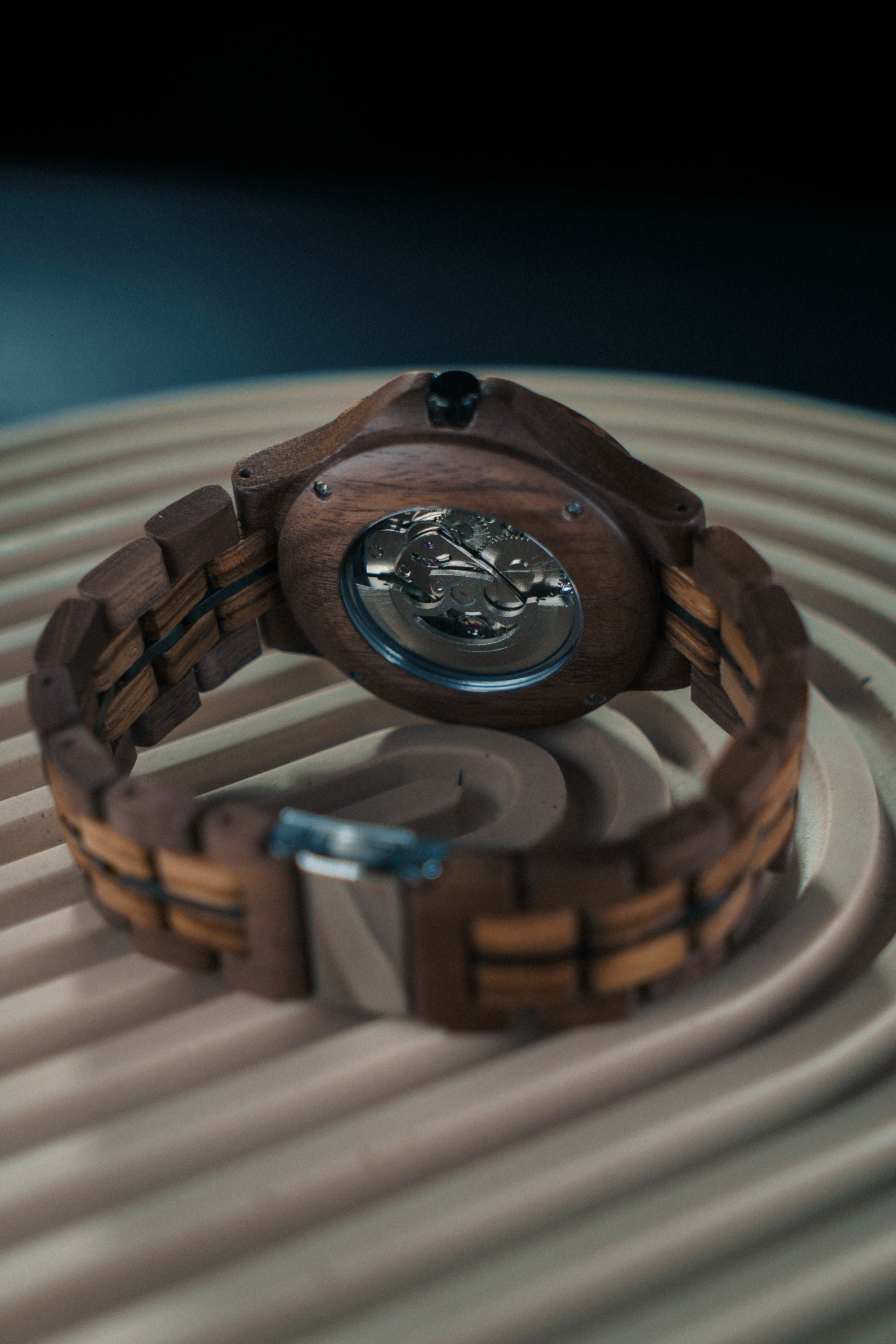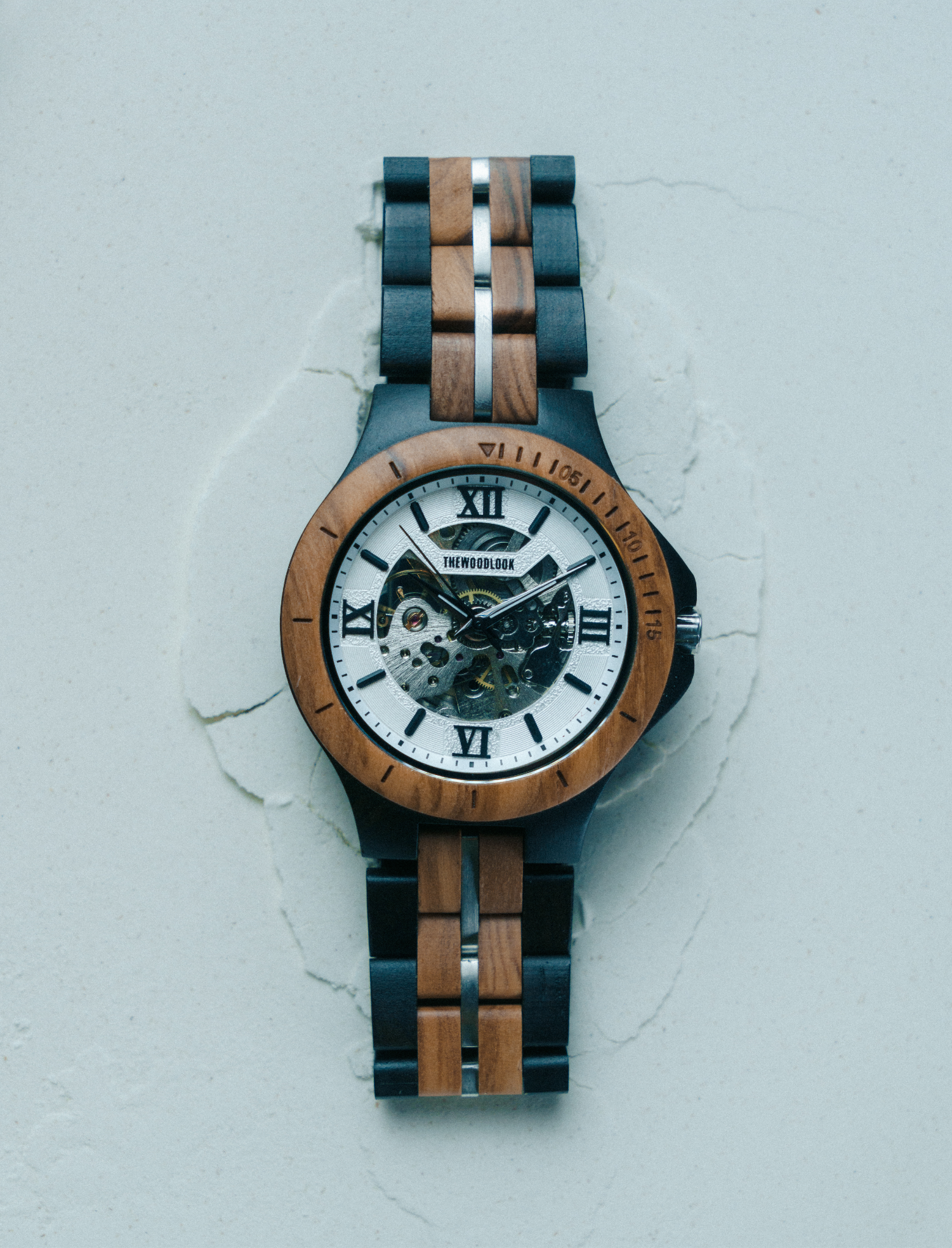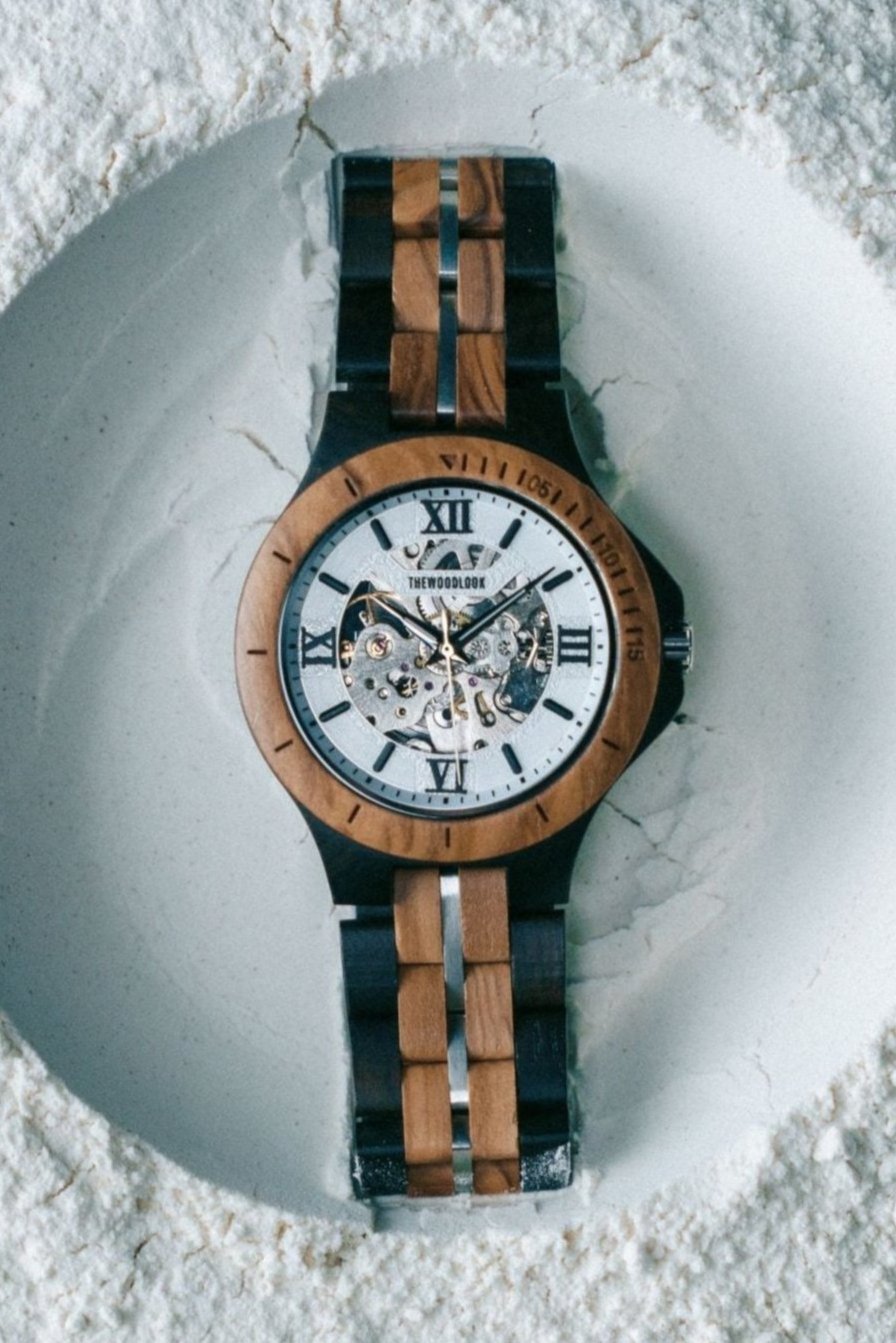 The Barcelona mechanical watch is powered by wrist movement, eliminating the need for batteries. The white model blends dark ebony and light olive wood for a refined look, while the black model pairs rich walnut with bold zebrawood for striking contrast. Versatile and stylish, it complements any outfit and adjusts to fit various wrist sizes.