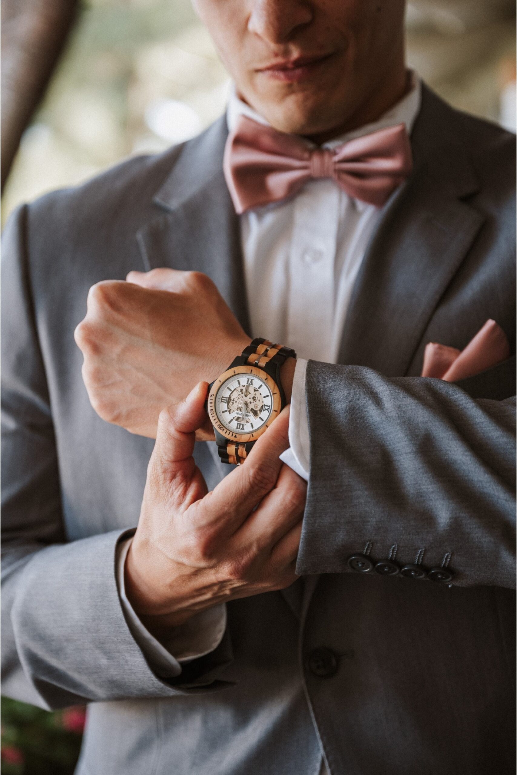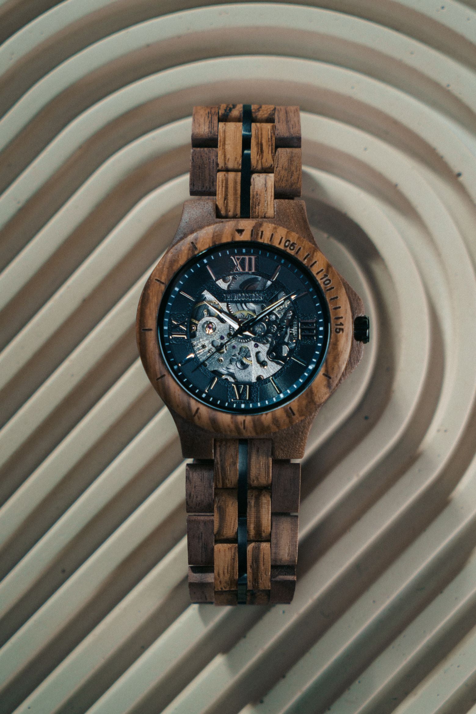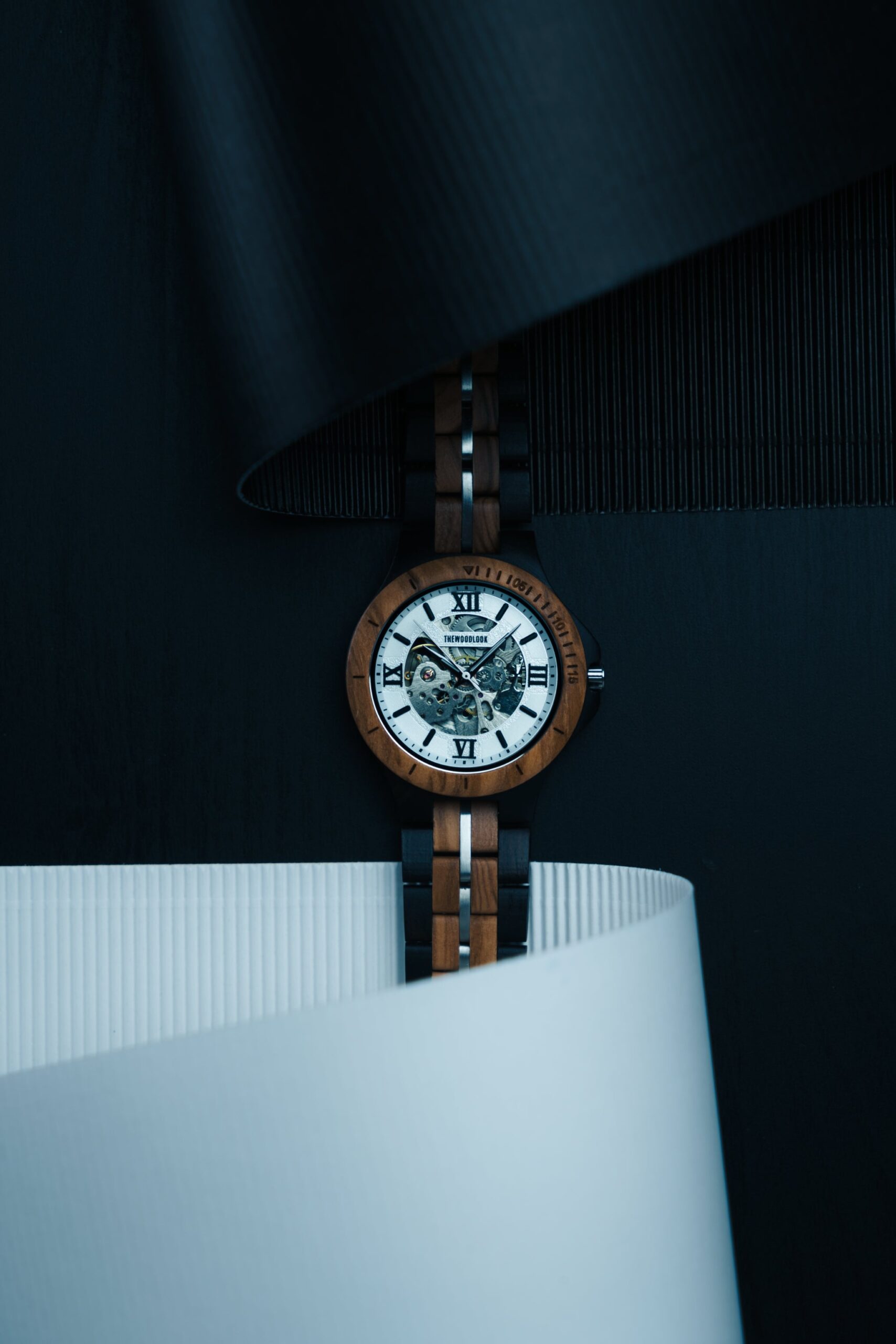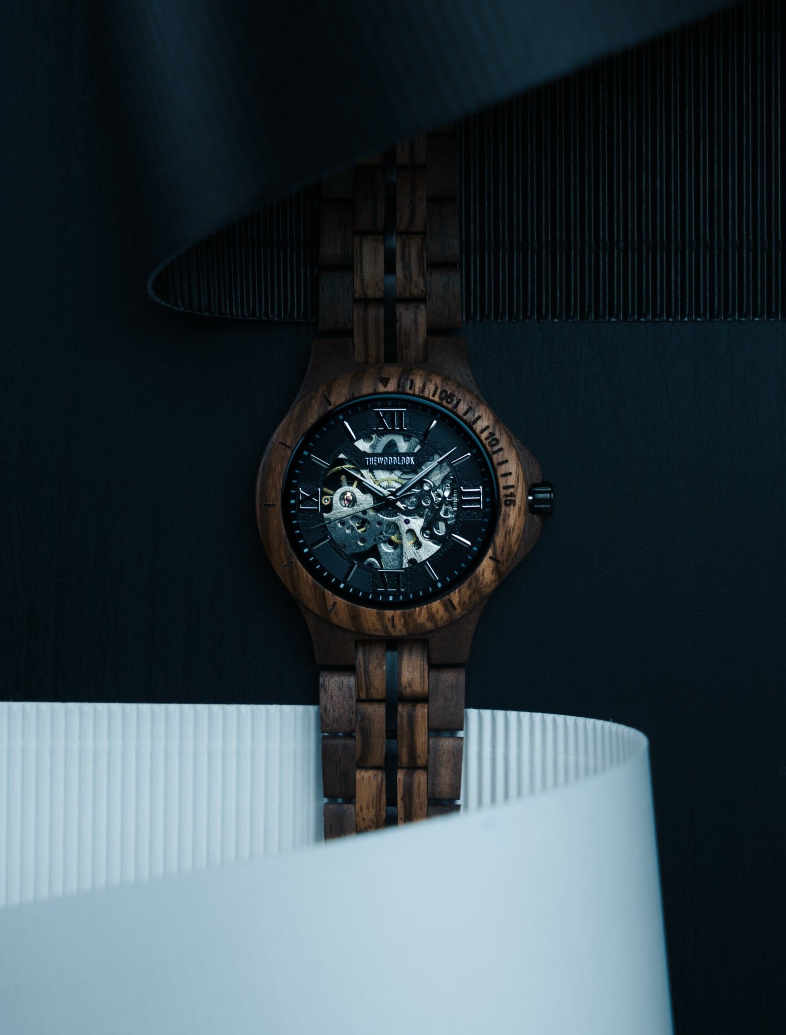 The Barcelona mechanical watch is powered by wrist movement, eliminating the need for batteries. The white model blends dark ebony and light olive wood for a refined look, while the black model pairs rich walnut with bold zebrawood for striking contrast. Versatile and stylish, it complements any outfit and adjusts to fit various wrist sizes.