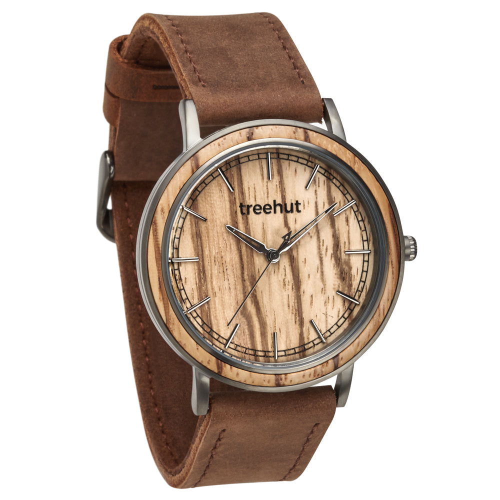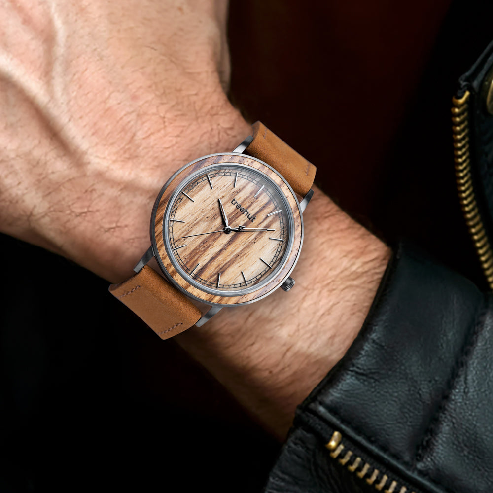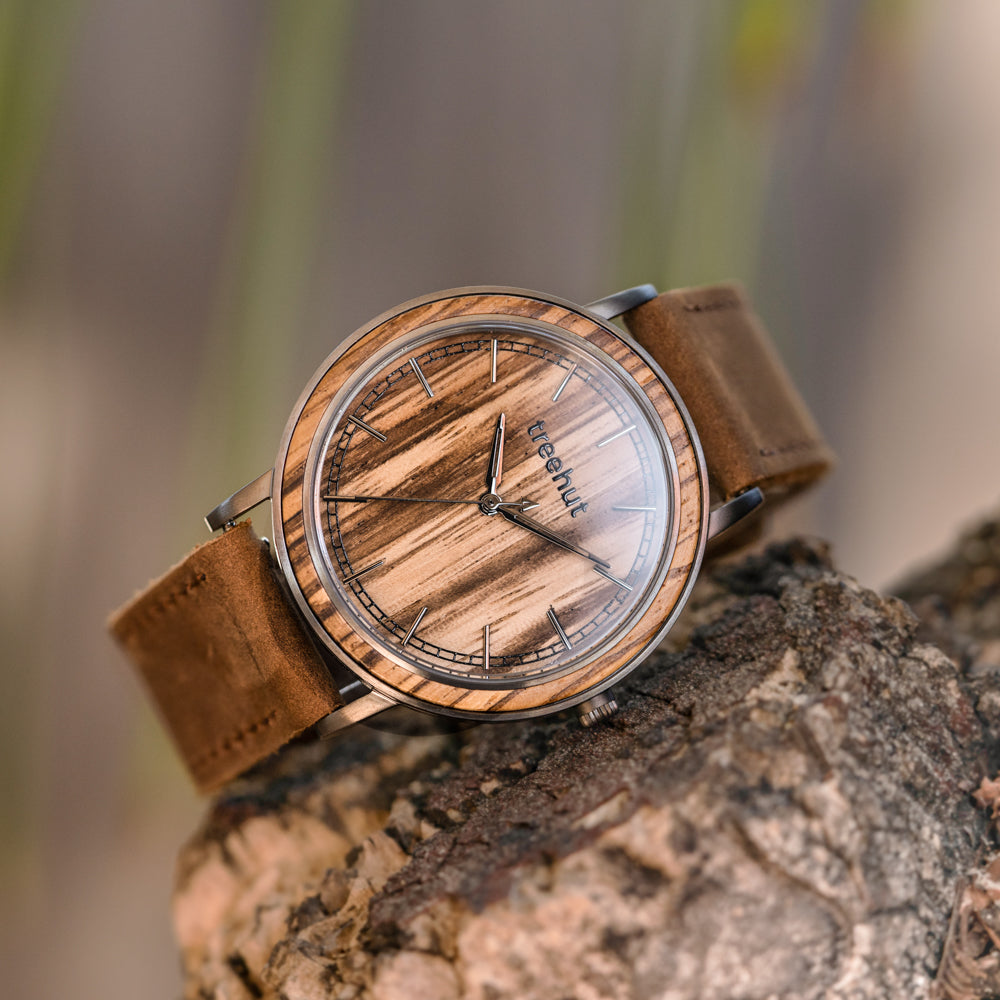 The Bay Zebrawood Gunmetal wood watch for men is framed with an elegantly slim gunmetal and natural zebrawood case, detailed with a zebrawood dial, and paired with a distressed brown genuine leather band. The result is a minimally sophisticated look that complements everyday wear with ease. This luxury wooden watch blends natural textures with modern design for an elevated yet grounded aesthetic. Whether you’re exploring new trails or heading into the city, this is the best wooden watch to take with you. It’s not just a statement – it’s a signature.