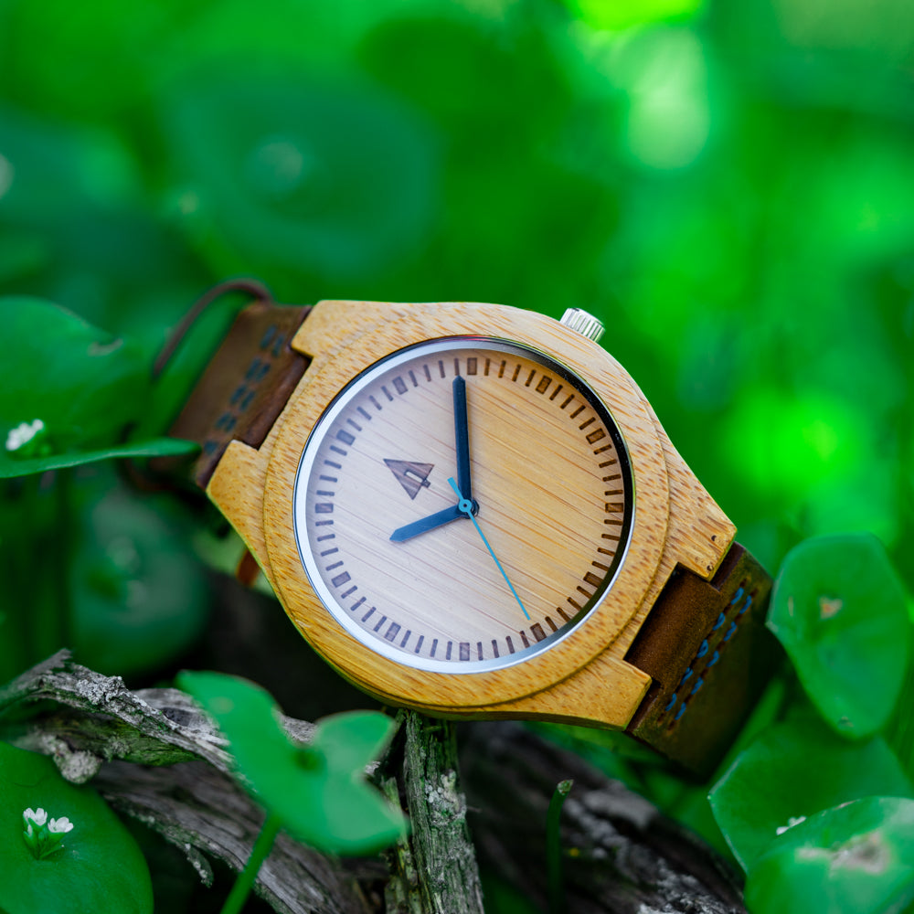 The Classic Boyd Blue sits at the origin of Treehut’s design philosophy – where simplicity, nature, and daily function meet. Inspired in Bali, this piece captures the essence of men’s wooden watches with a bamboo case and dial, paired with a rugged leather strap stitched in blue.