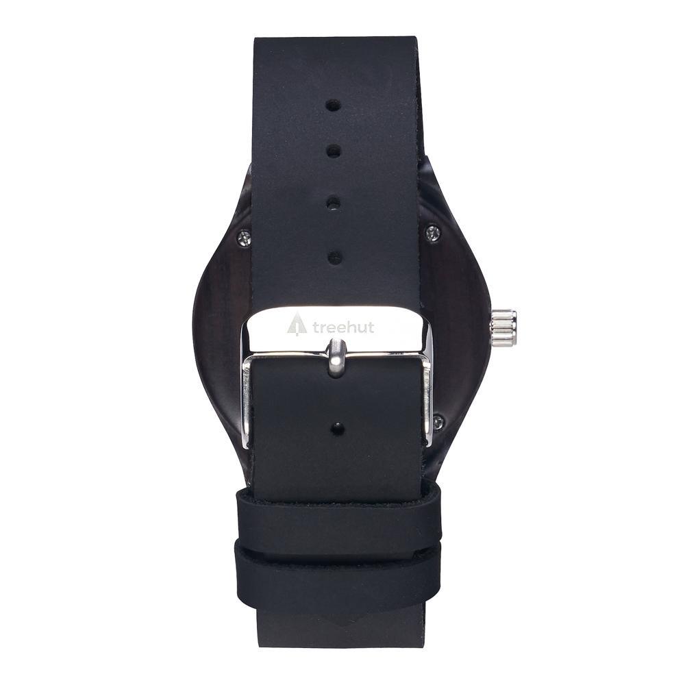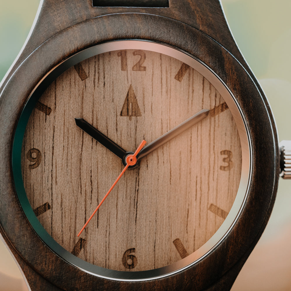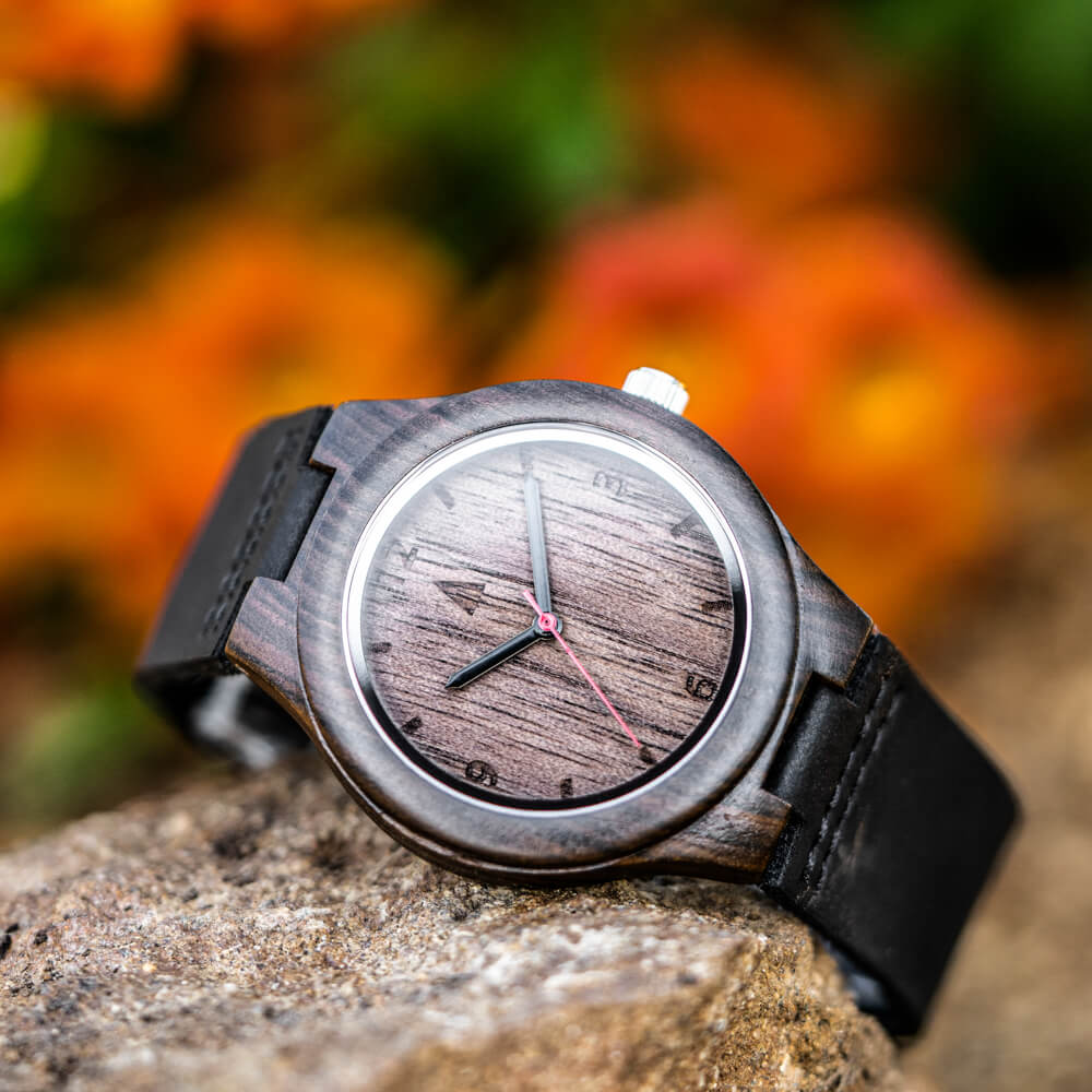 This all-wood timepiece features a 40mm ebony wood case and an American black walnut face, offering a tone-on-tone aesthetic that feels rich and grounded. A high-quality Japanese quartz movement keeps things running smoothly, while the black leather watch strap adds just the right contrast to the natural grain.
