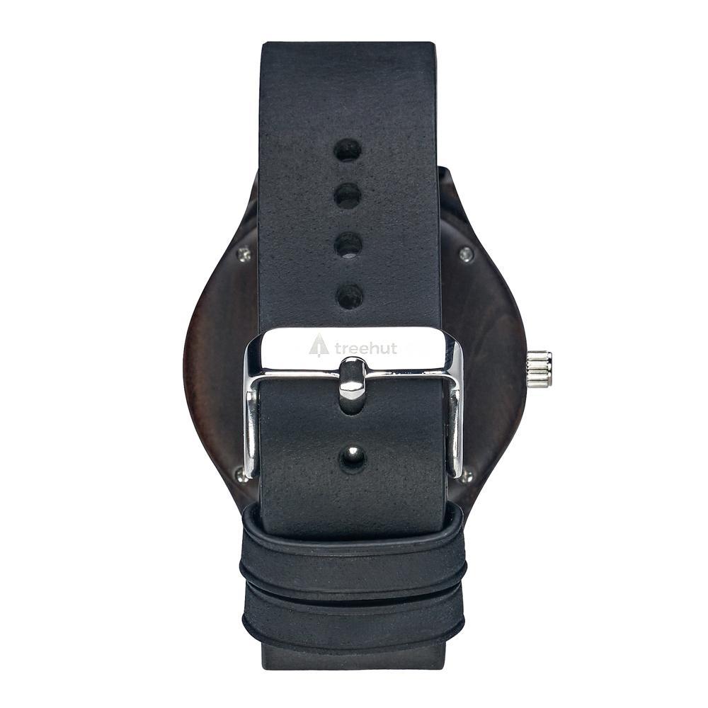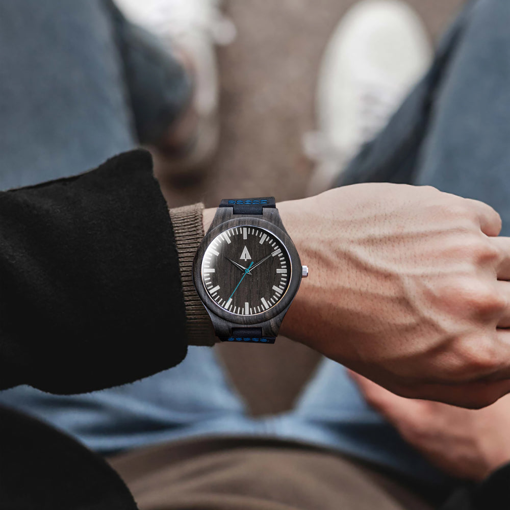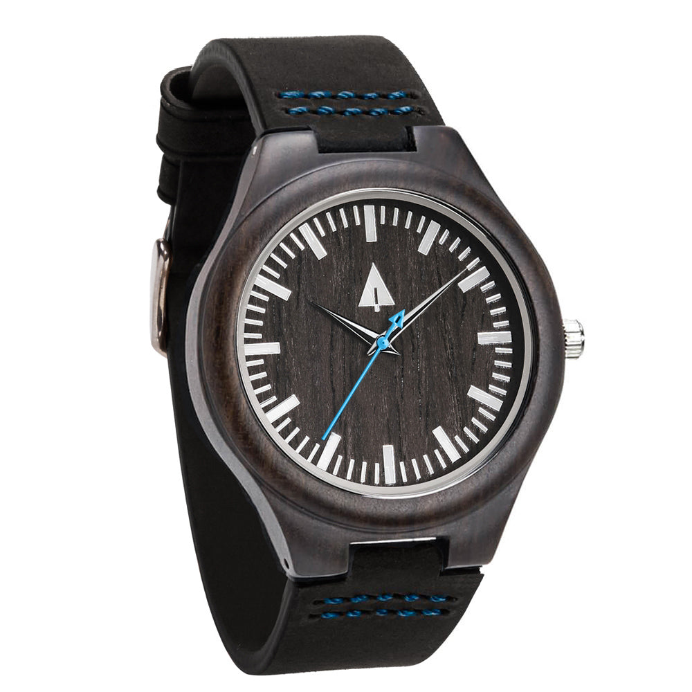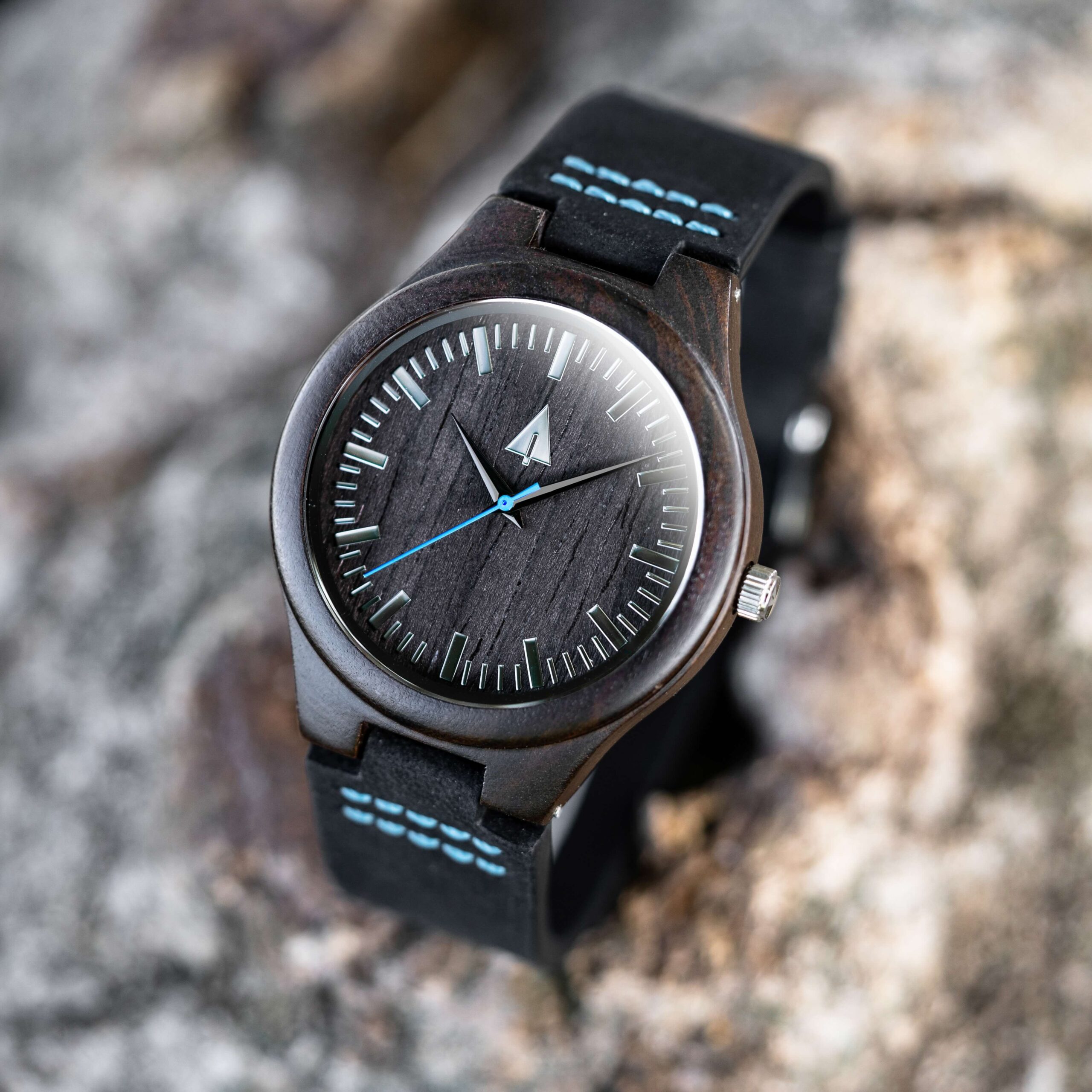The Classic Ebony Theo Blue Leather features a 45mm case and high-quality Japanese quartz movement. The dial is crafted from deep ebony wood, accented with a subtle blue seconds hand. A genuine leather strap adds durability and everyday comfort. This is a wooden watch for men who prefer refined details and rugged materials in one timeless piece. A favorite pick for those seeking a truly luxury wooden watch that connects them to nature – without losing a sense of edge.