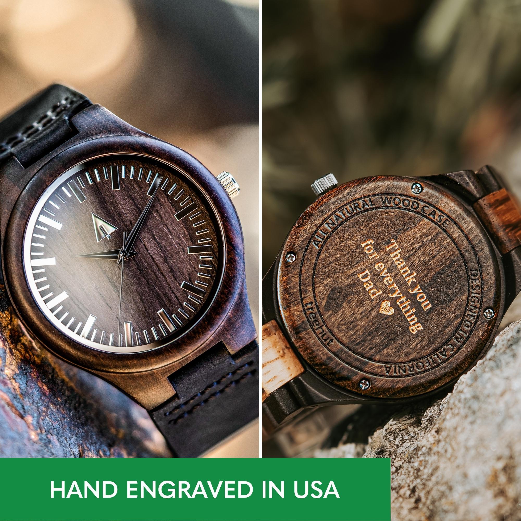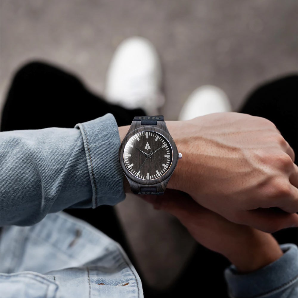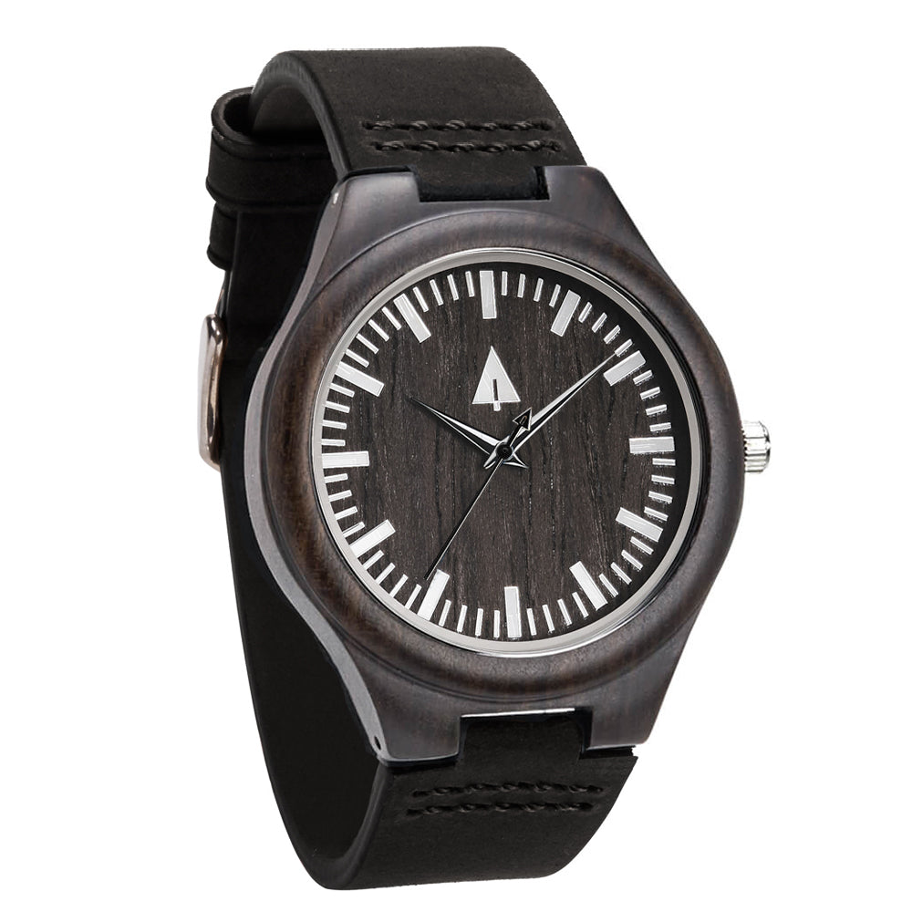The Classic Ebony Theo Monochrome Leather features a 45mm wooden case, minimalist dial, and a genuine leather strap. Powered by Japanese quartz movement, it’s a sleek option for those seeking versatility and ease. As a custom wooden watch, it stands out through subtle design. And like all true luxury wooden watches, it delivers quiet confidence with natural texture and craftsmanship. A standout in the world of men’s wooden watches, it’s built to go where you do.
