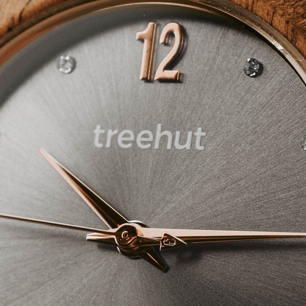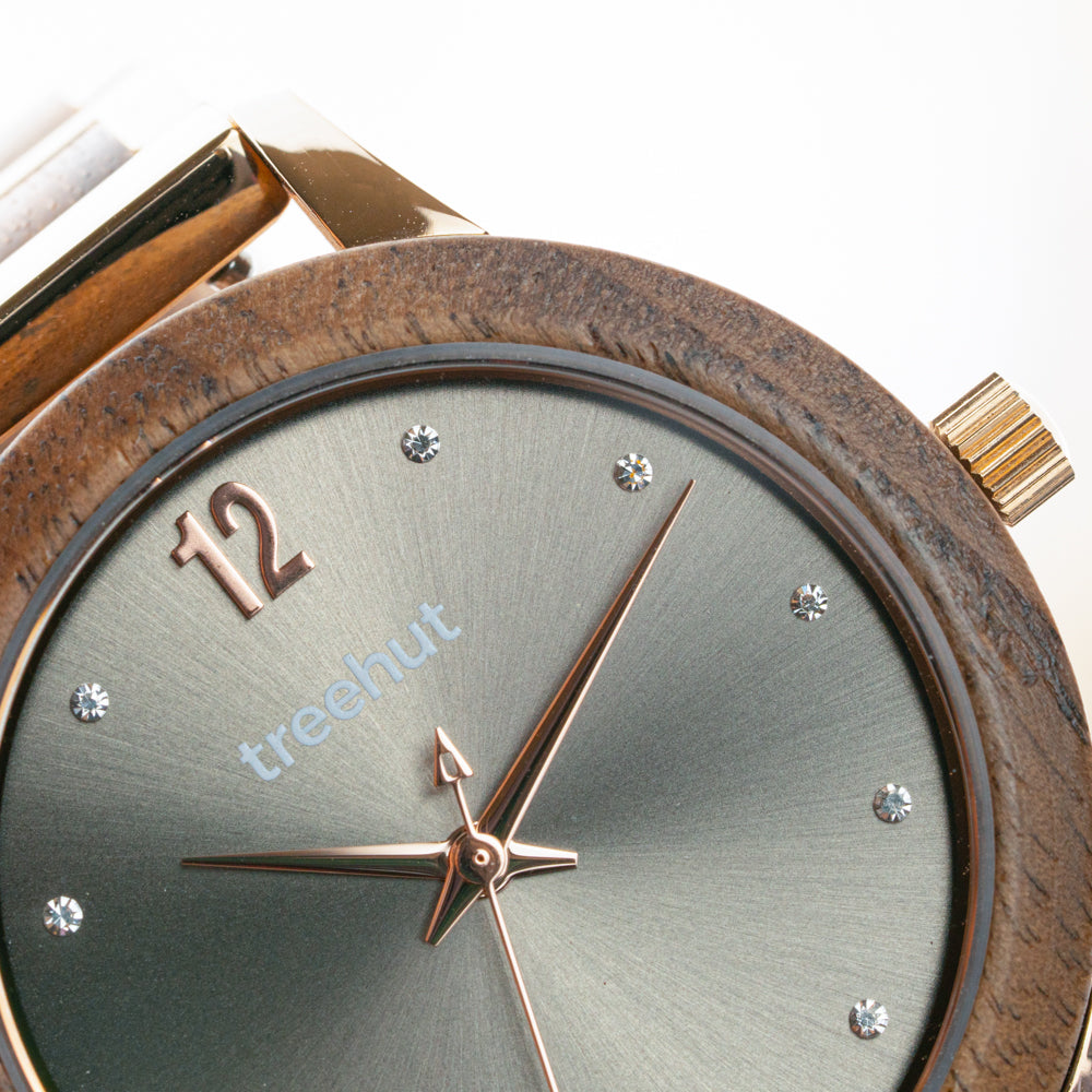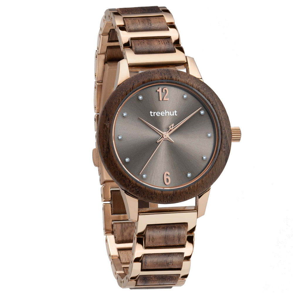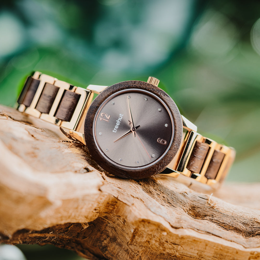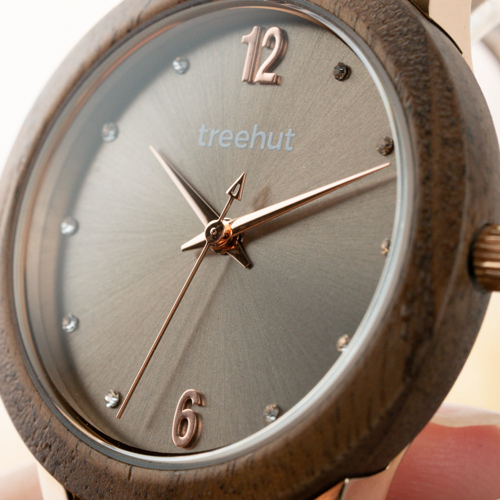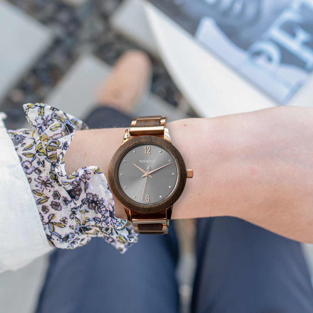 The Constance Walnut Rose Gold Watch for women that blends a touch of sparkle with the natural beauty of walnut wood. Its warm grey sunray dial features delicate crystal accents, adding just the right amount of shine without overdoing it.
