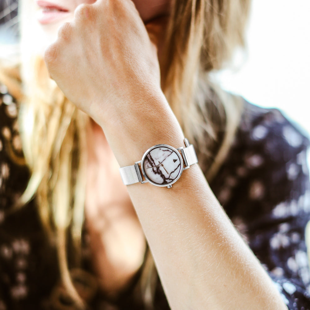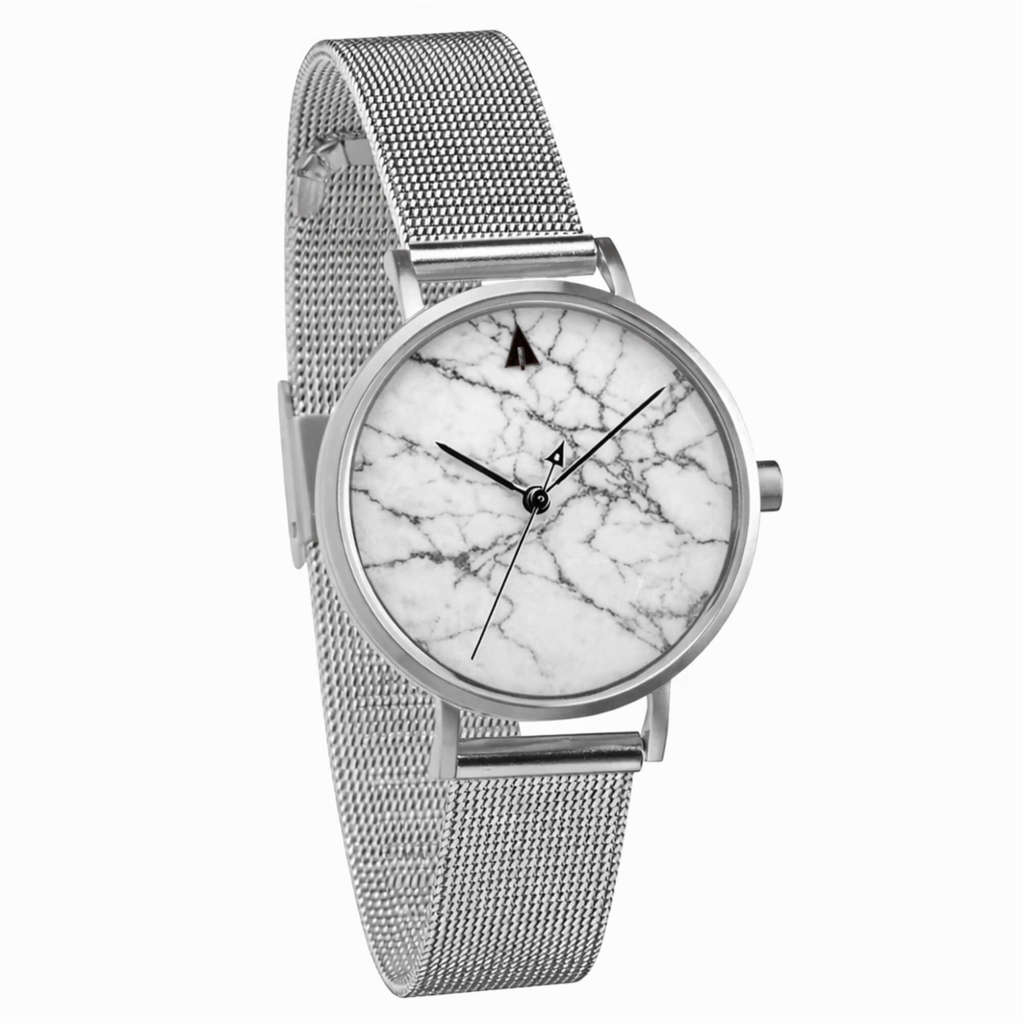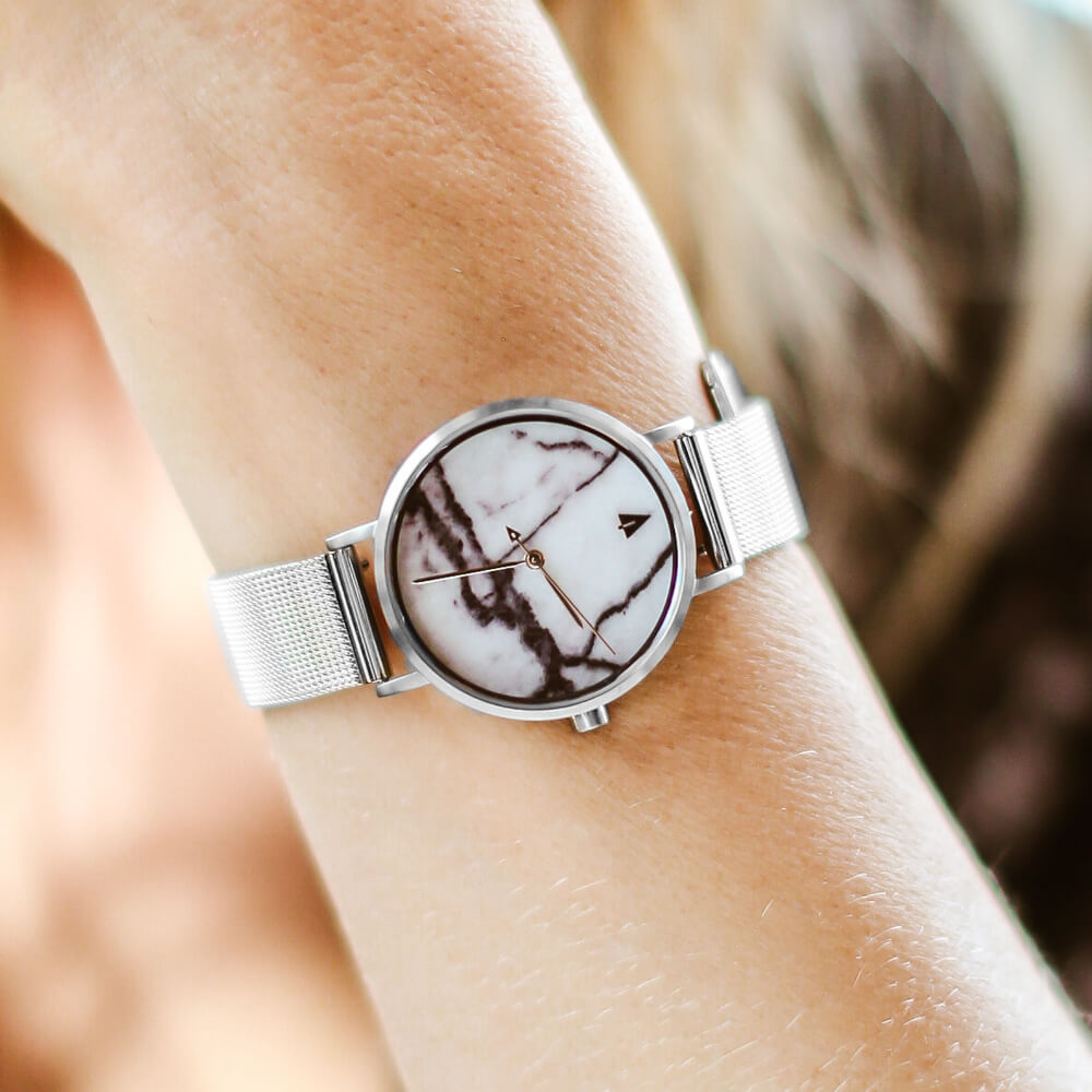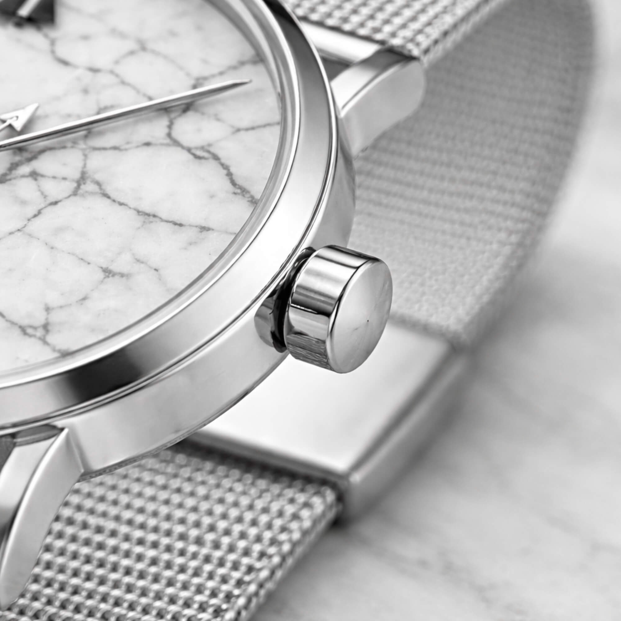 The Element White Marble Silver stands out among white dial watches with its naturally patterned stone face – soft whites layered with hints of grey and rose-toned veining. No two dials are the same, giving each piece a quiet kind of individuality. The silver stainless steel mesh strap adds a modern edge, balancing natural texture with polished design.