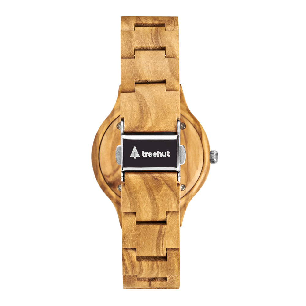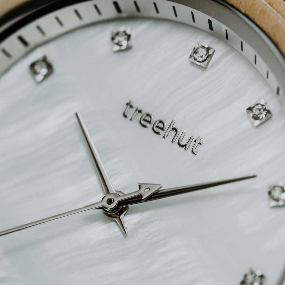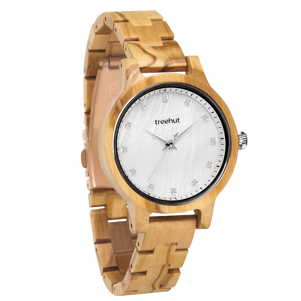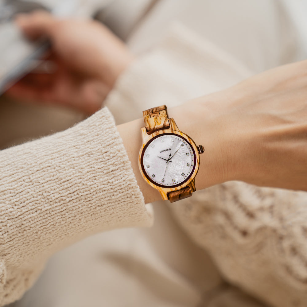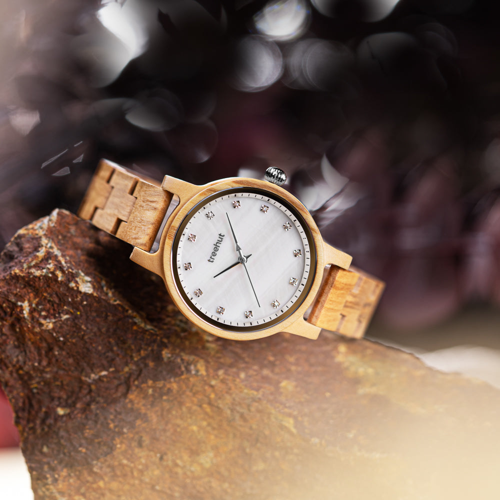 Crafted from patterned olive wood, the Emma Pearl Olive Frost brings a calm, natural warmth to the wrist. Its white mother-of-pearl dial shifts with the light – subtle one moment, striking the next. Diamond-accented markers give the design just enough detail without pulling focus. As part of our collection of wooden watches for women, this piece stands out for its quiet character.