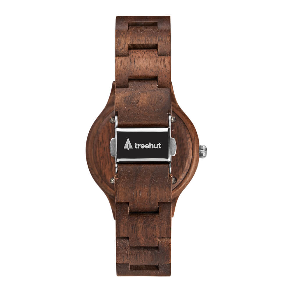 Gracefully framed in rich chocolate walnut, the natural wood case and band offer warmth and minimalism in perfect balance. As one of our signature women’s wooden watches, it embodies quiet luxury with a story etched into every detail. It’s one of our most popular engraved watches that carries your personal touch with every glance.