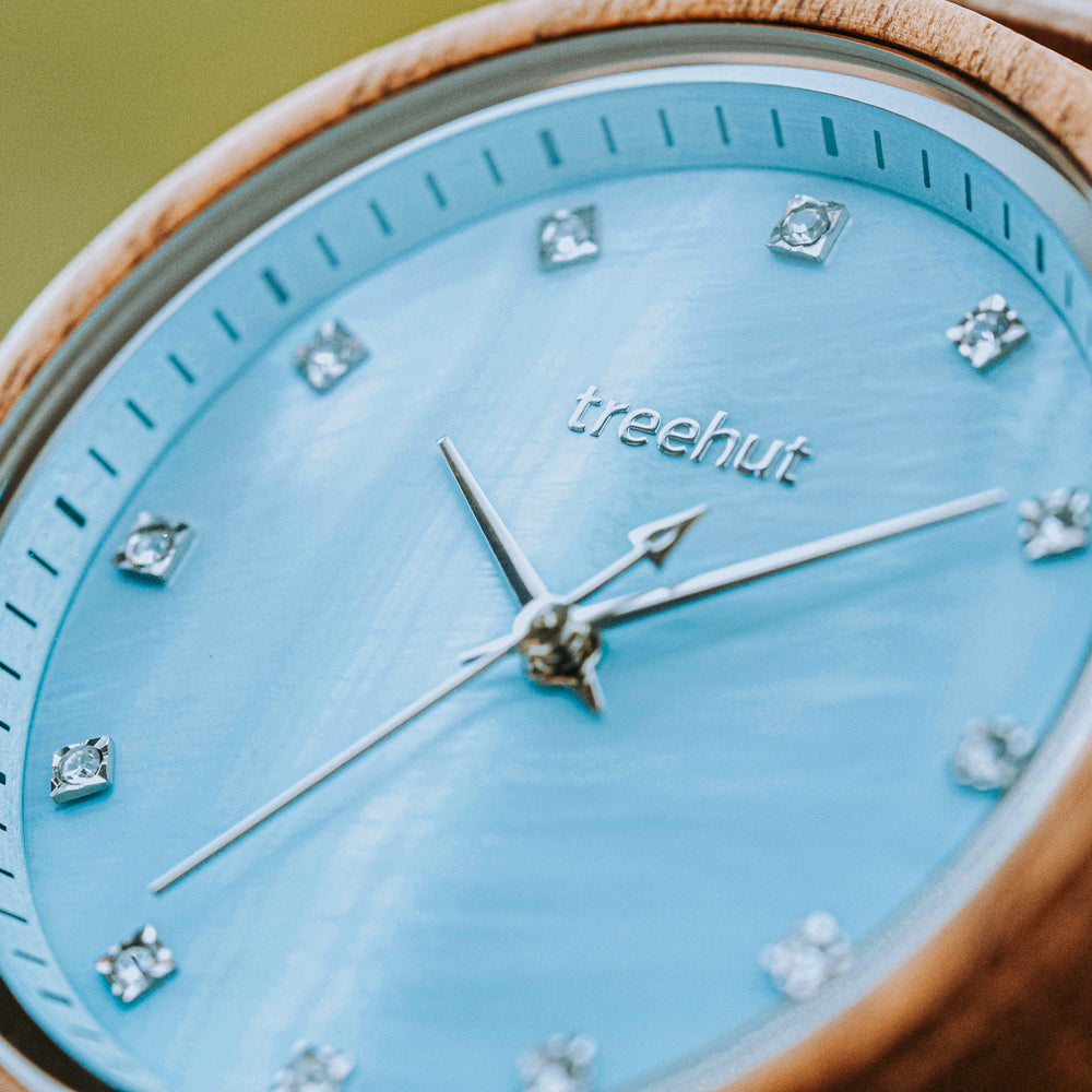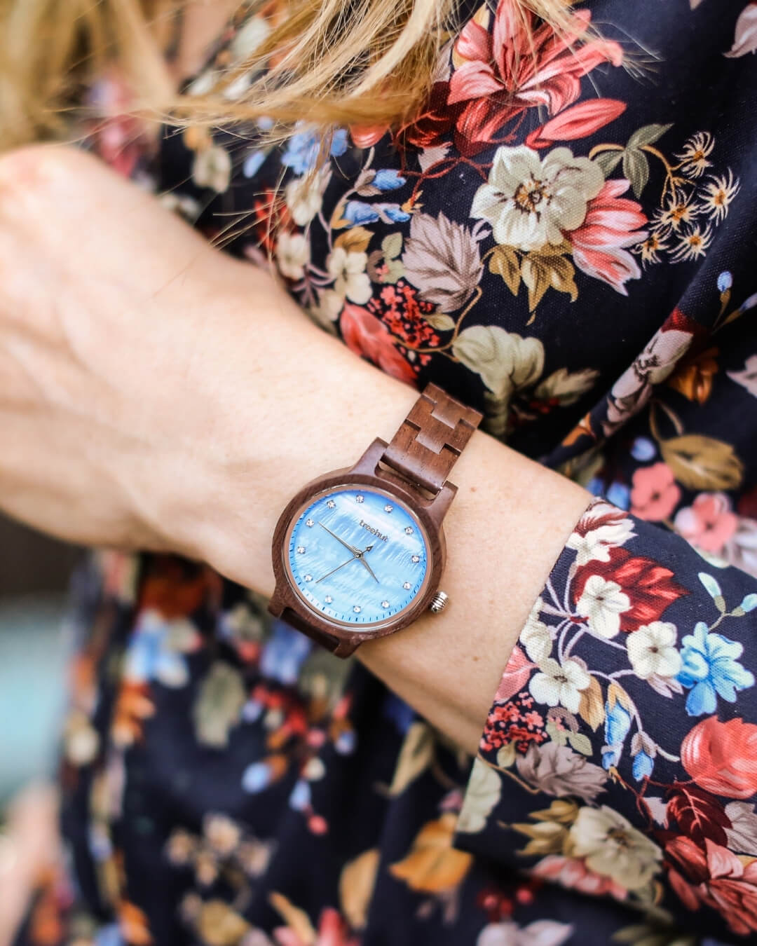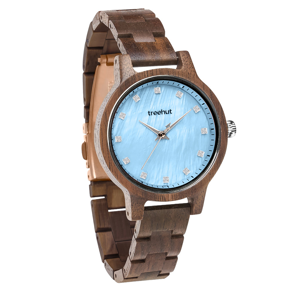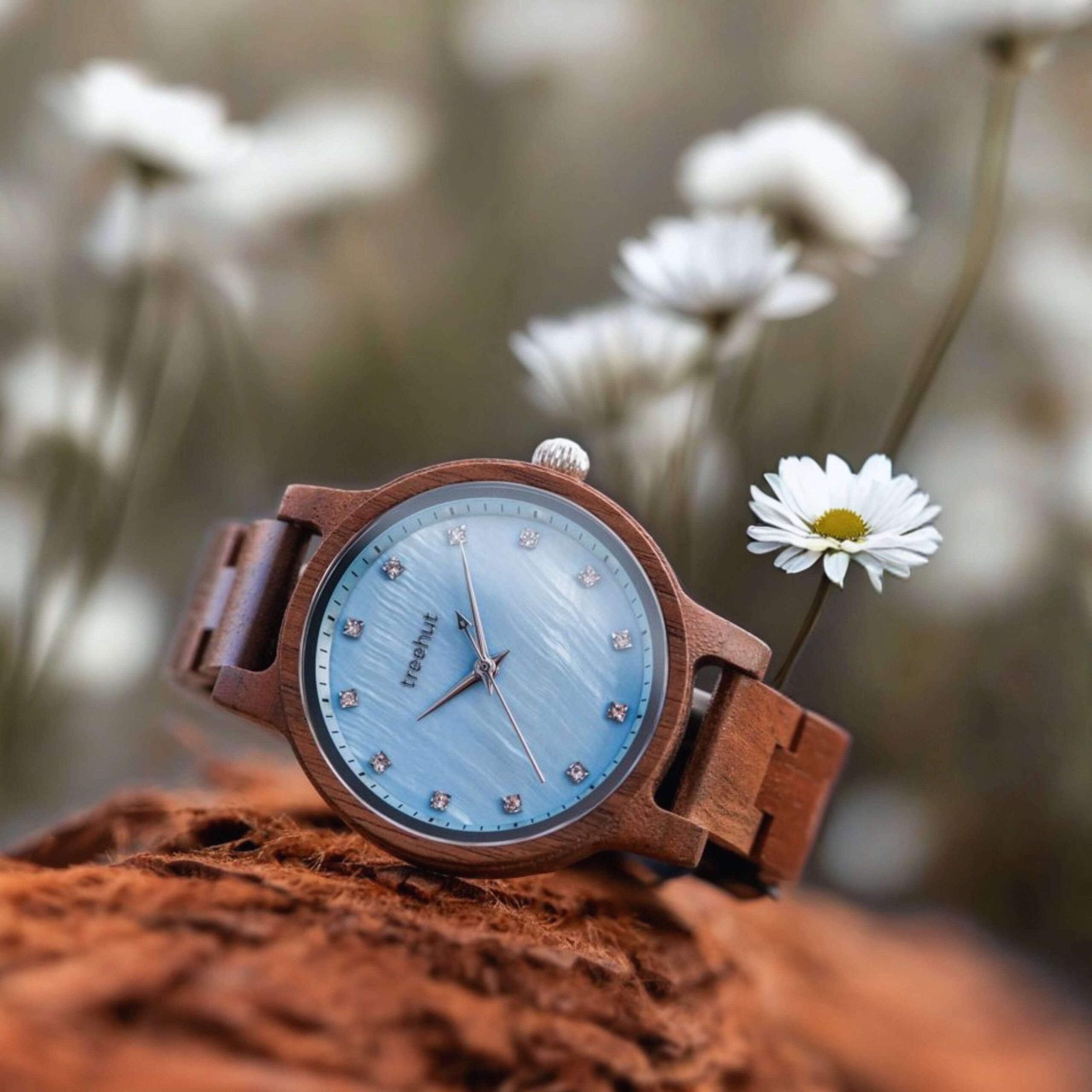 Emma Pearl Walnut Sky is more than a timepiece – it’s a moment captured in nature. This stunning example of engraved watches pairs a dreamy, iridescent blue mother-of-pearl dial with delicate white diamond numerals. Each dial is one-of-a-kind, shifting beautifully in changing light like the sky at dusk.