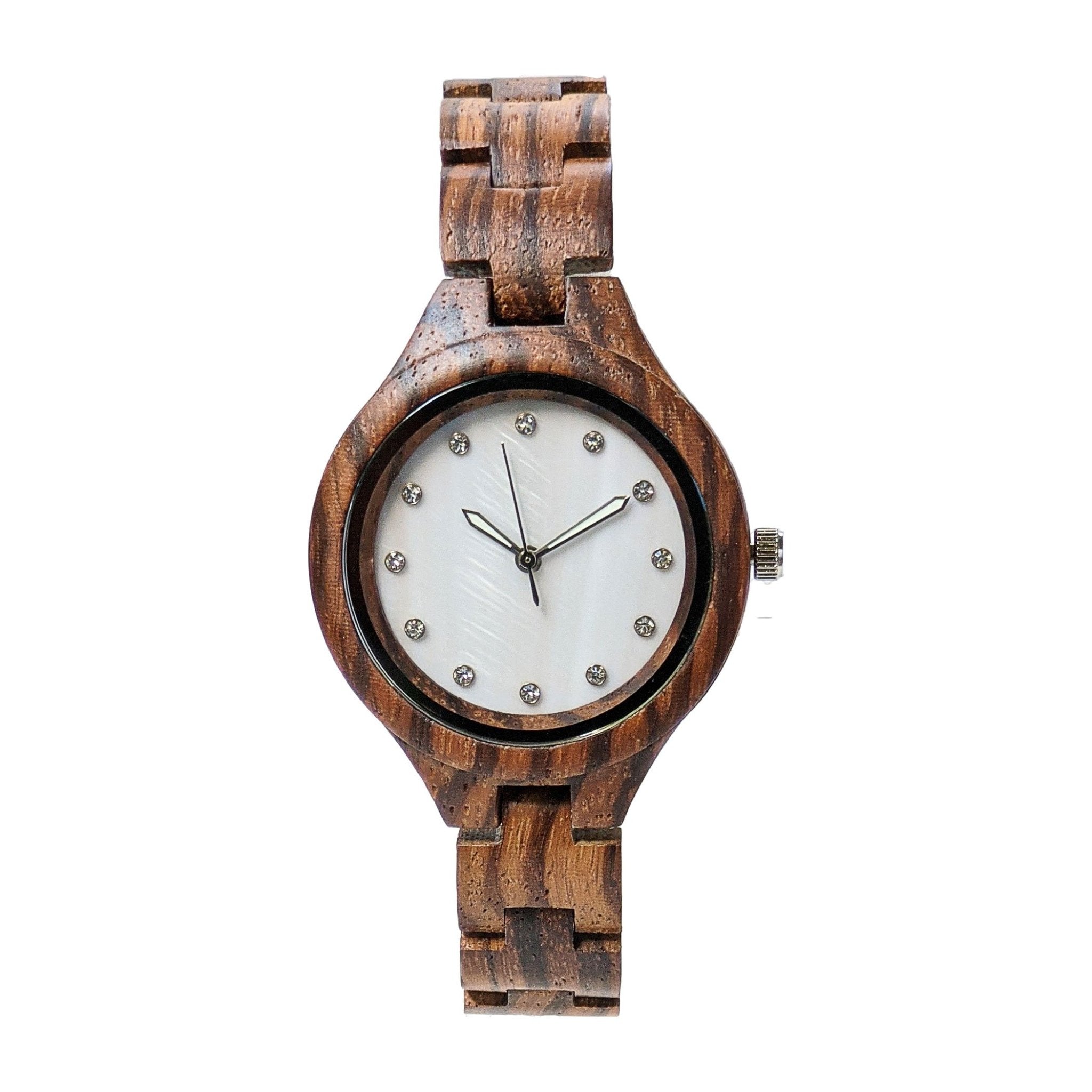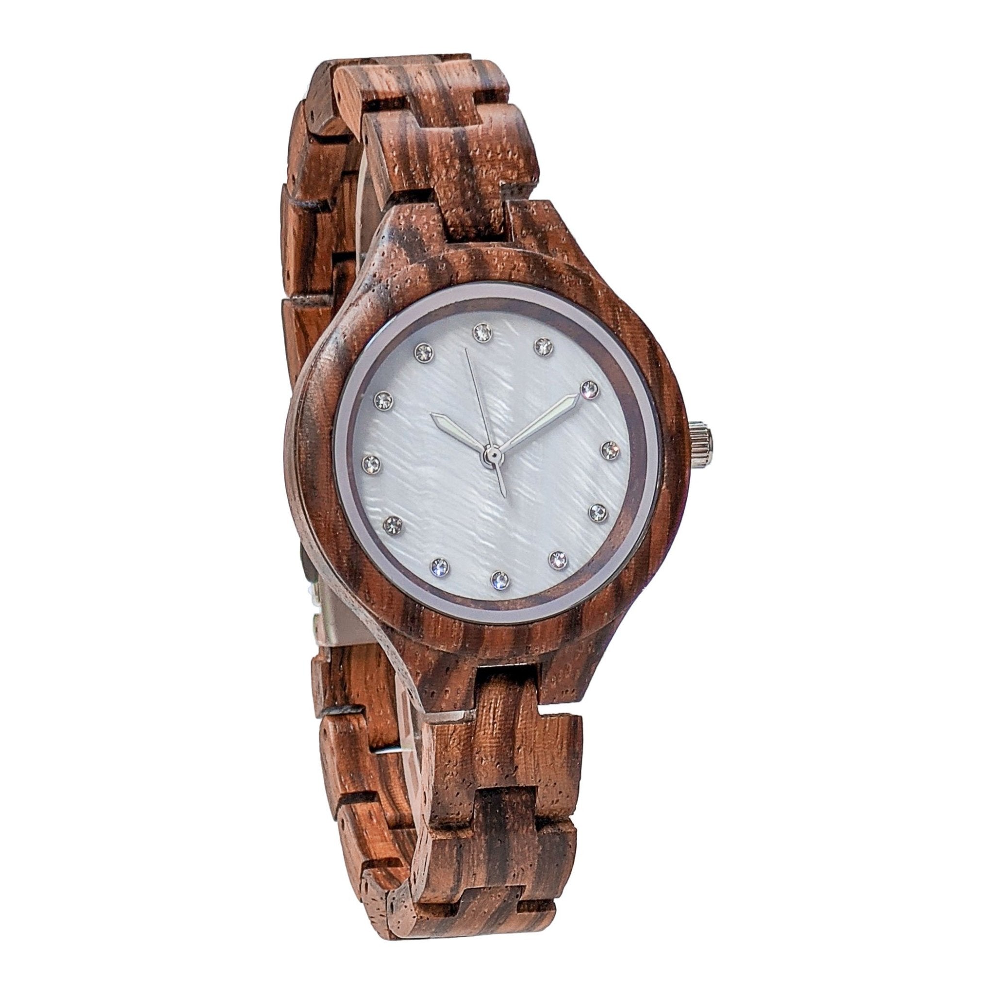 This stunning women’s wood watch features a pearl dial that is dotted with crystal hour markers. It is the perfect watch for that glamorous look which transcends the time stamp. This timepiece speaks to females who possess exquisite taste. The sleek design coupled with luminous hands will certainly draw attention to this gorgeous wooden watch.