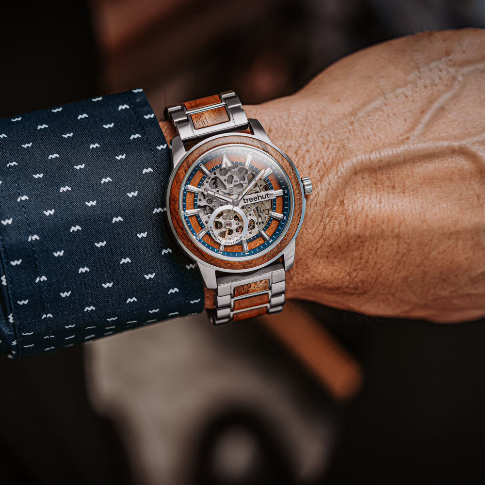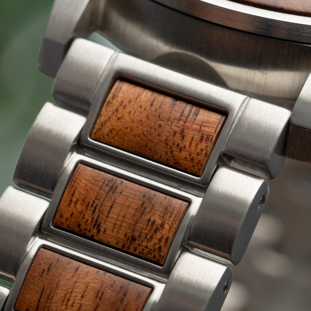 This model features a silver stainless steel case with handcrafted koa wood inlays – both around the case and integrated into the open dial. Its hour markers rest on koa wood and glow with Swiss Super-LumiNova® for visibility in any light. If you’re searching for a luxury automatic watch that pairs precision with personality, this one delivers with quiet impact.