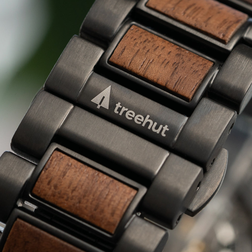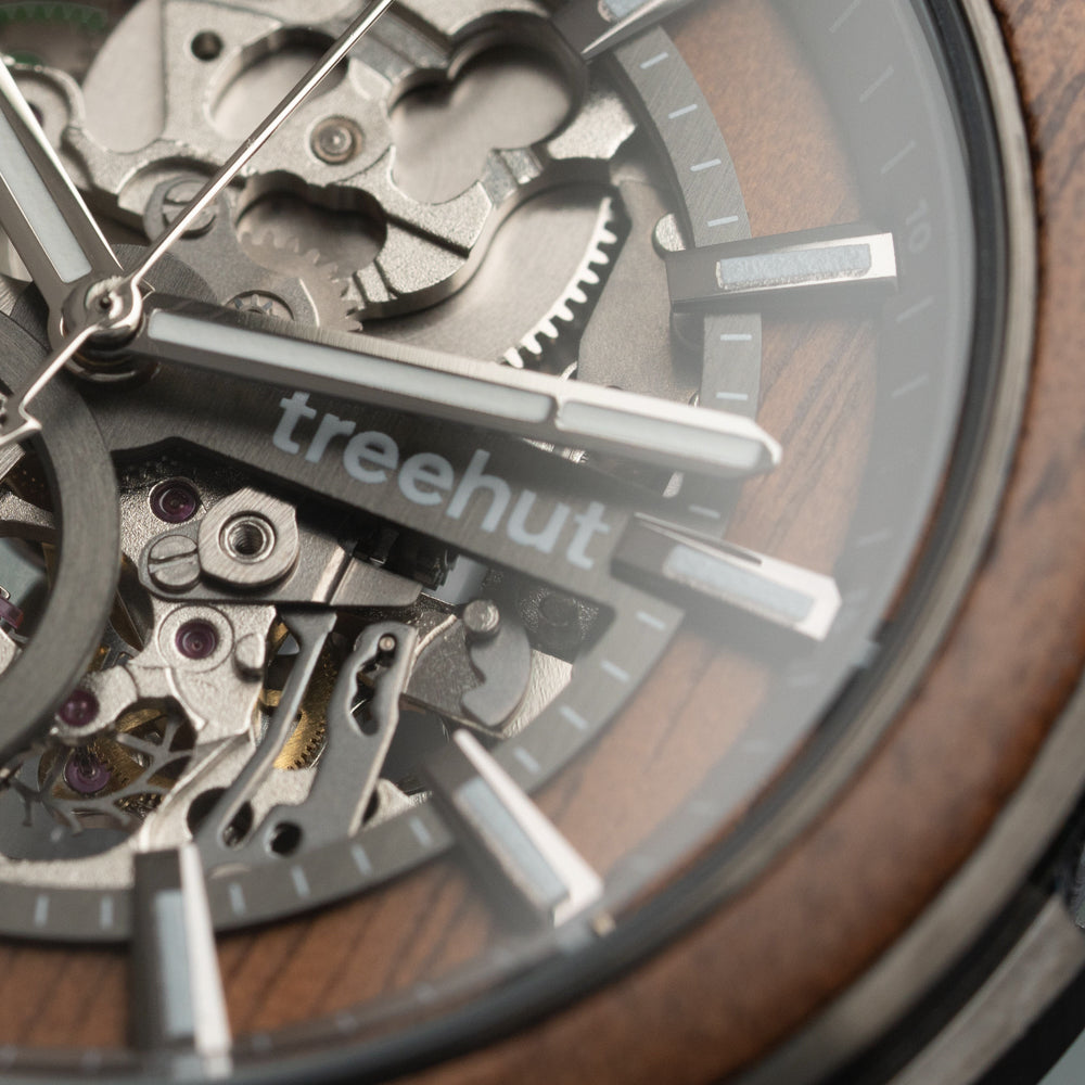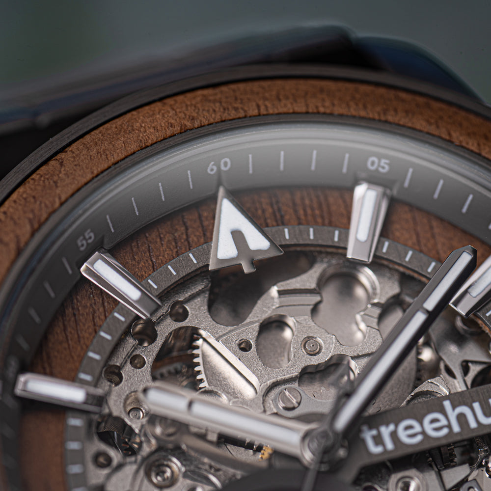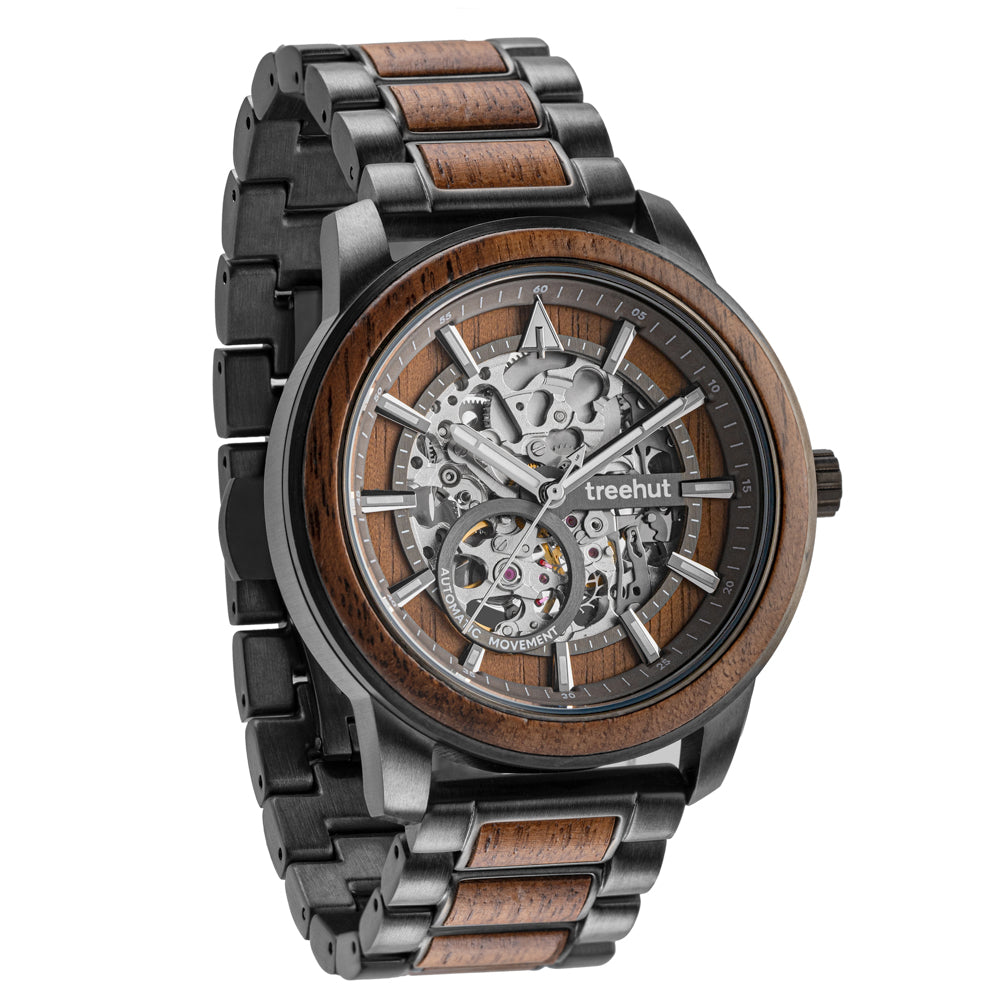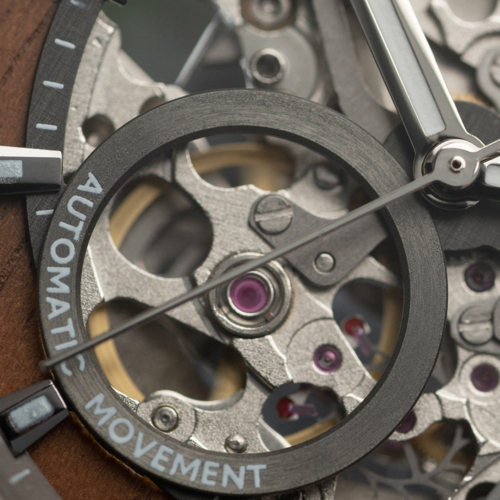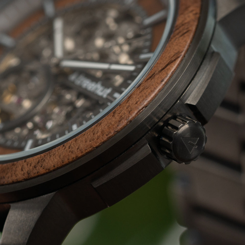 The Immortal Walnut Automatic watch showcases a gunmetal stainless steel case accented by a handcrafted walnut wood inlay, both on the bezel and within the open dial. Its smooth sweeping second hand and walnut wood hour indices glow with Swiss Super-LumiNova®, keeping you on time from day to night. A nature-inspired precision piece, it’s the best automatic watch for the man who appreciates timeless craftsmanship and bold individuality.