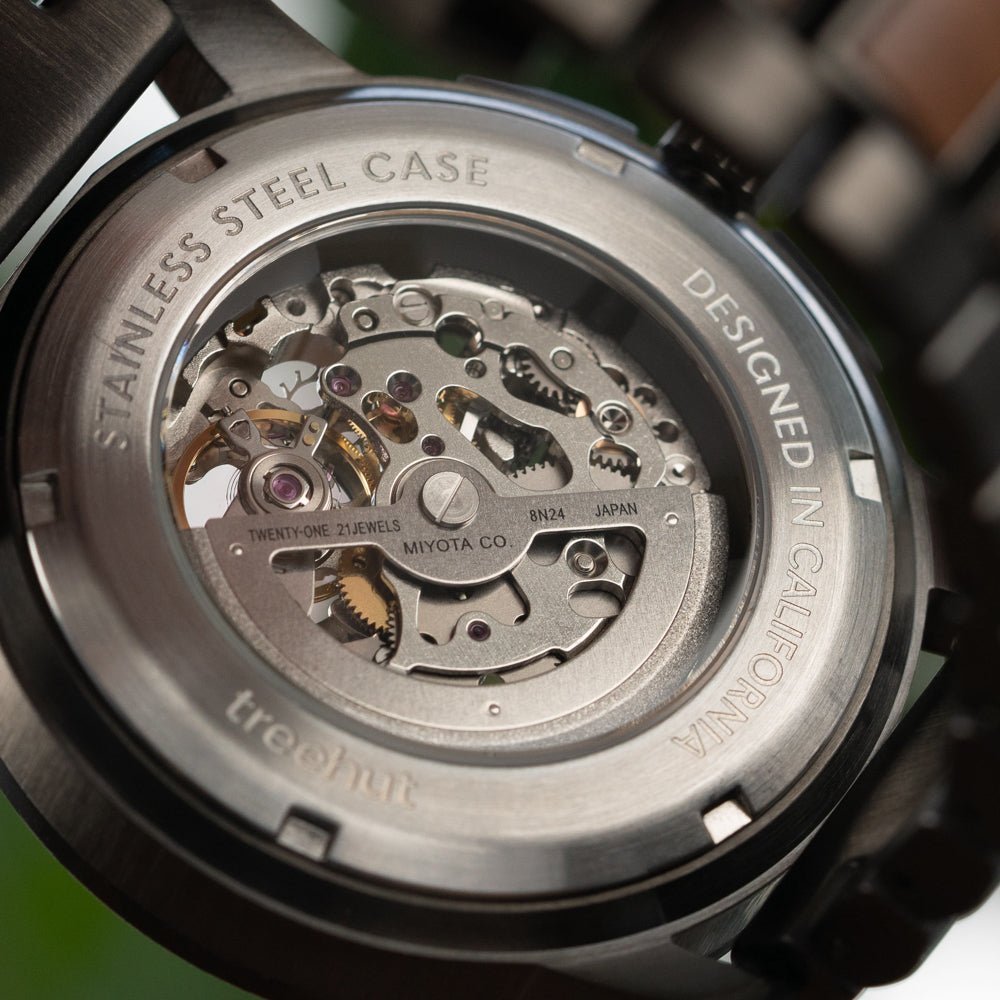The Immortal Automatic Collection is equipped with a perpetually powered Miyota 8N24 21-jewel automatic movement. Each automatic watch for men features an exhibition case back that reveals the skeletonized movement with a 42-hour power reserve – inviting you to witness the quiet, powerful rhythm of time itself.