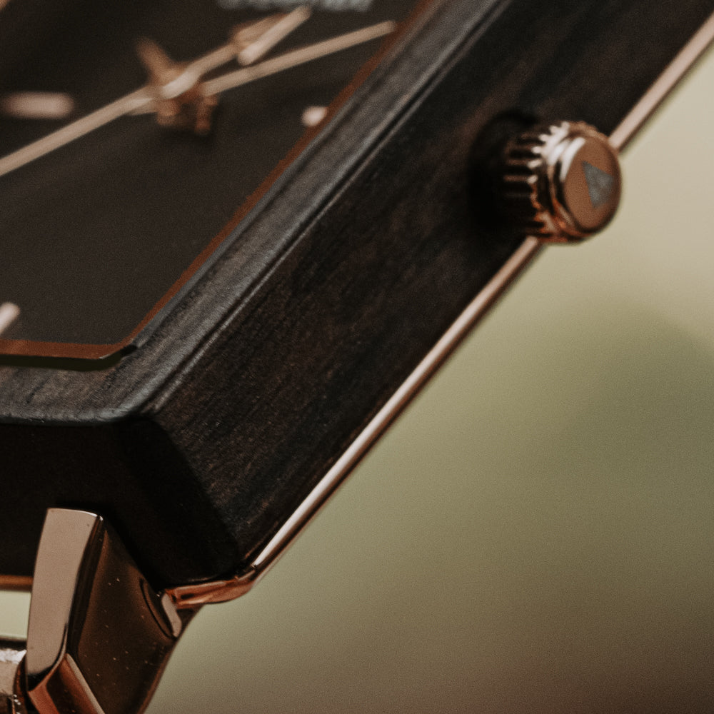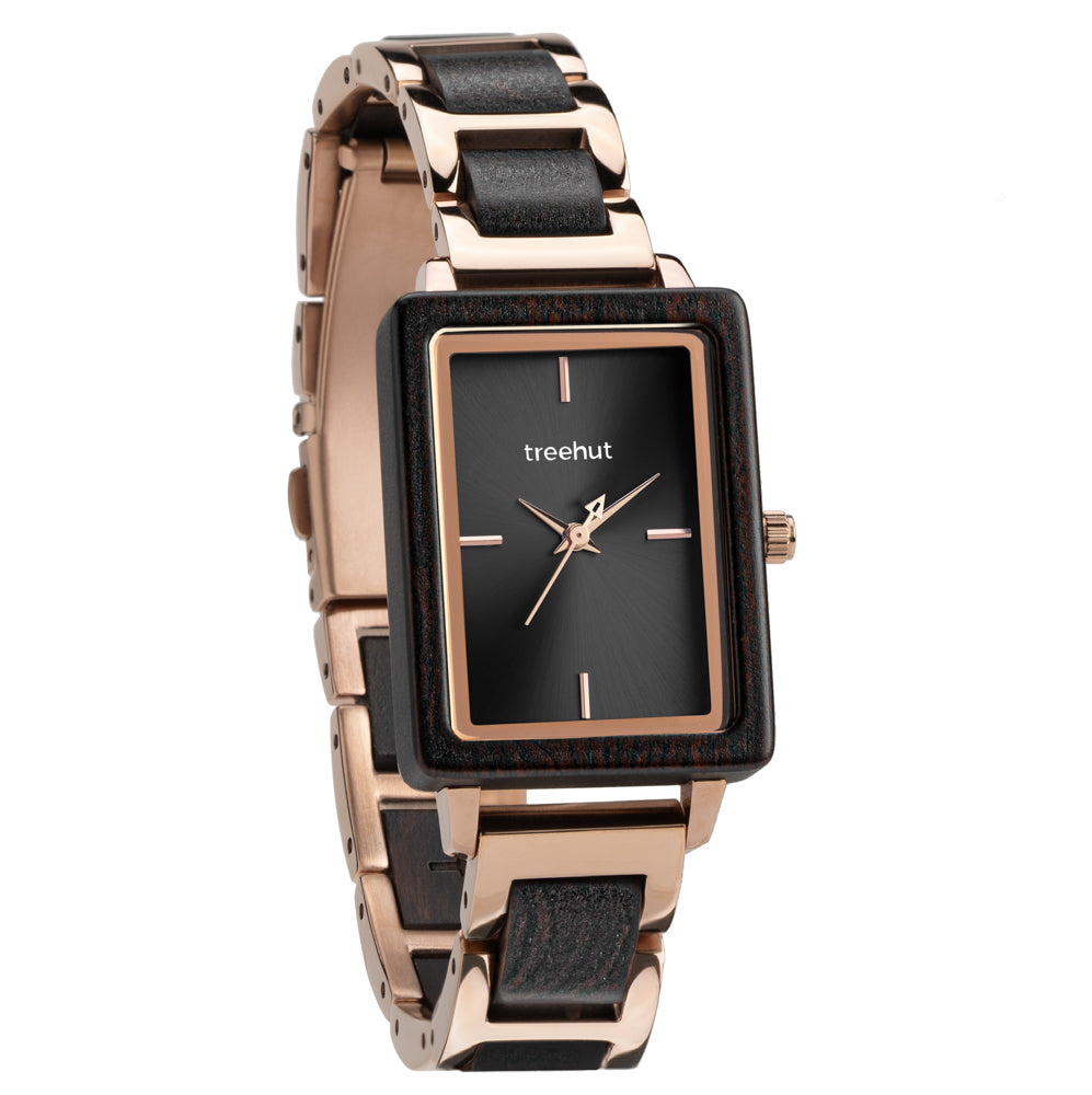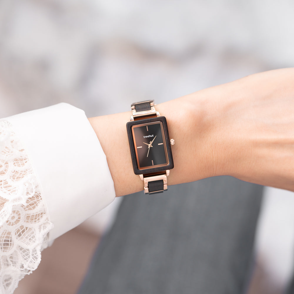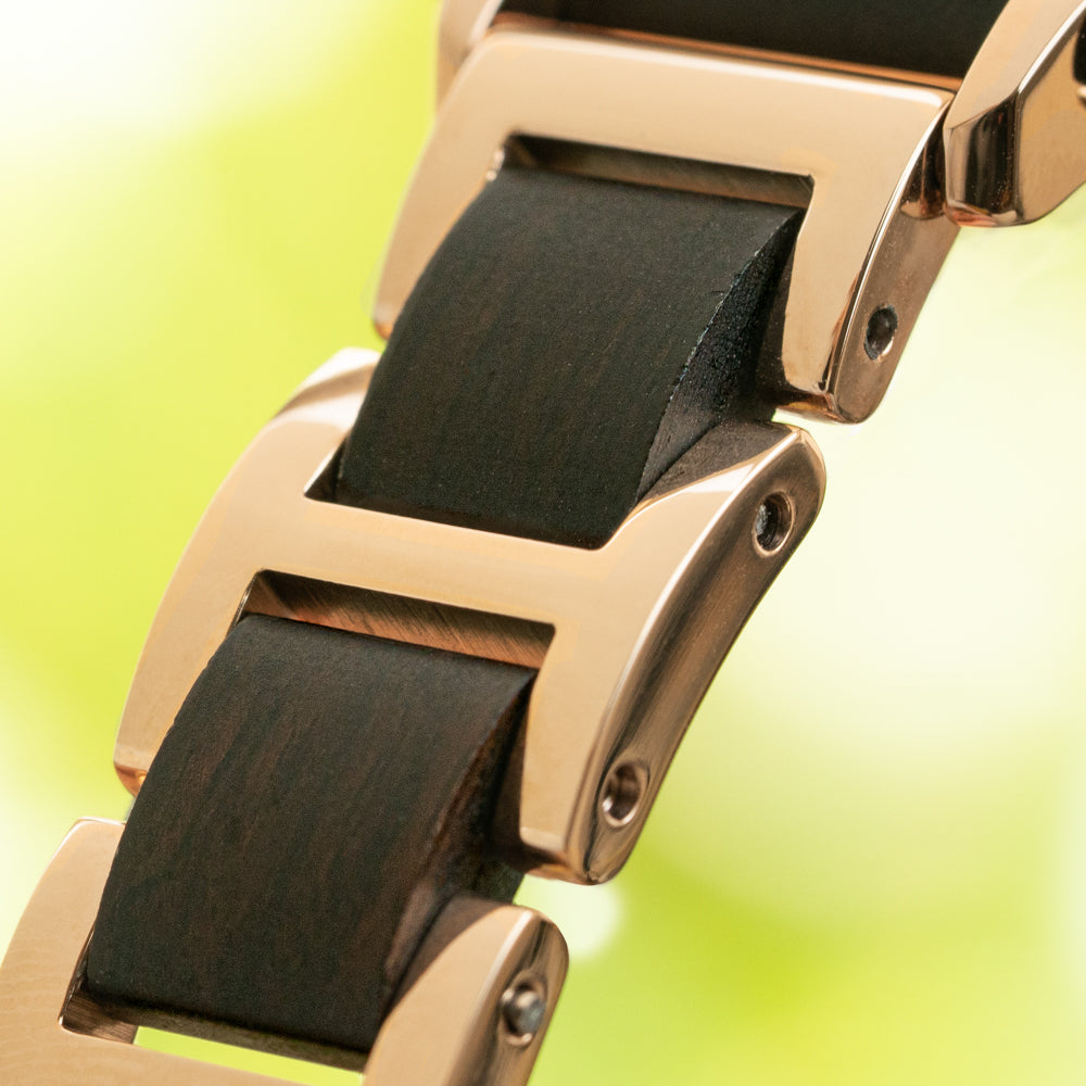 This Lola balances contrast beautifully: dark wood softens the shine of polished steel, and the shape feels both minimal and expressive. For anyone seeking rose gold watches for women that go beyond the obvious, this is a thoughtful choice. The look is clean, the mood is grounded, and the details are refreshingly unexpected.