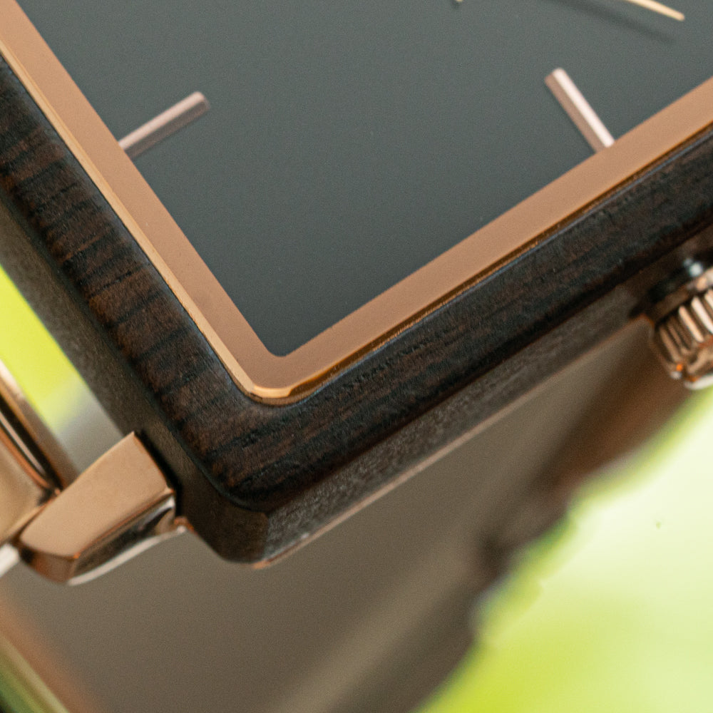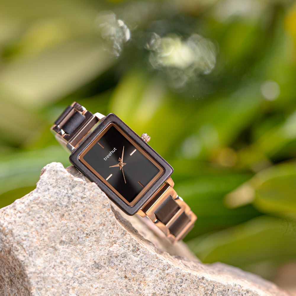 Venture out of the usual round case and try the Lola Ebony Rose Gold – its slim, rectangular shape adds a modern edge without losing elegance. This design-forward piece stands out among rose gold watches for women, thanks to its unexpected pairing of warm rose gold and rich ebony wood. The black, number-free dial keeps things sleek, letting the materials speak for themselves.