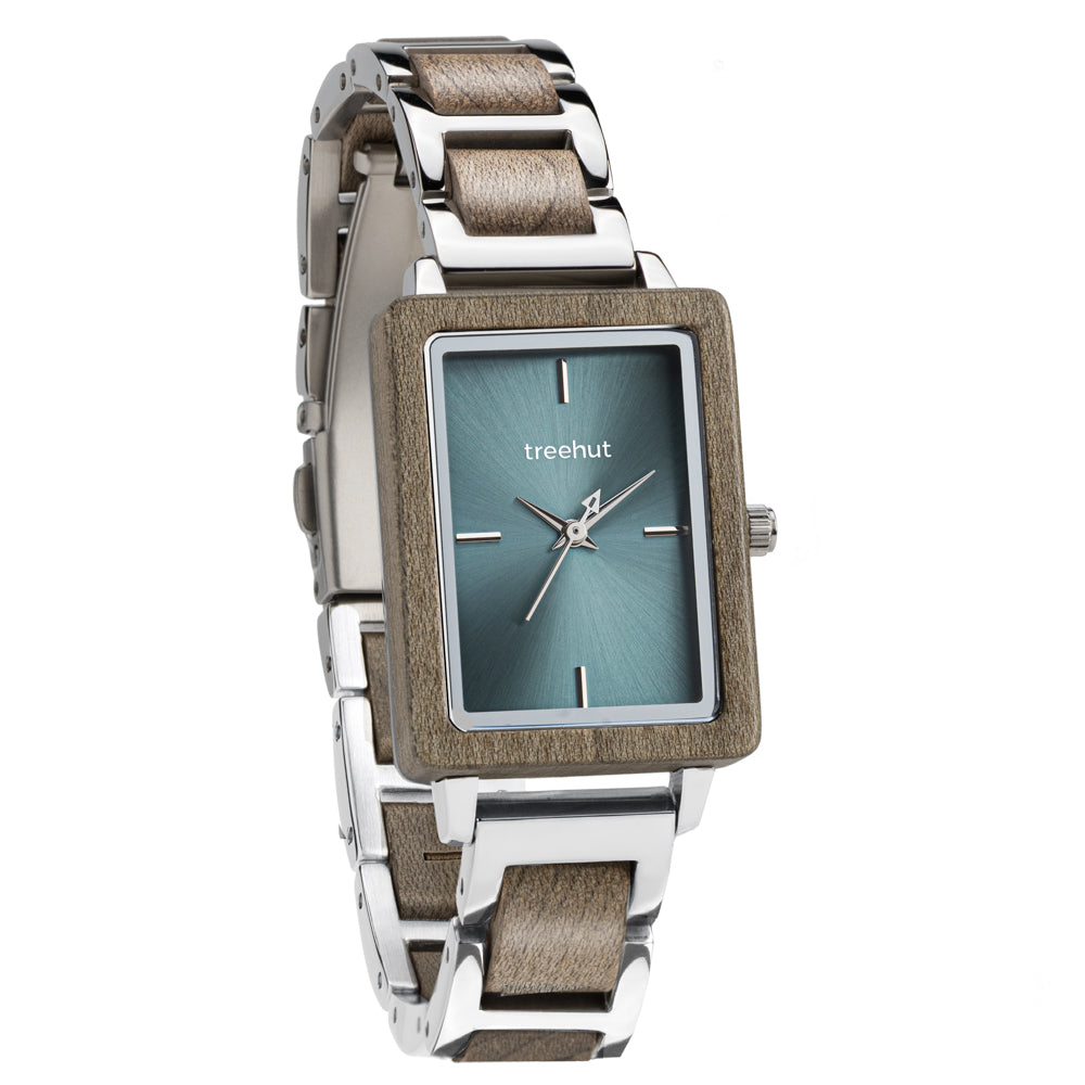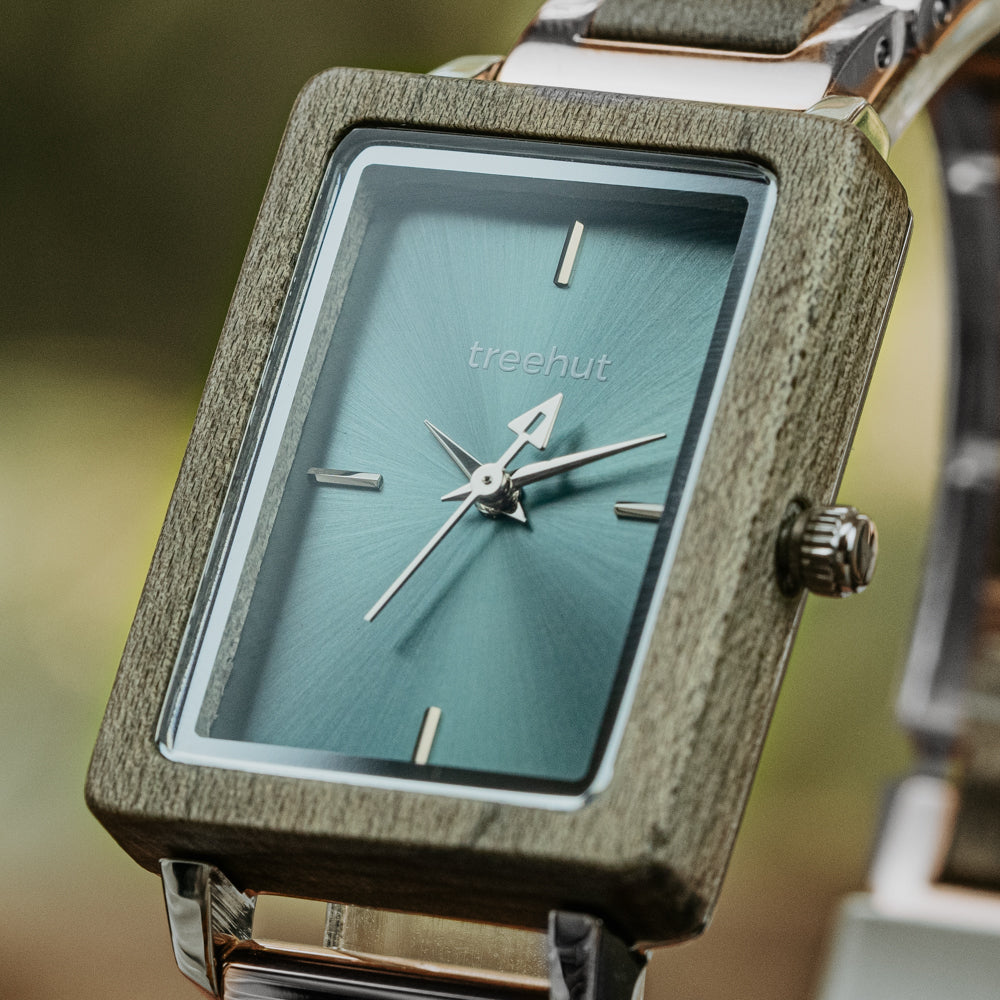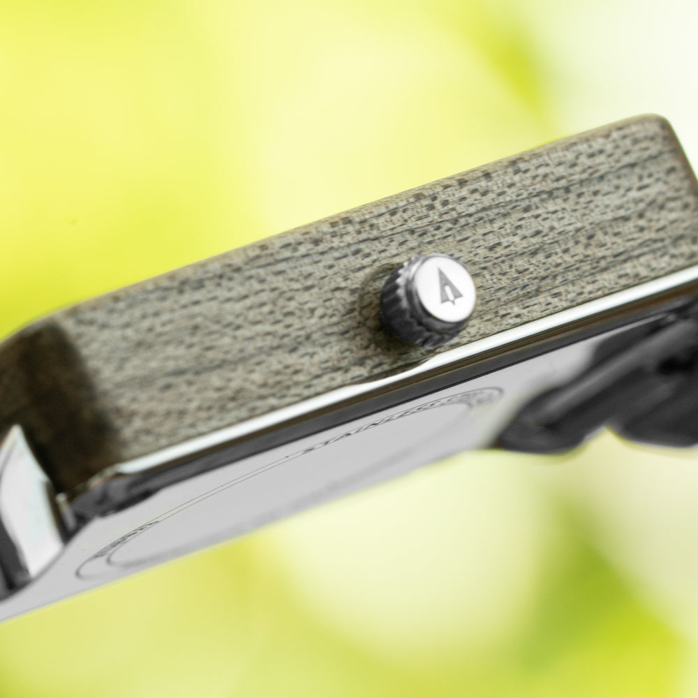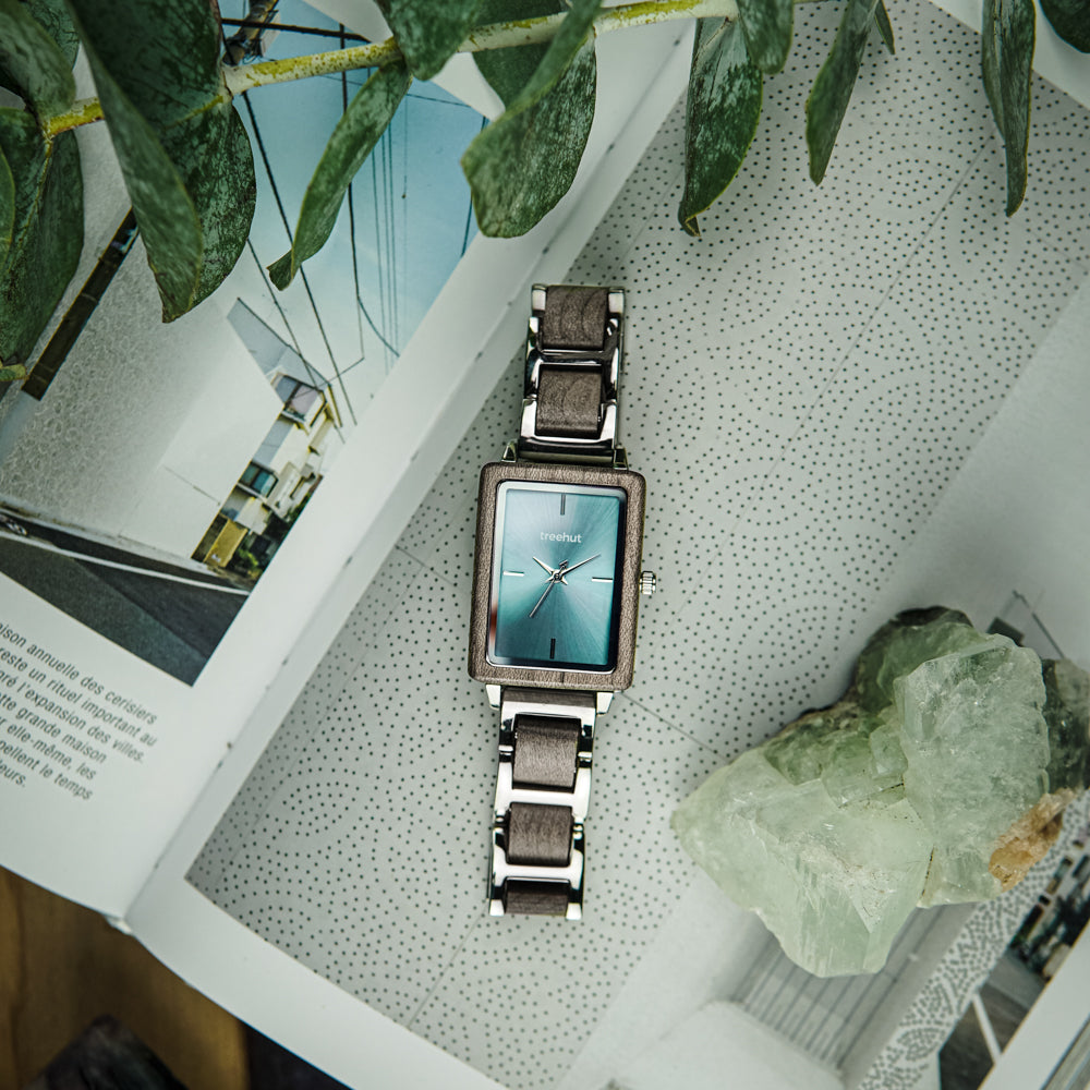 Venture beyond the ordinary round case with the Lola – a refreshing twist on wooden watches for women featuring a delicate, rectangular silhouette. The Lola Silver Maple Blue blends vintage elegance and modern minimalism, pairing a light blue number-free dial with a silver stainless steel band and grey maple wood onlays.