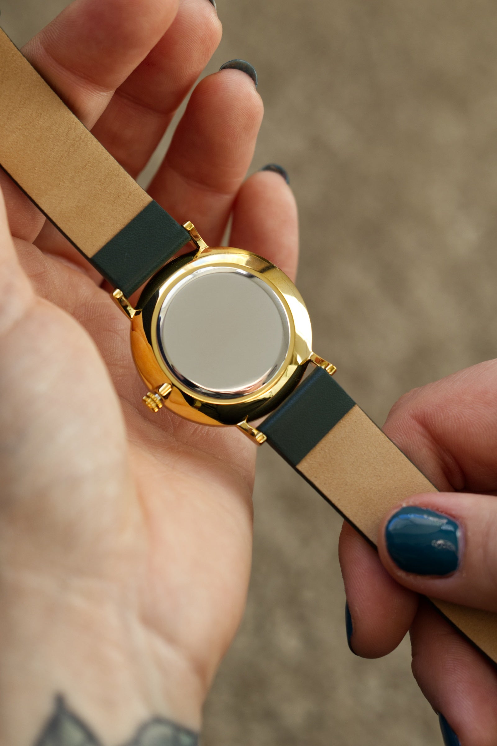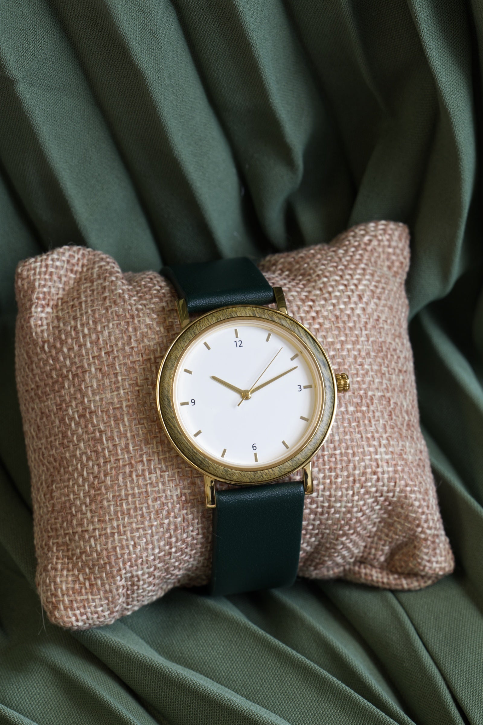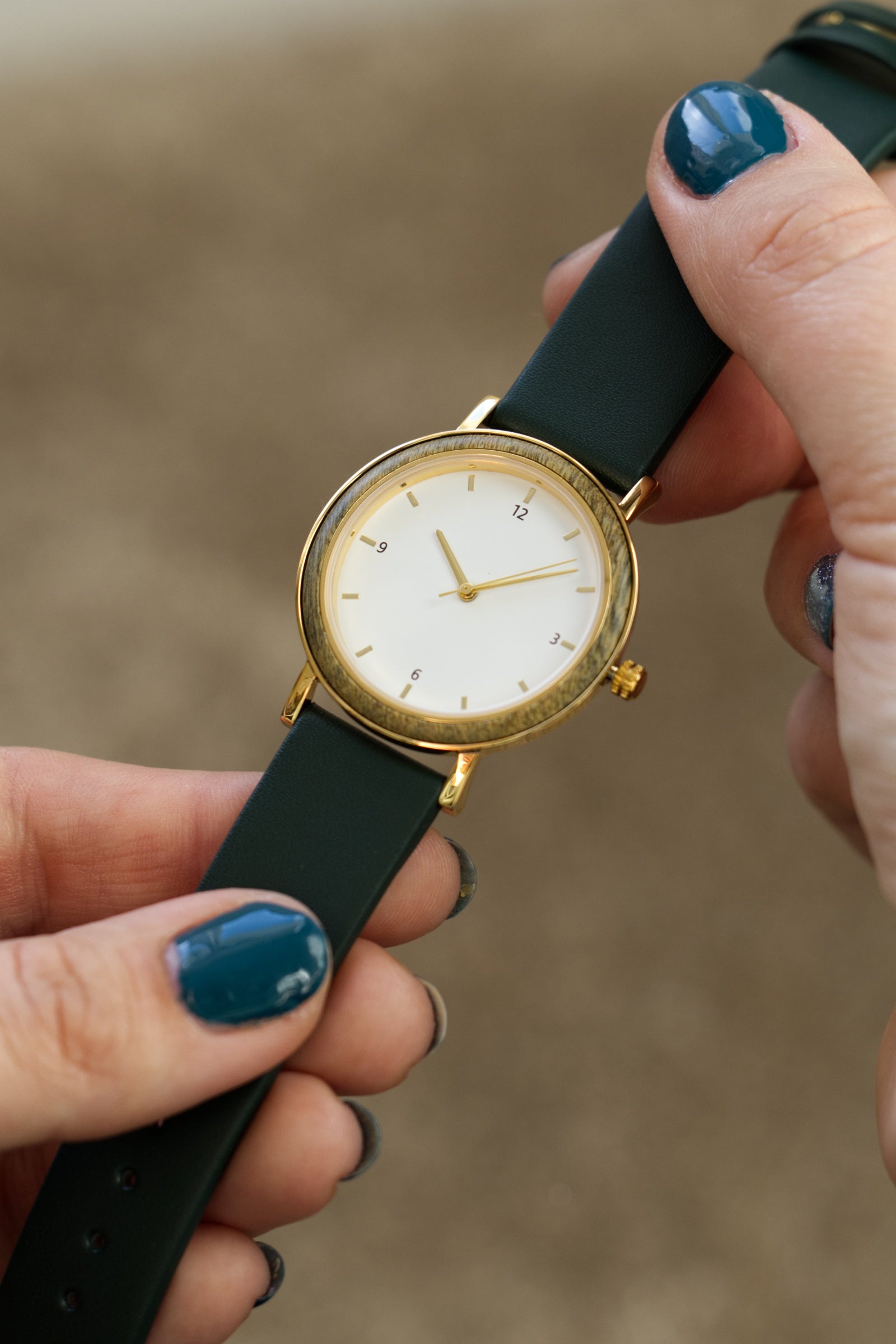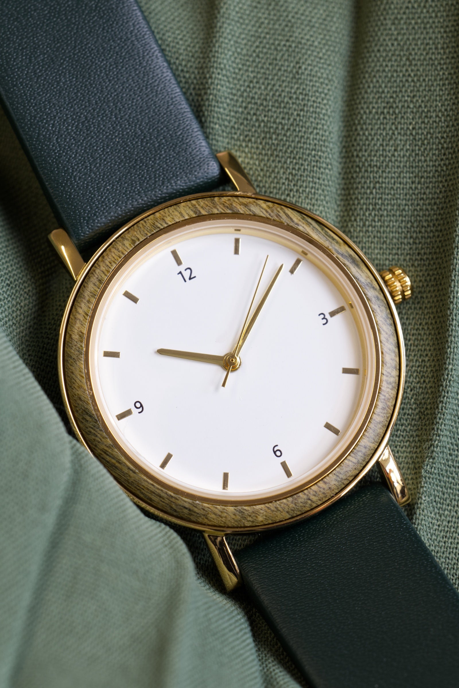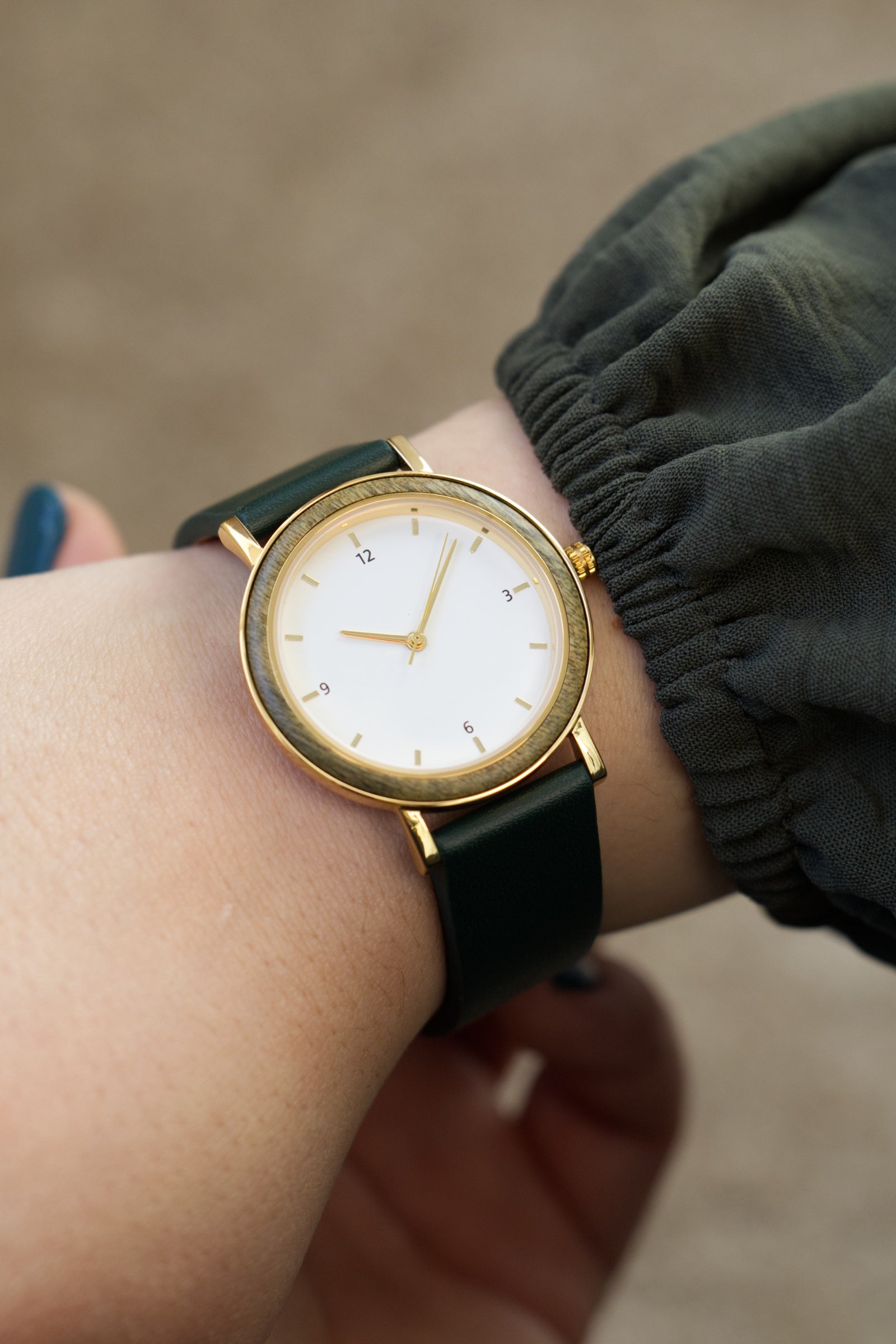 Inspired by the serene beauty of Switzerland’s Lucerne, this watch features a wood-inset dial with a crisp white background and a green faux leather strap. Its timeless simplicity makes it a versatile everyday accessory.