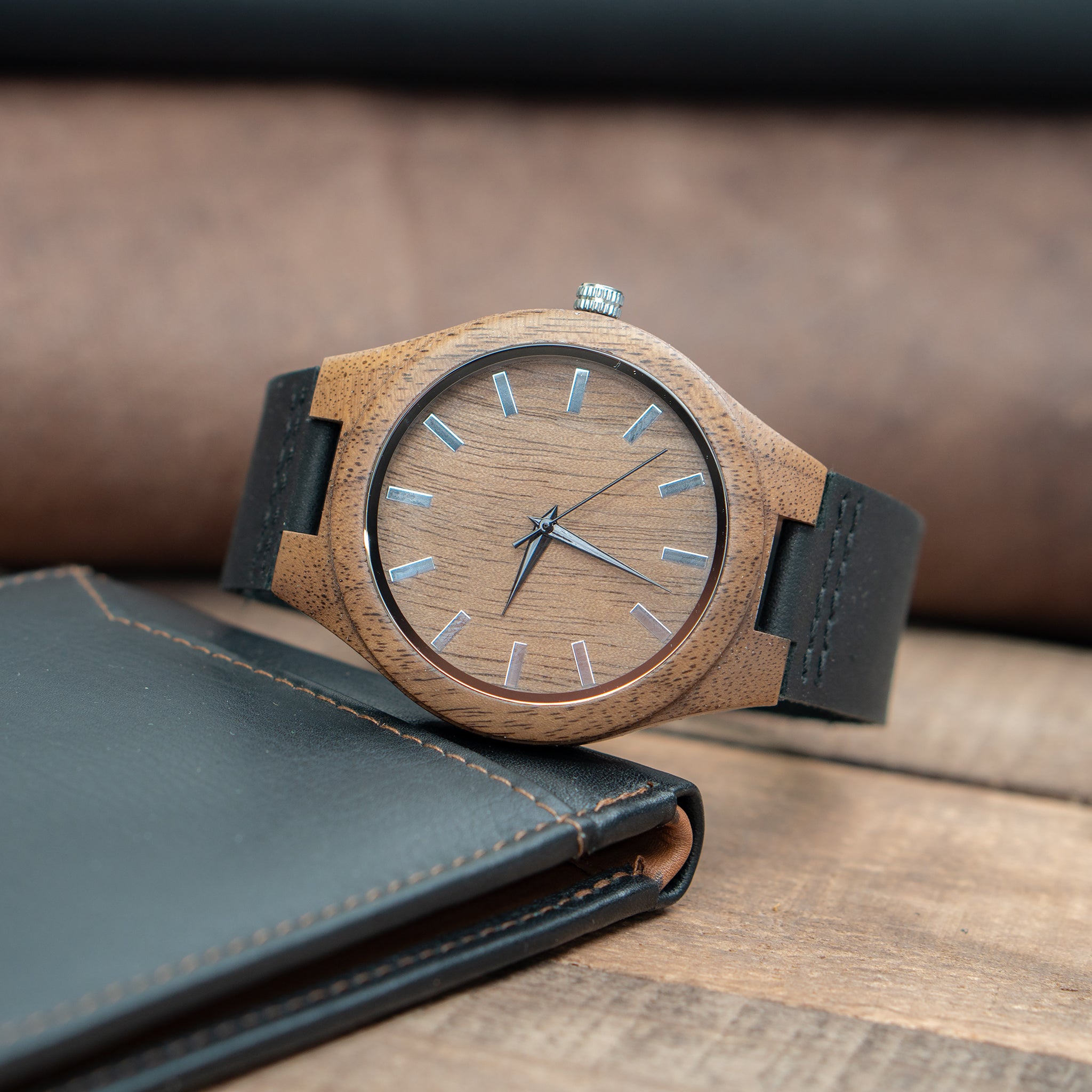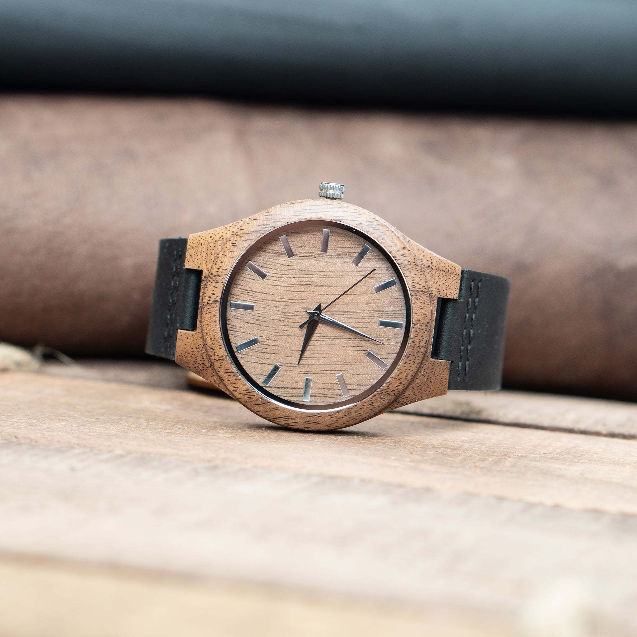 Precise and powerful, The Falcon is a men’s wooden watch that pairs a warm natural walnut wood case with a sharp black leather band — a contrast that gives this watch an edge over more traditional wood watch pairings. The result is a timepiece that feels premium and modern without losing the organic soul that makes a wooden watch special.