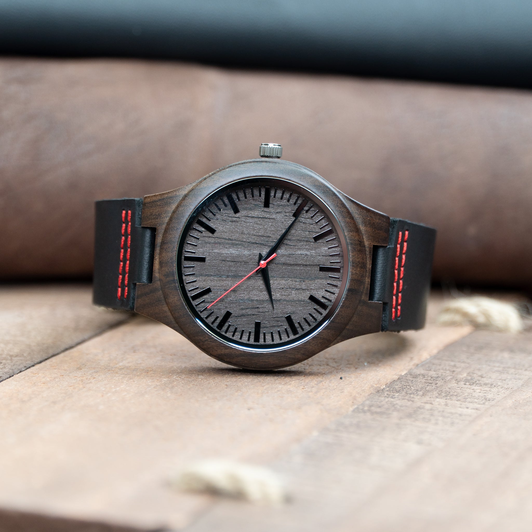 For the man who doesn’t blend in, The Flynt is a men’s wooden watch that turns heads with a striking combination of black wood, a red-accented dial, and a full-grain leather band. The red detail catches the eye just enough to make this watch unmistakably bold while remaining wearable for everyday use.