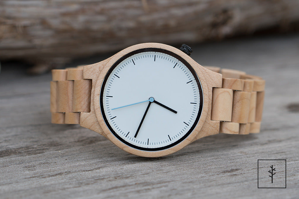 Cool, clean, and quietly extraordinary — The Glacier is a men’s maple wood watch that stands apart from the darker, warmer tones typical of wooden watches. Maple’s light, fine grain brings a crisp, contemporary quality to this all-wood watch, making it a fresh choice for men who want something natural but not rustic.