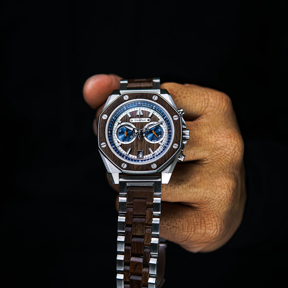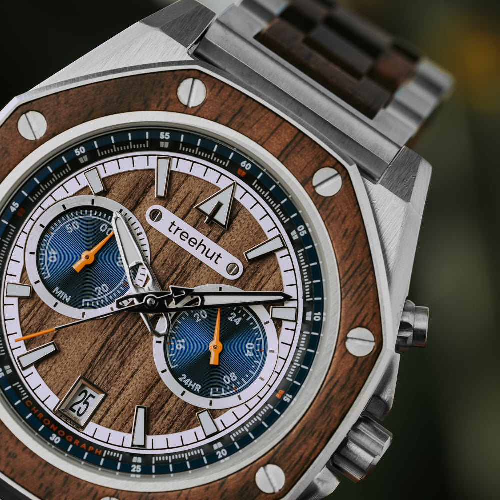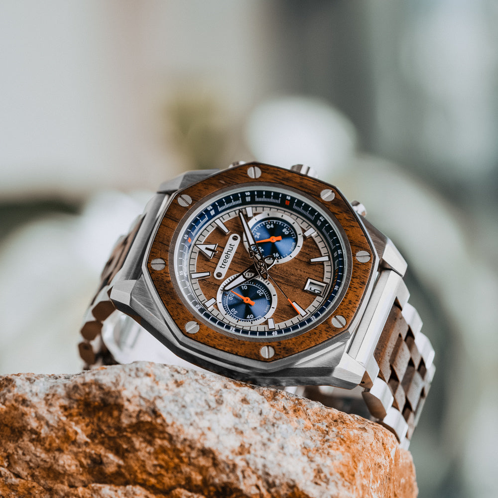 The Mission Walnut Blue is one of Treehut’s top men’s wooden watches. It pairs an octagonal case with precision walnut wood inlay and silver brushed stainless steel for a striking contrast. Its dial includes running seconds, a 30-minute chronograph counter, and a date window at six o’clock, all accented by Super-LumiNova-filled markers and hands. For those seeking a custom wooden watch with refined detail and dependable build, this model bridges rugged charm with the elegance often seen in luxury wooden watches.