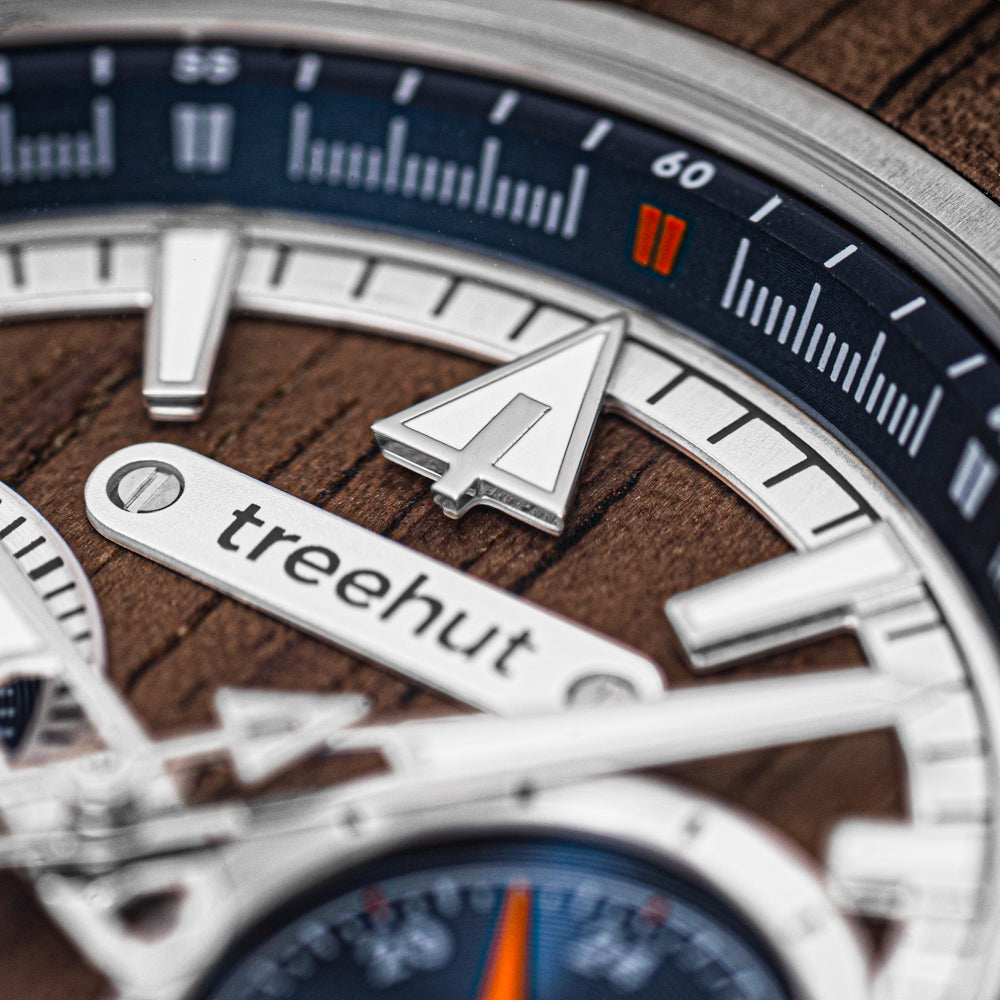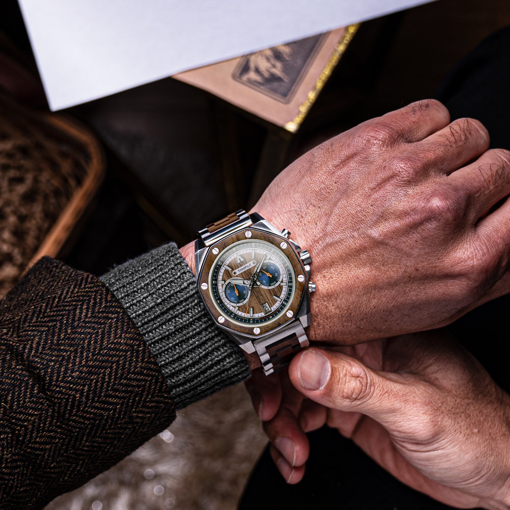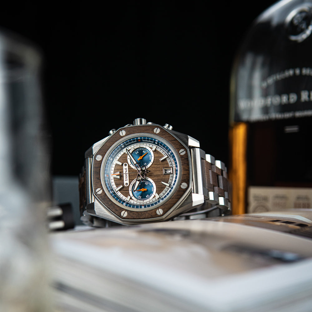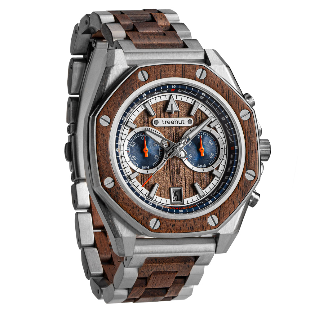 The Mission Walnut Blue is one of Treehut’s top men’s wooden watches. It pairs an octagonal case with precision walnut wood inlay and silver brushed stainless steel for a striking contrast. Its dial includes running seconds, a 30-minute chronograph counter, and a date window at six o’clock, all accented by Super-LumiNova-filled markers and hands. For those seeking a custom wooden watch with refined detail and dependable build, this model bridges rugged charm with the elegance often seen in luxury wooden watches.