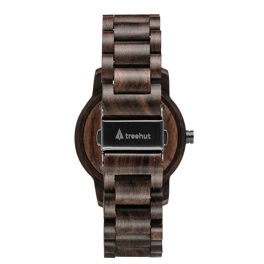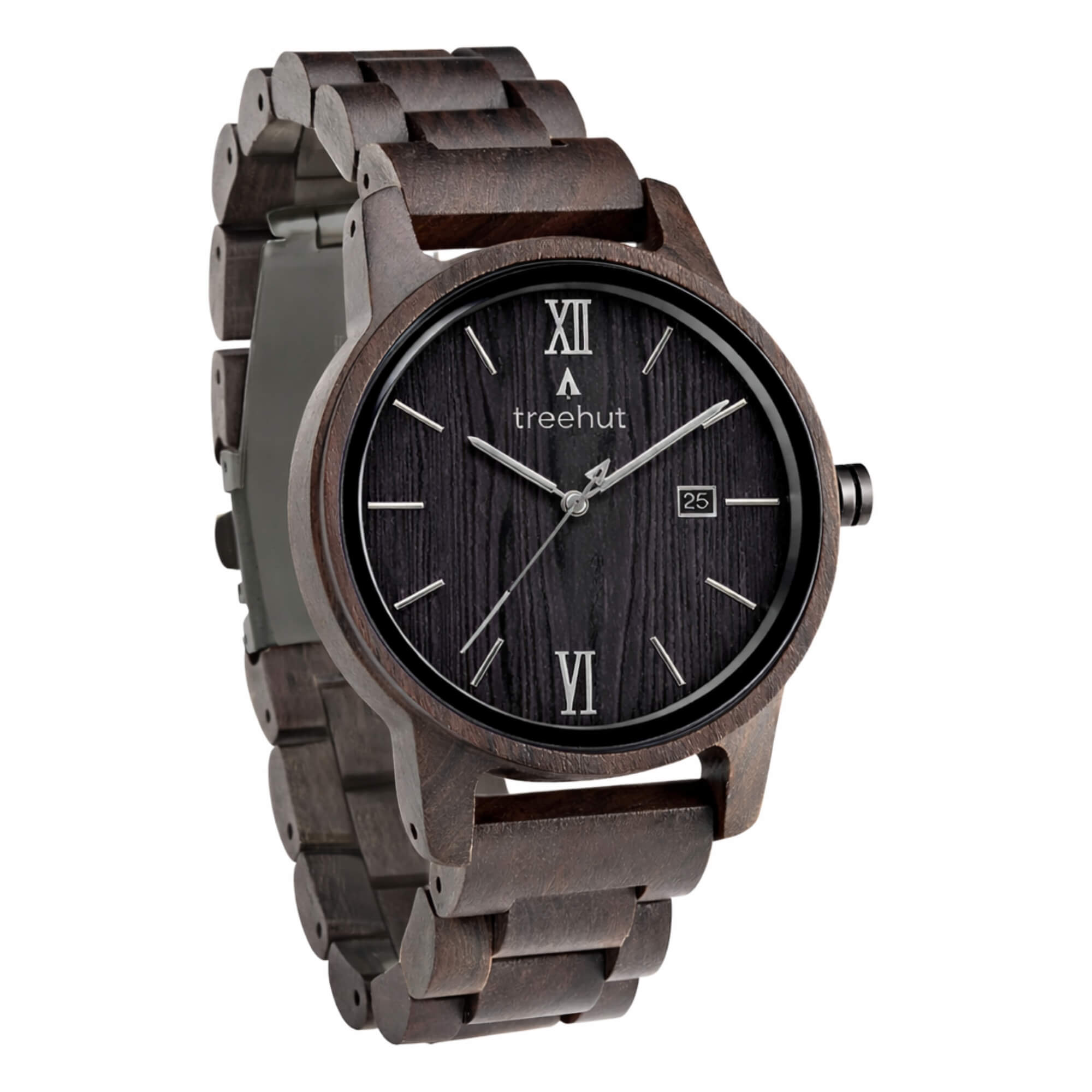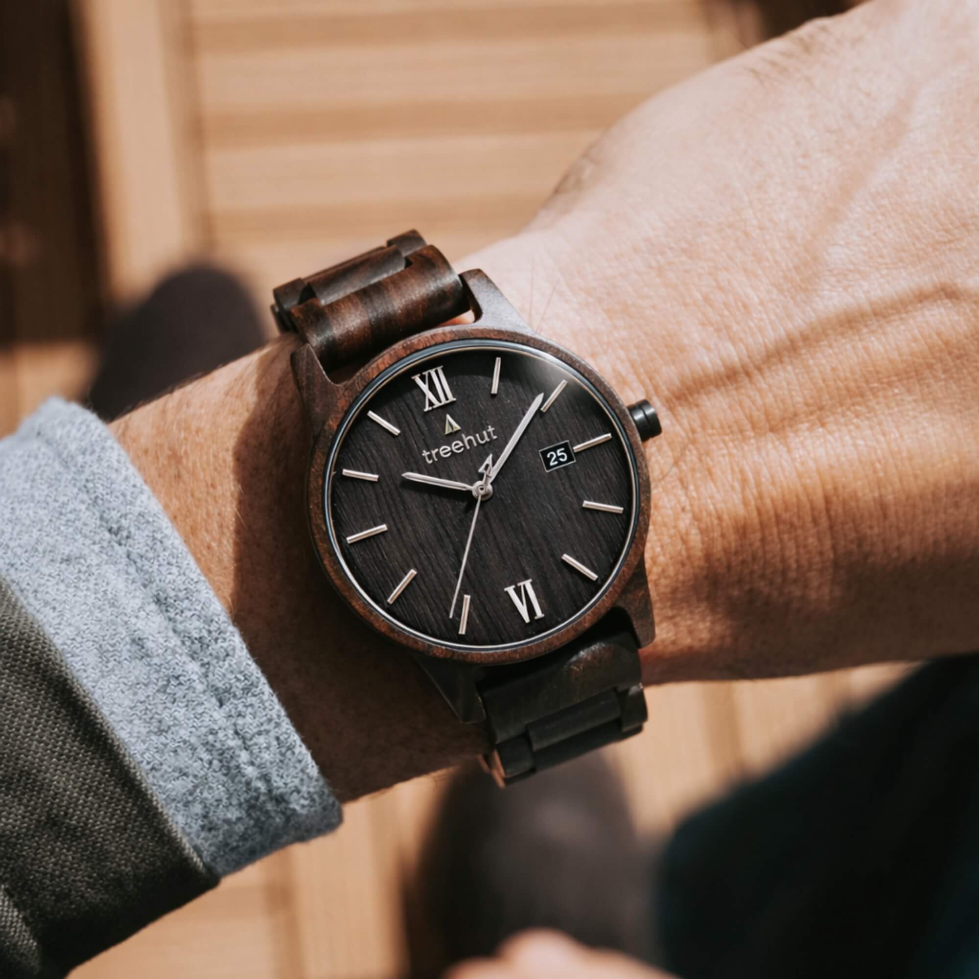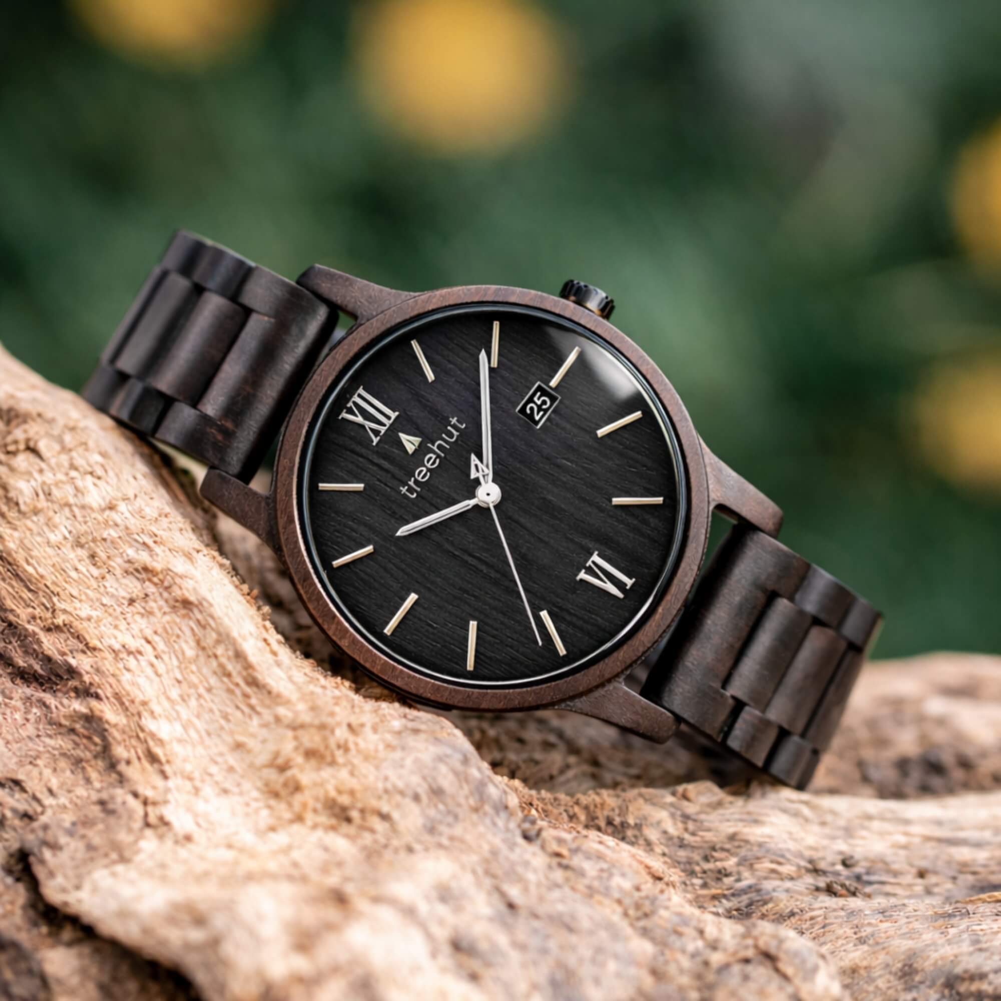 The dial is carved from ebony wood and features a clean date display and silver hour markings. Its minimalist yet masculine design earns it a place in any collection of best wooden watches for daily wear or dressier moments.