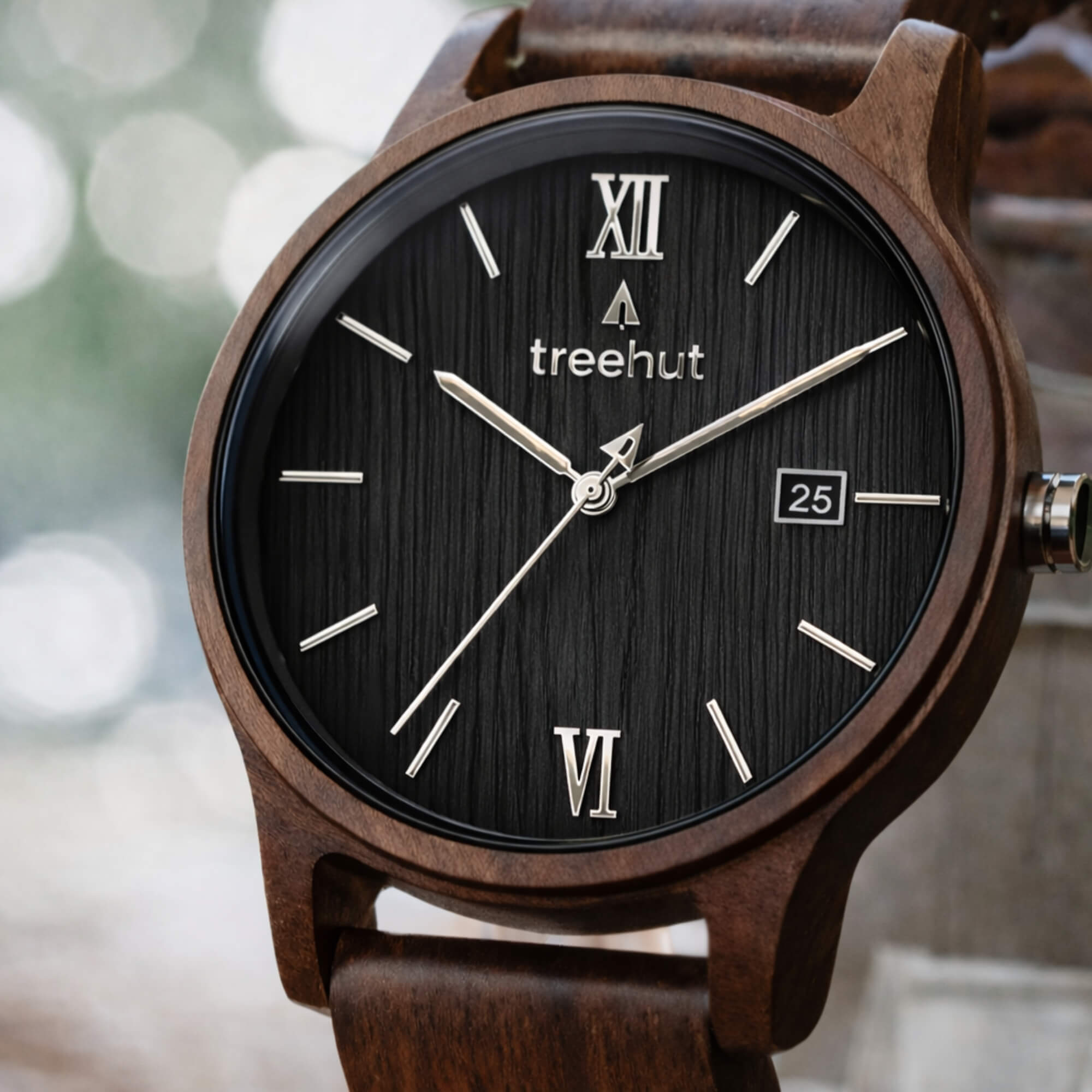 Meet the Odyssey All Ebony, a refined standout from Treehut’s Odyssey Collection – inspired by the modern wanderer who finds meaning in the journey, not just the destination. This slim timepiece represents the spirit of the collection and belongs among the best wooden watches for men who lead with quiet confidence. Built from natural ebony wood and detailed with classic Roman numerals, it’s sharp, understated, and always on point.