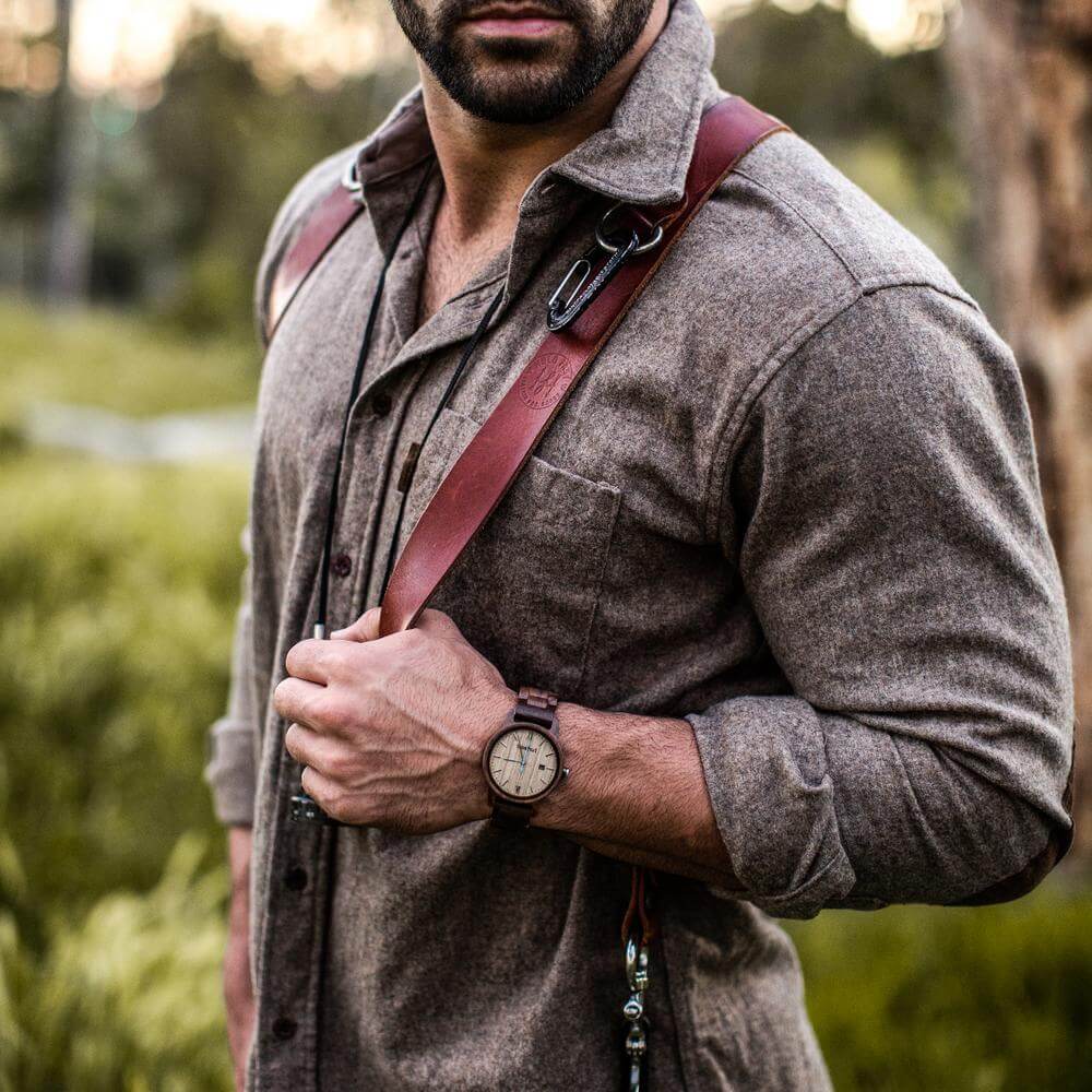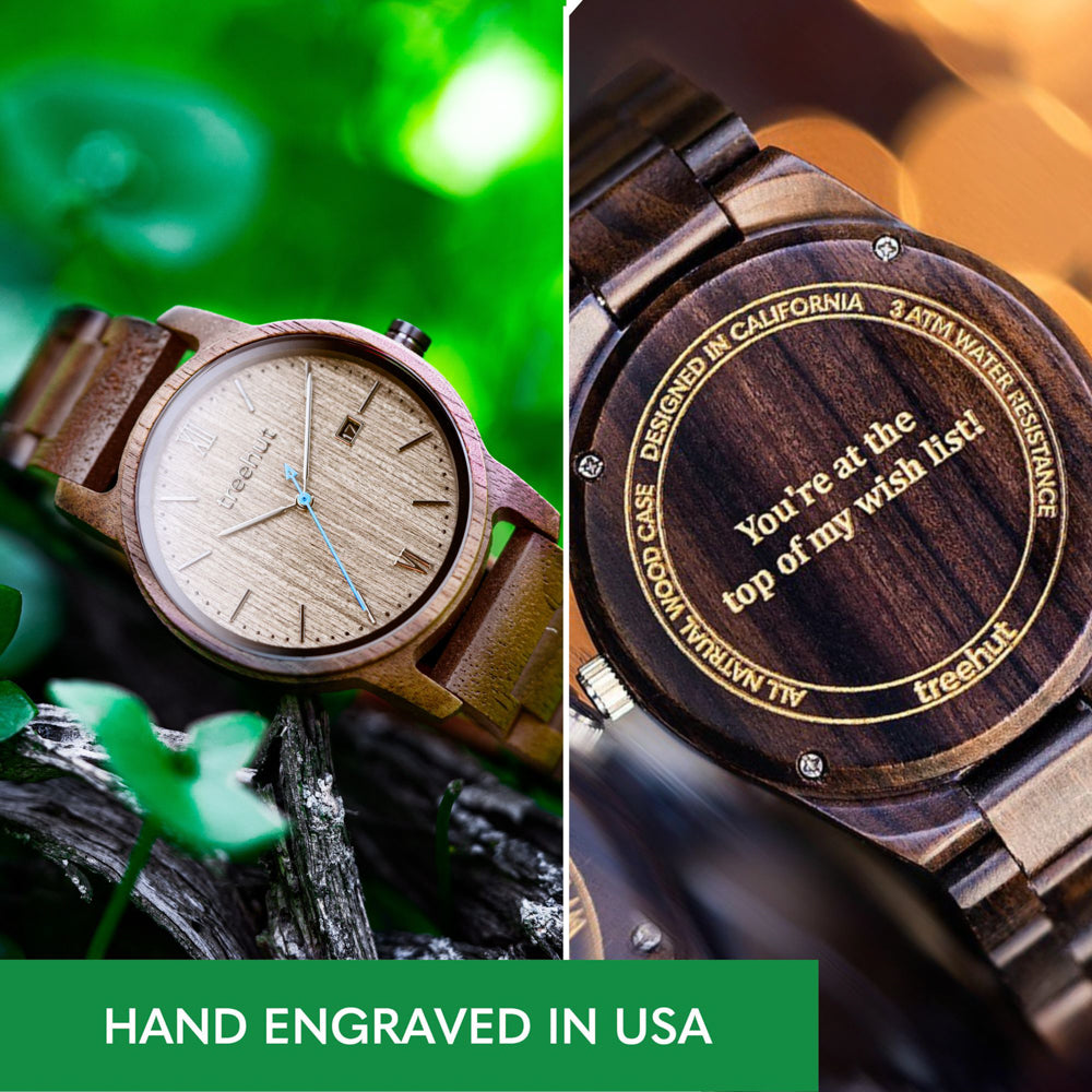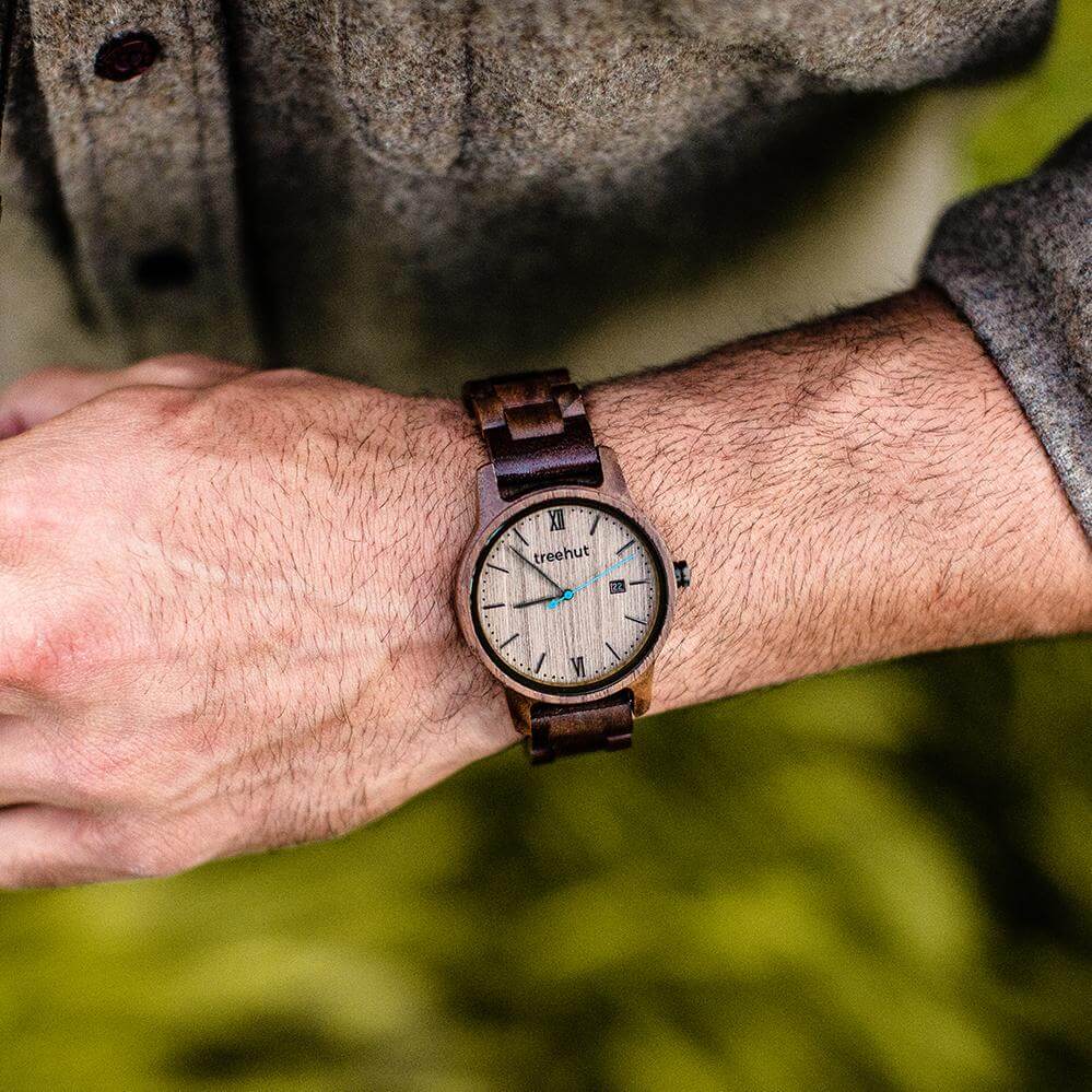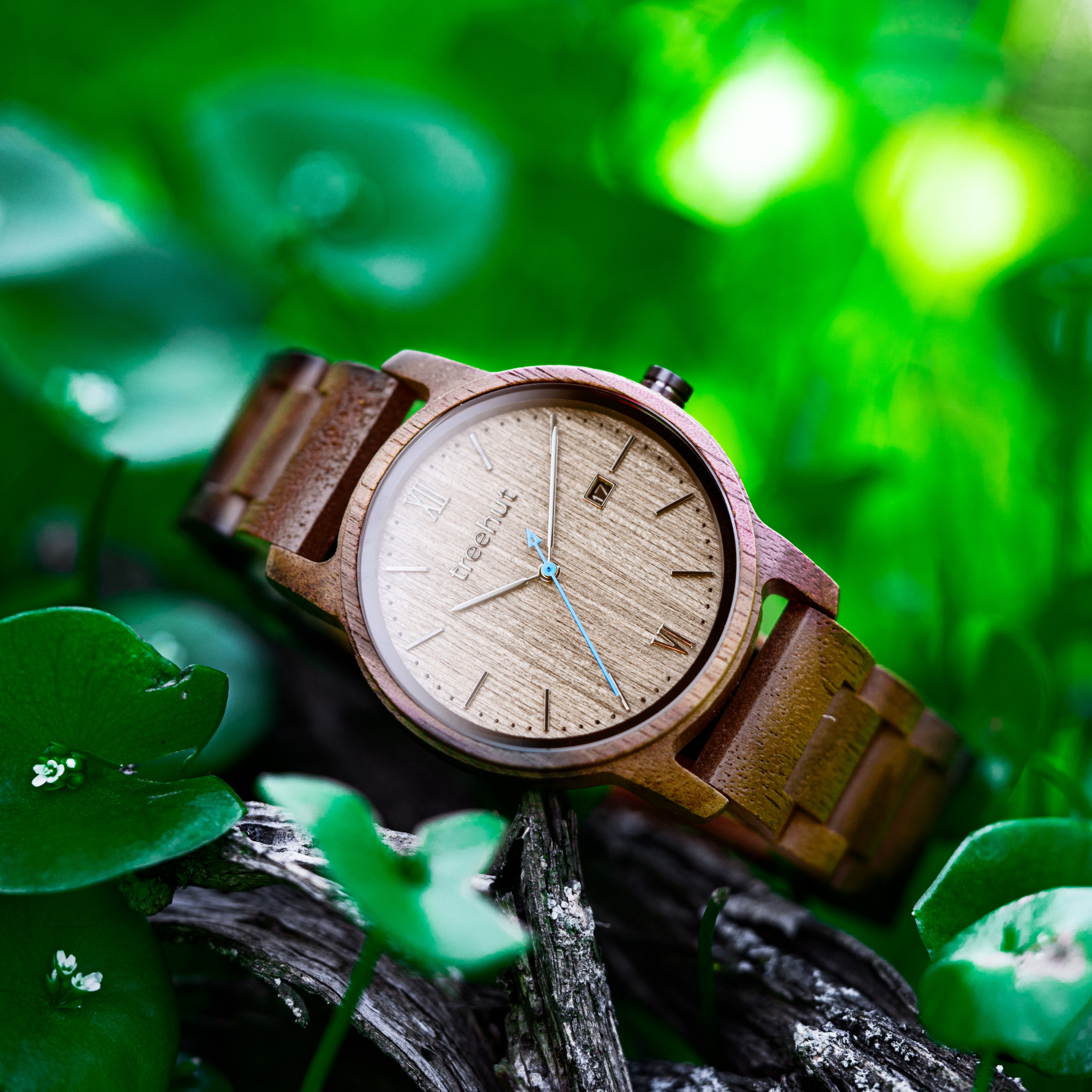 The Odyssey Cathaya Walnut Blue is one of our most distinct dress watches for men. Its case is carved from warm walnut wood, while the dial is cut from rare cathaya wood, accented with gun metal numerals at 6 and 12 o’clock. A date window adds function, and a blue seconds hand brings a quiet flash of personality. It’s easily one of our best wood watch picks for men who prefer understated elegance with just the right edge.