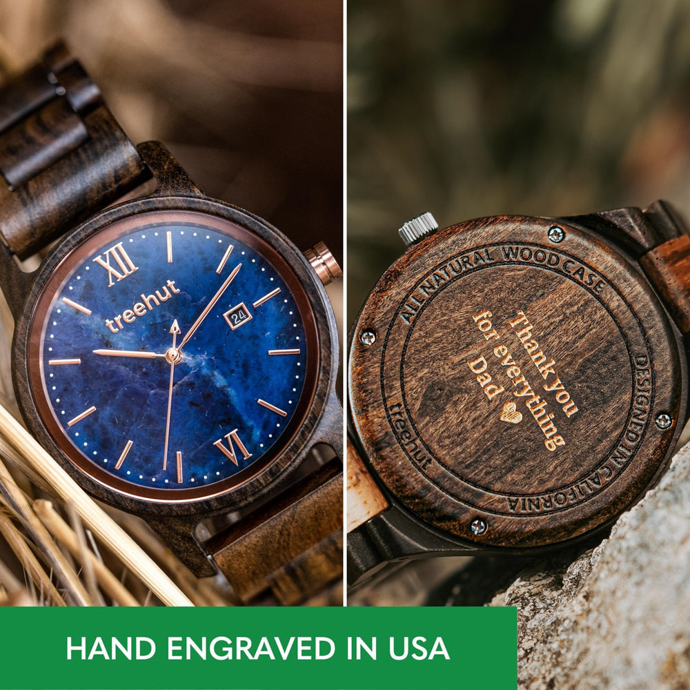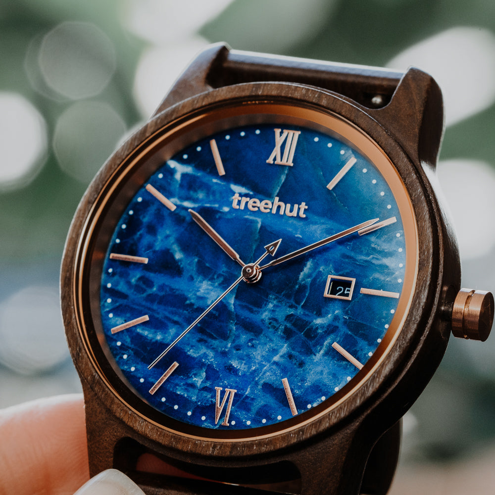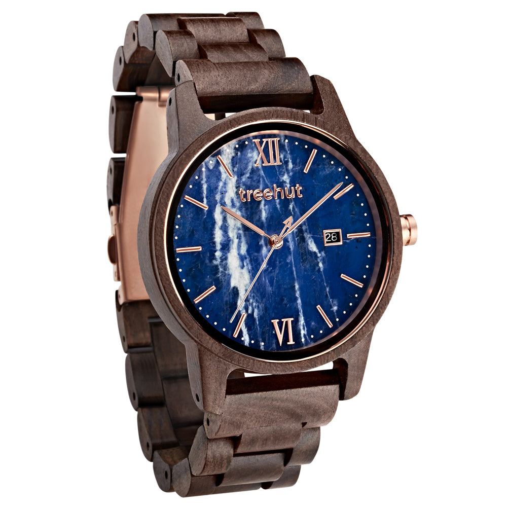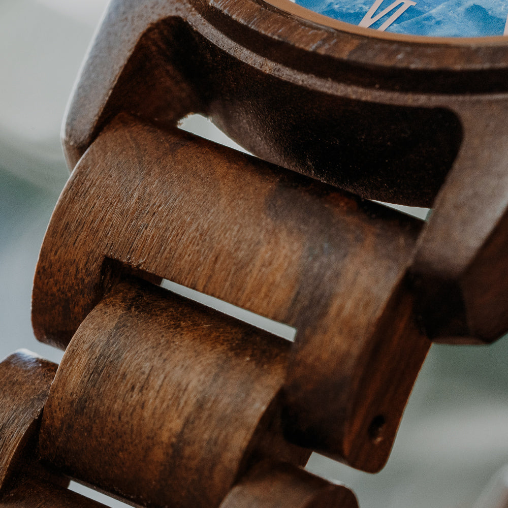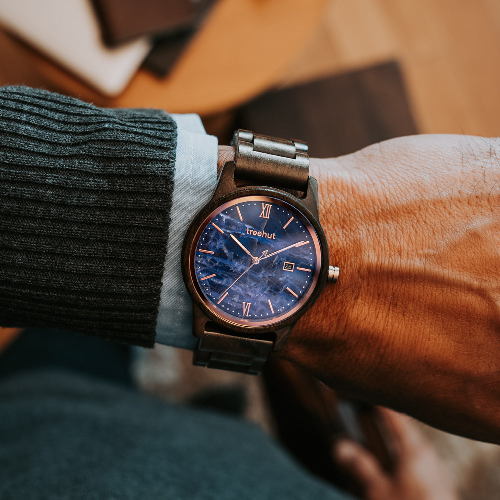 The Odyssey Marble Ebony Rose Gold is a refined marble watch for men built from deep ebony wood. Its dial, cut from Italian blue marble, features a date indicator and elegant rose gold details including hands and Roman numerals at 6 and 12 o’clock. A subtle yet striking example of men wood marble watches, it brings elevated simplicity to everyday style.