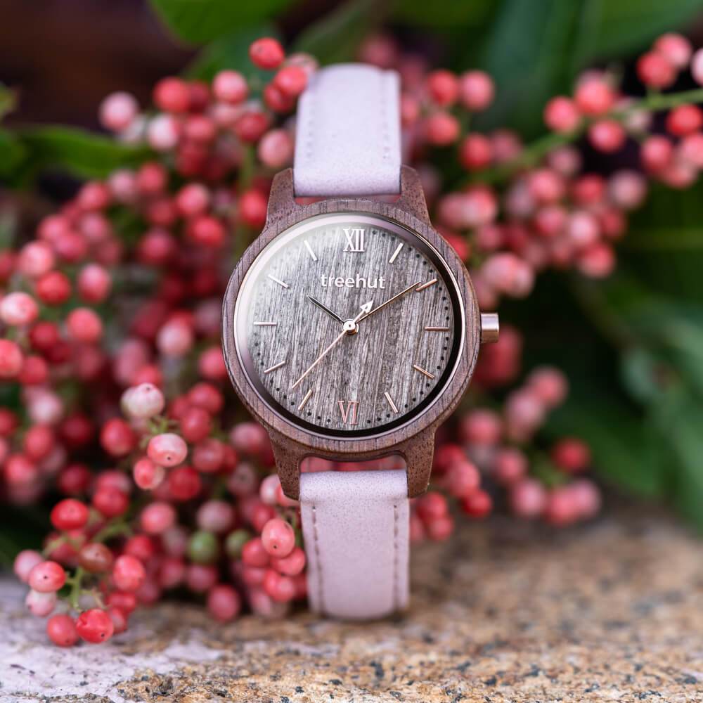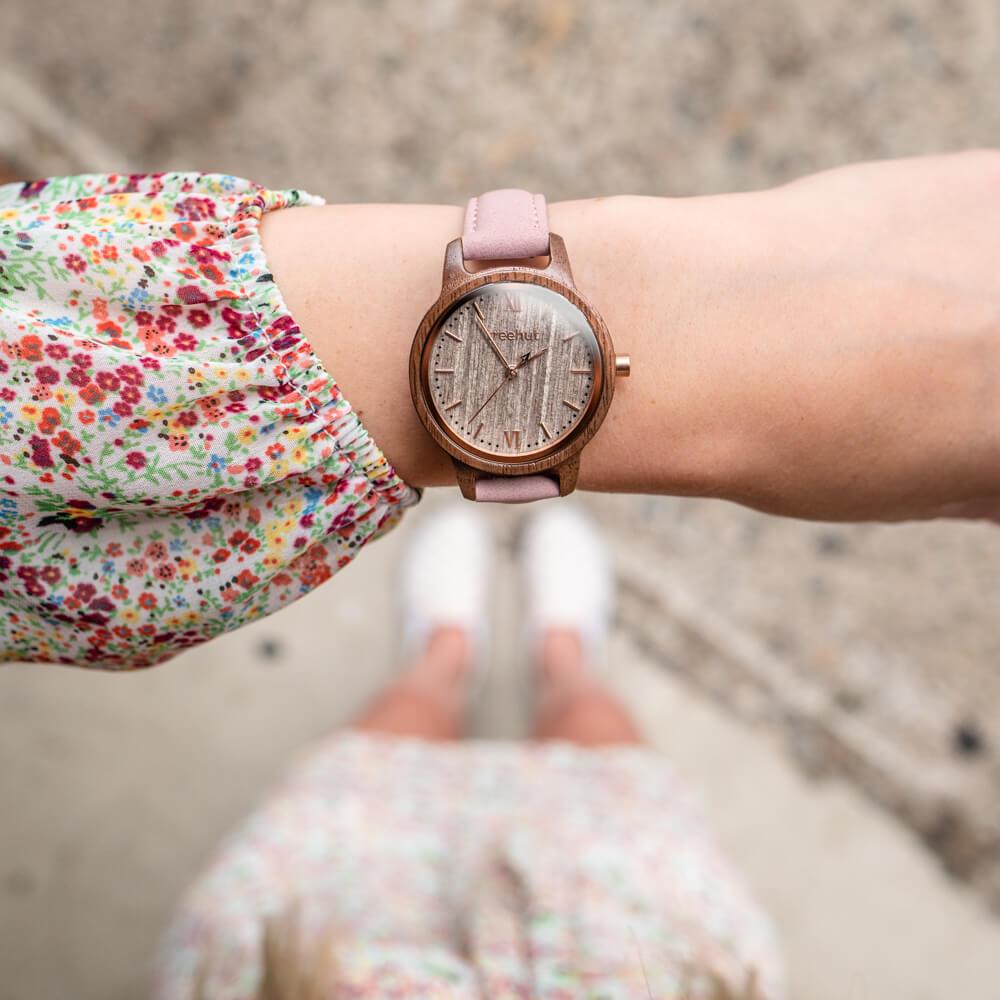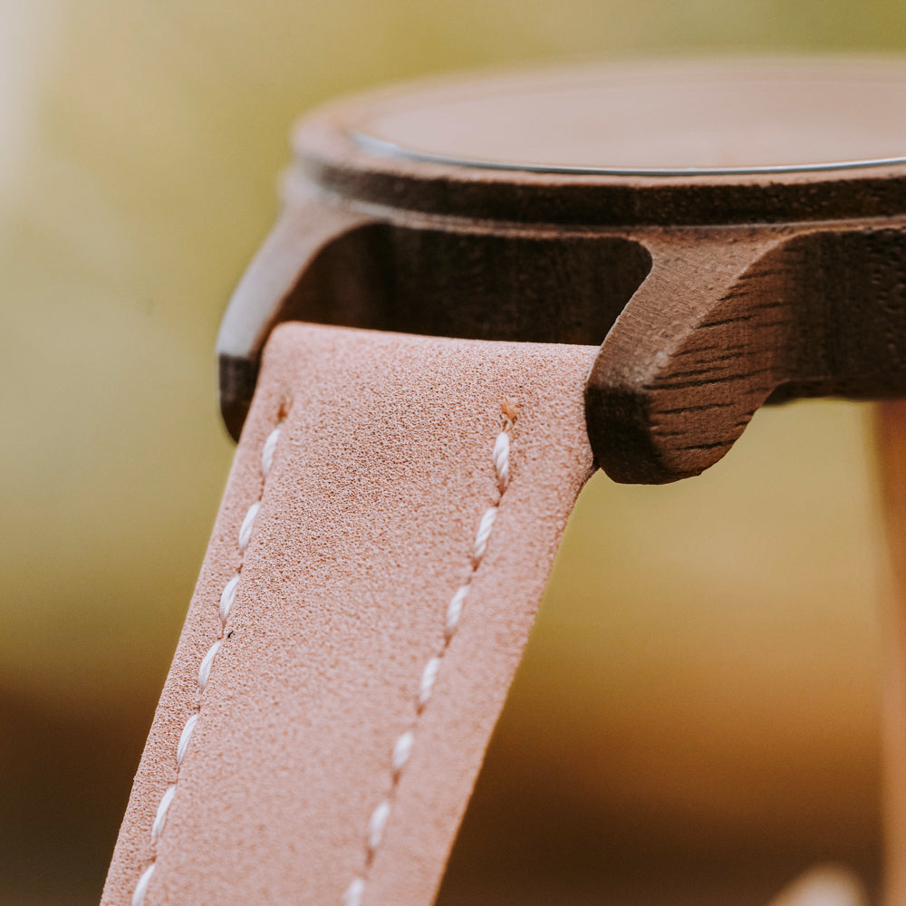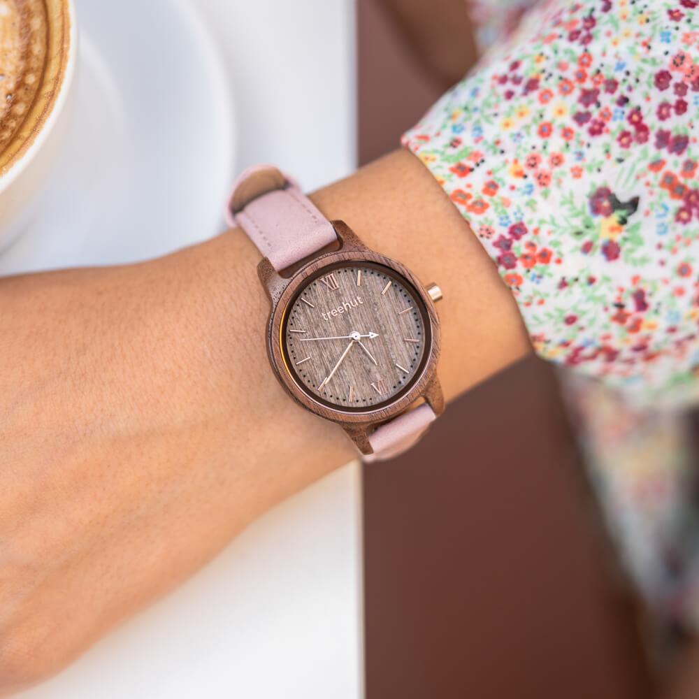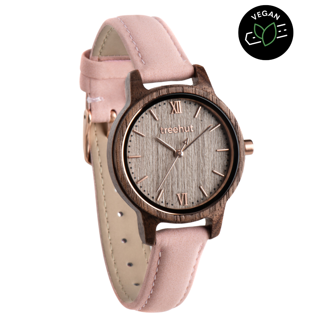 This pink leather strap watch is paired with a soft vegan band and a case made from solid walnut wood. If you’re looking for a pink wooden watch for women that doesn’t lean too trendy or overly classic, this piece strikes a clean balance. A pink women’s watch made for movement – whether that’s to the office, out on the road, or somewhere new entirely.