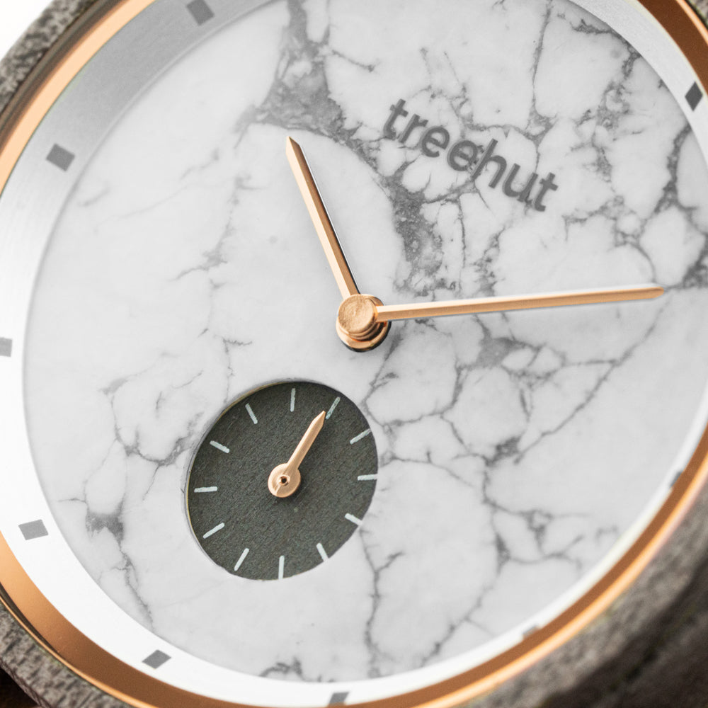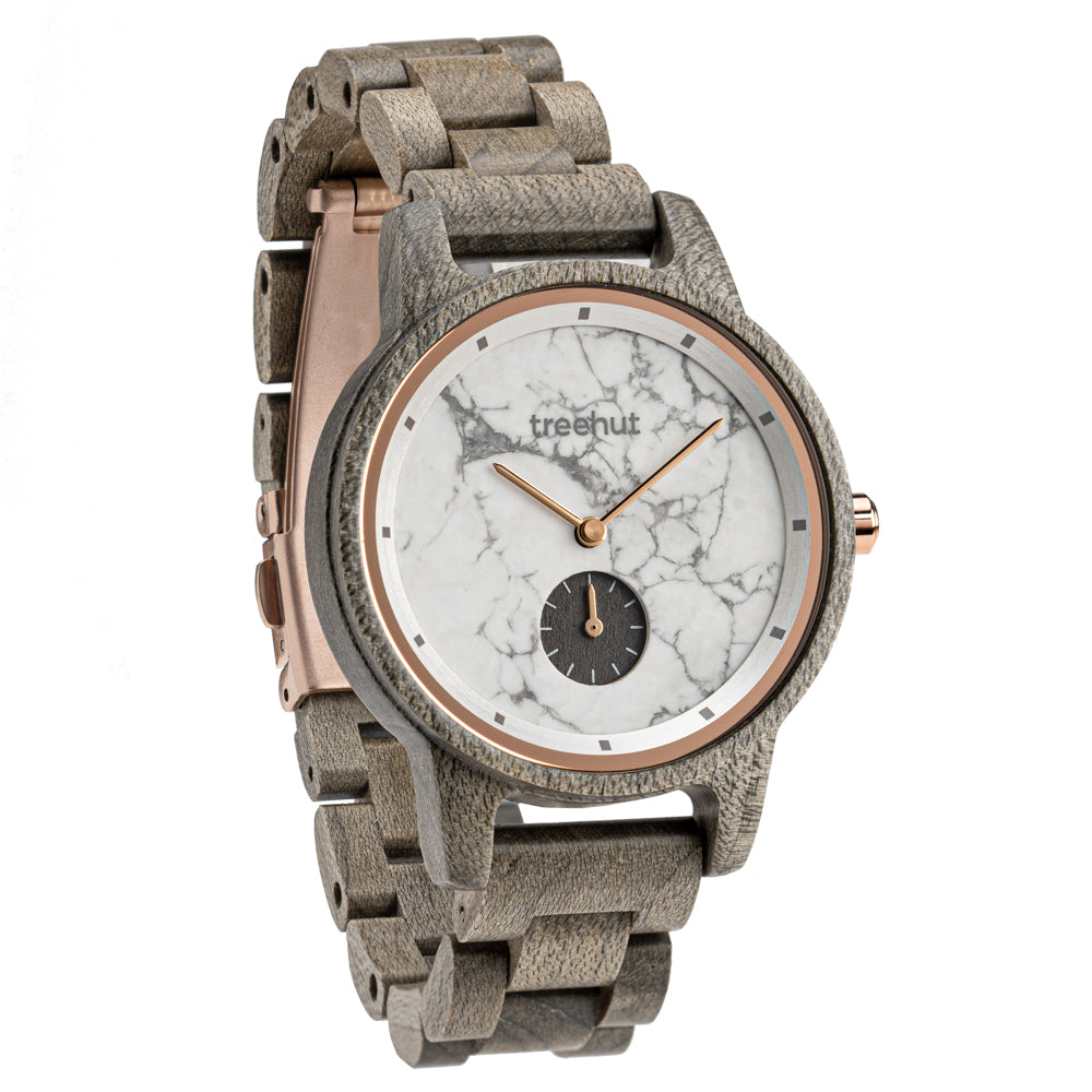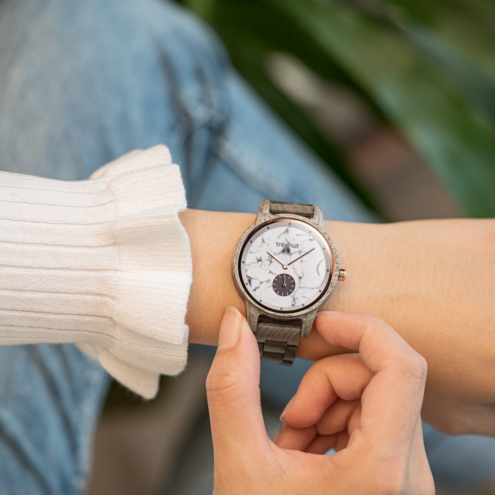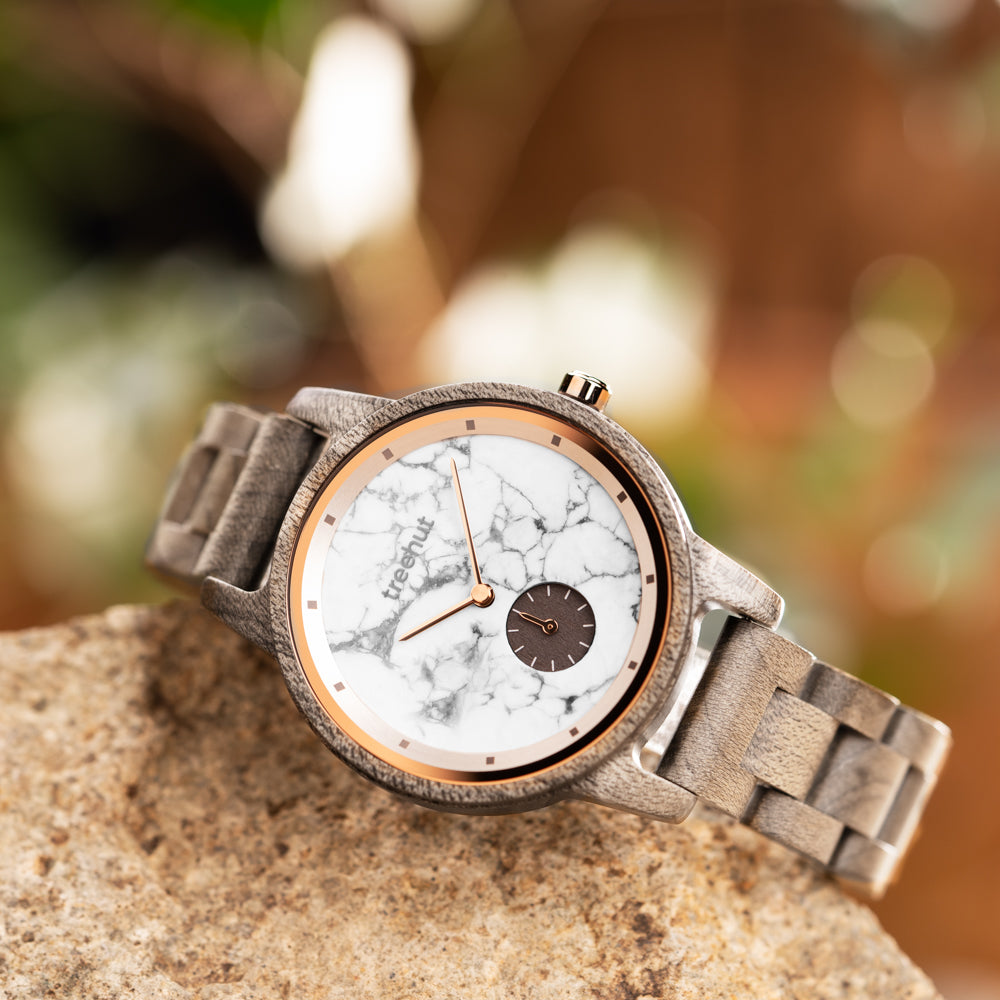 The Paradise Grey Maple White Marble Watch is designed with contrast in mind – cool tones, warm accents, and natural textures brought together in a clean, considered way. Among women’s wooden watches, this model stands apart with a white marble dial framed in rose gold and anchored by grey maple wood.