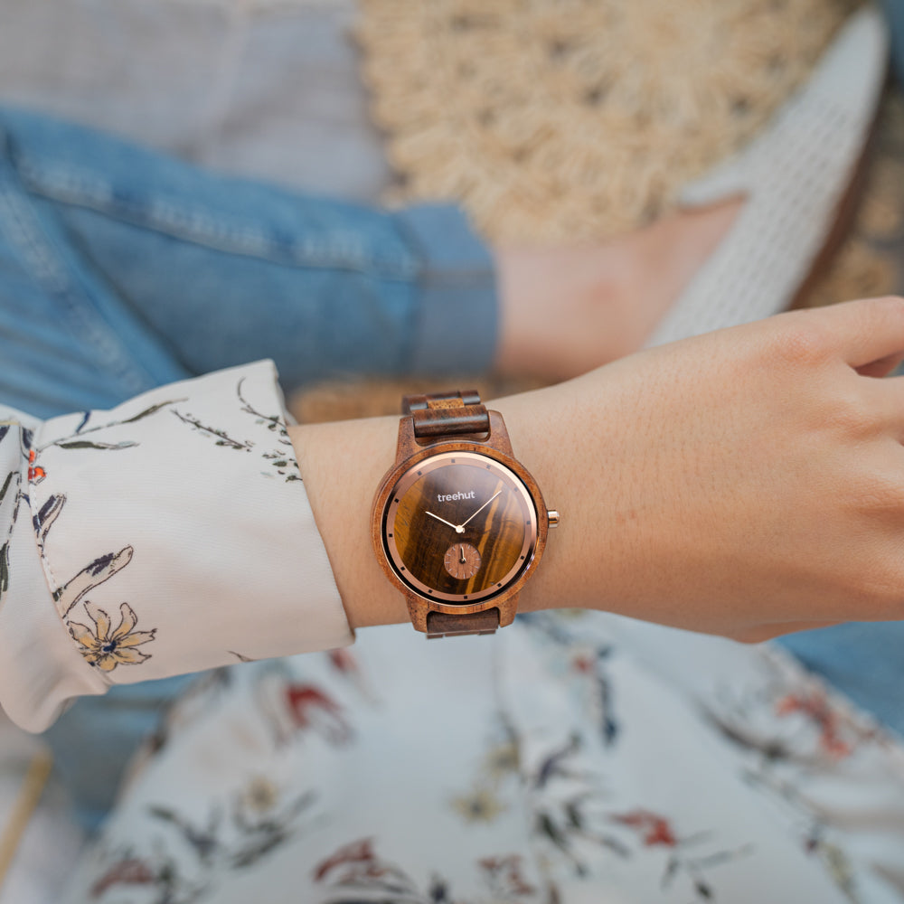 The Paradise Koa Tiger Eye brings depth and color to the world of women’s wooden watches. With its genuine tiger eye marble dial and polished rose gold bezel, it captures the contrast of bold natural elements and refined craftsmanship. The koa wood case and strap offer warm tones that shift with the light, adding dimension with every movement.