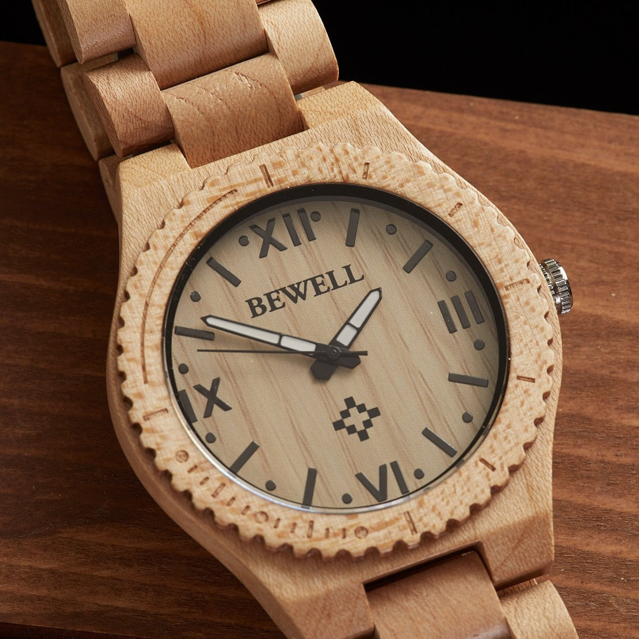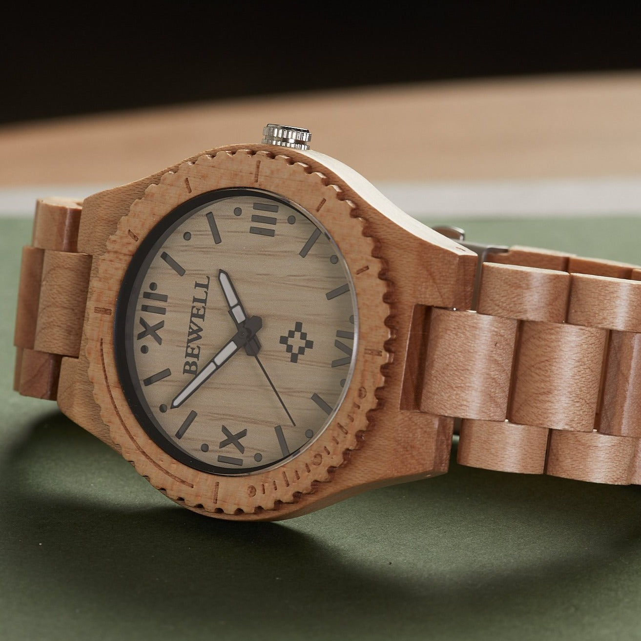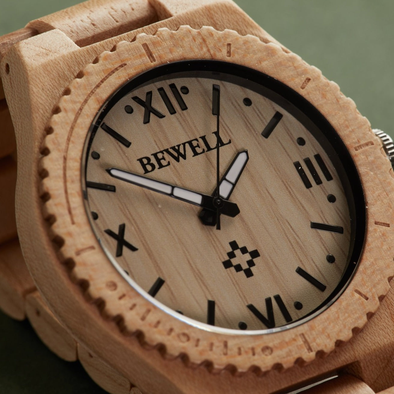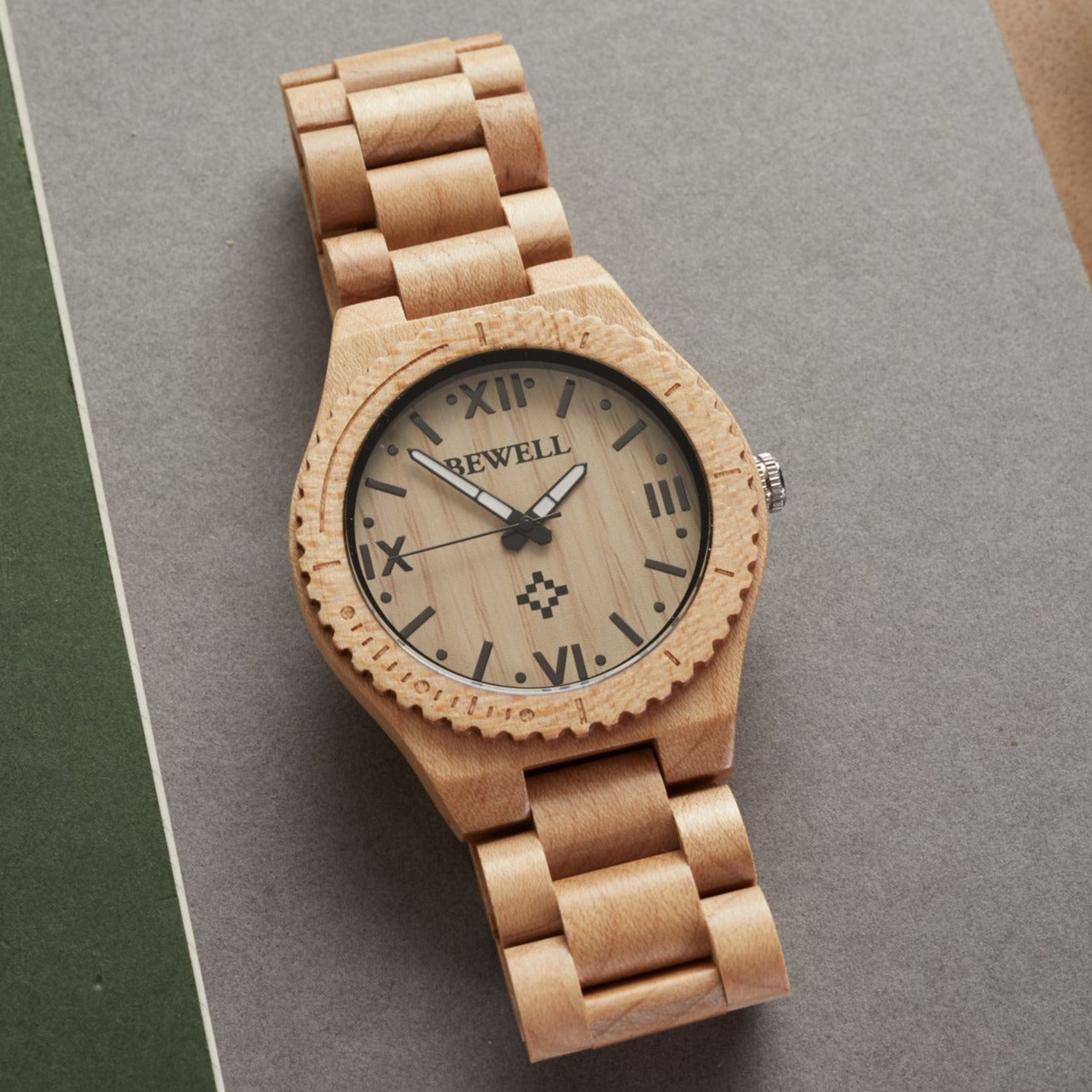 The Maple Pluto wood watch is made from 100% natural light color maple wood. Japanese movement and its wood strap is adjustable in size. Because the wood grain pattern is naturally different each time, every wood watch is different as well. This natural variation in wood grain is an attractive feature of these wooden timepieces that every possessor of these will feel the uniqueness of it.