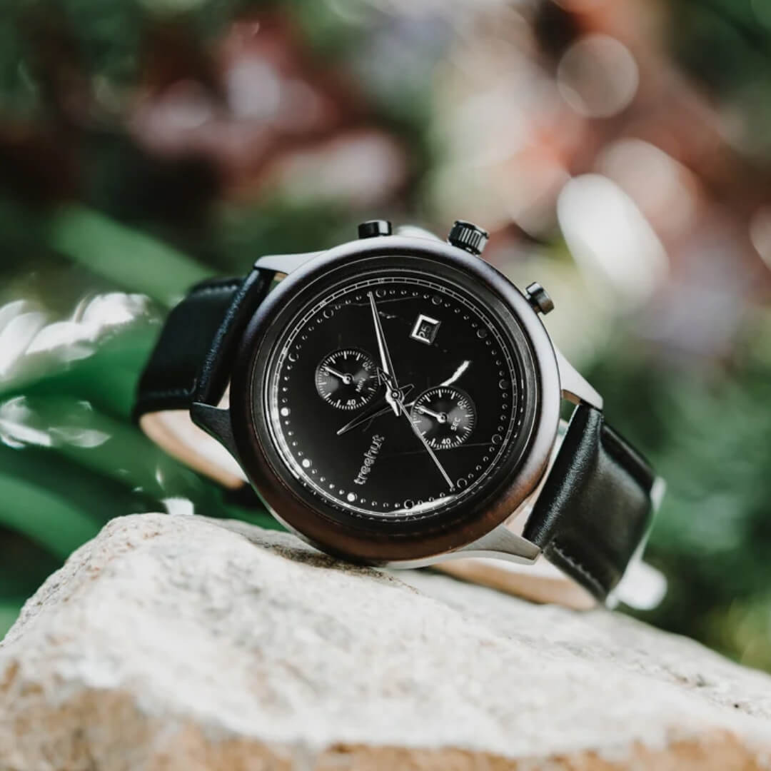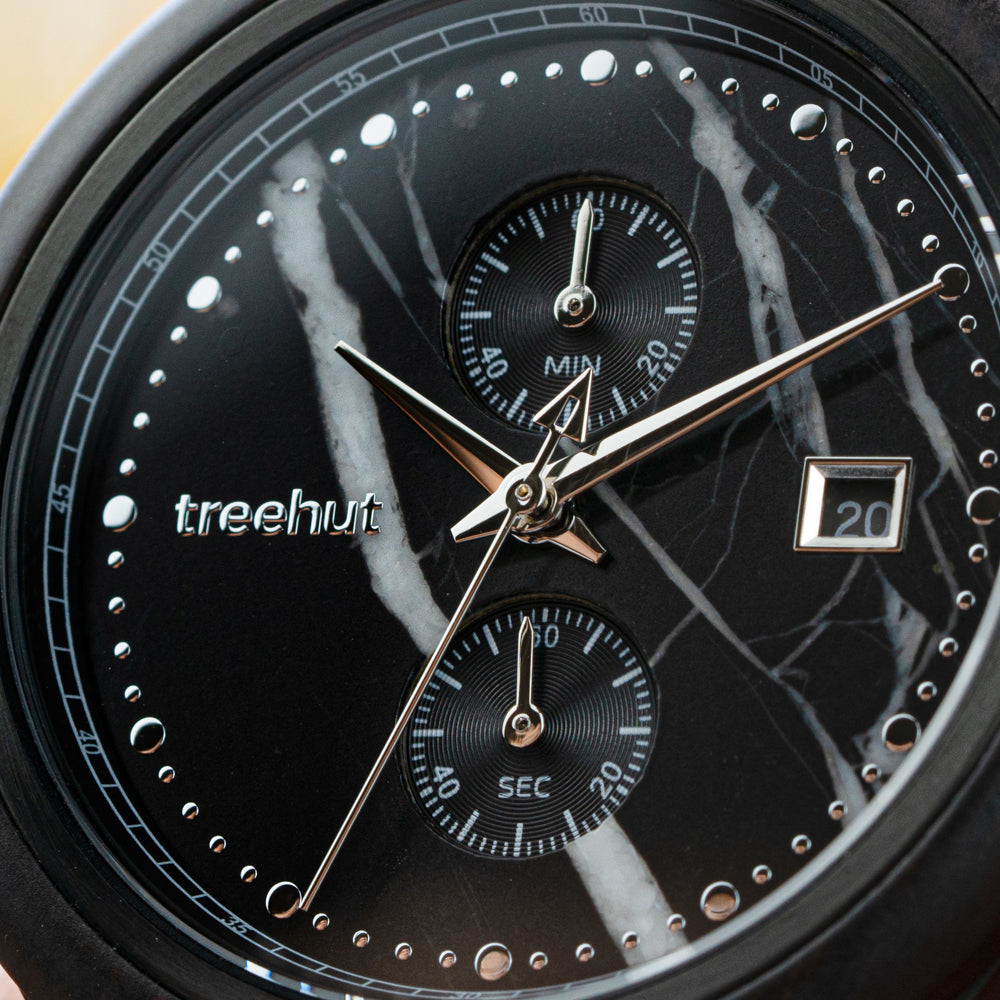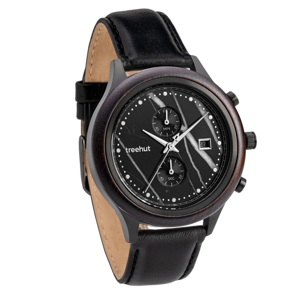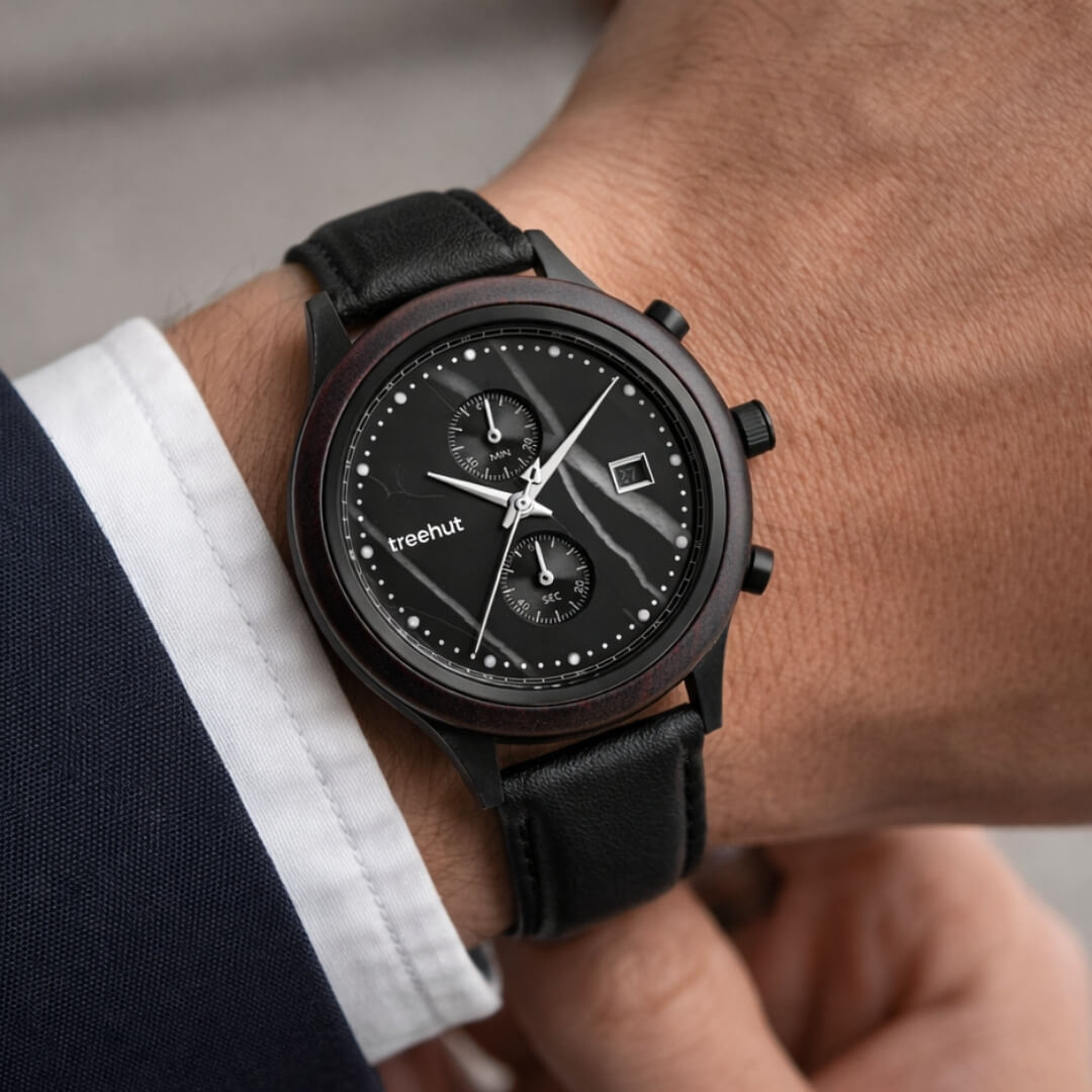 Powered by a high-accuracy chronograph quartz movement, this black marble wood watch tracks hours, minutes, sub-seconds, and date with exactness. It stands among standout marble watches for men, delivering a polished yet performance-ready presence. The seamless blend of marble and ebony gives this timepiece a distinct edge among today’s best black wood watch designs. Whether you’re at work or enjoying moments off the clock, this piece elevates your everyday ensemble without effort.