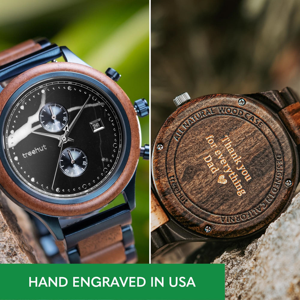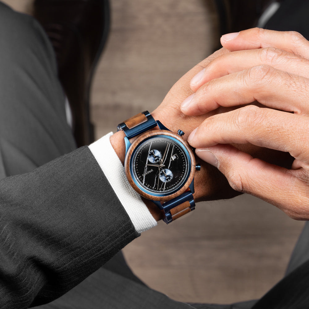Powered by high-accuracy quartz chronograph movement, it tracks hours, minutes, sub-seconds, and date with precision. As a luxury wooden watch, the Rise Walnut Black Marble Blue is designed to balance utility with natural detail. It’s a black marble watch for men that feels refined, well-built, and ready for everyday wear.