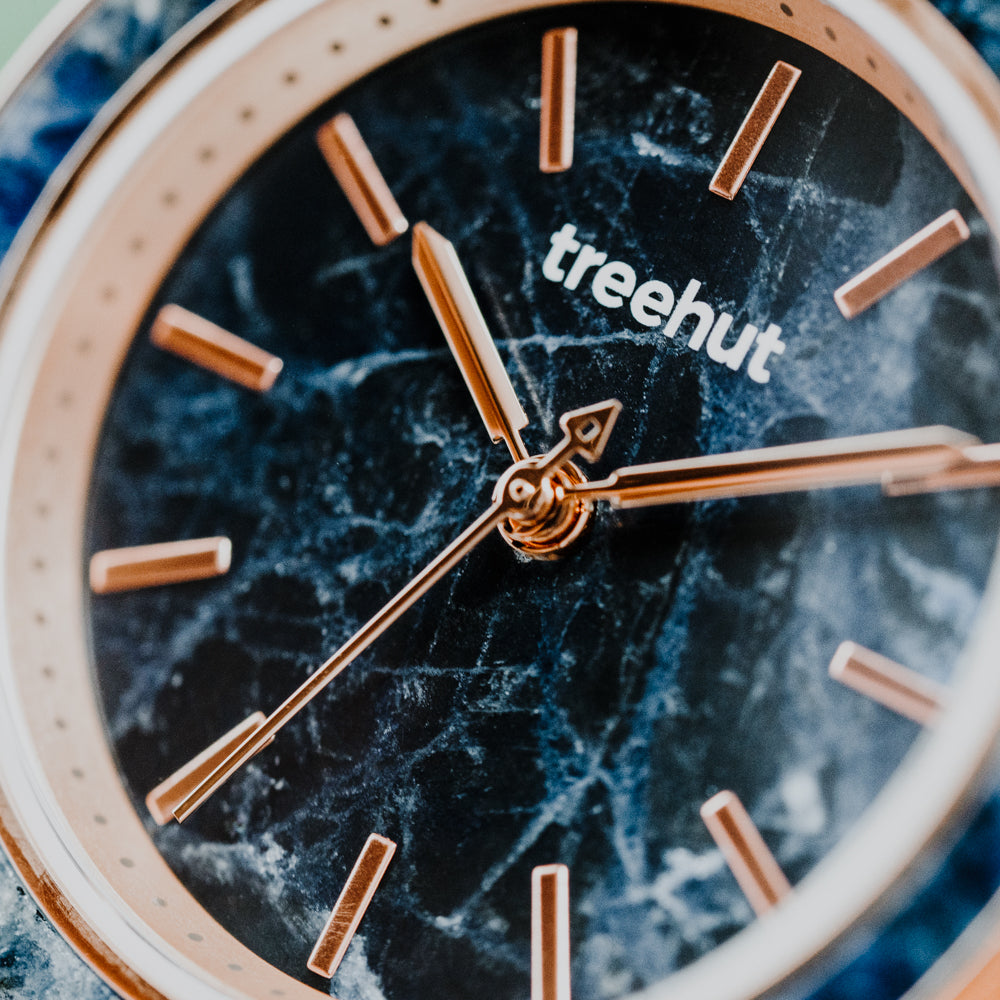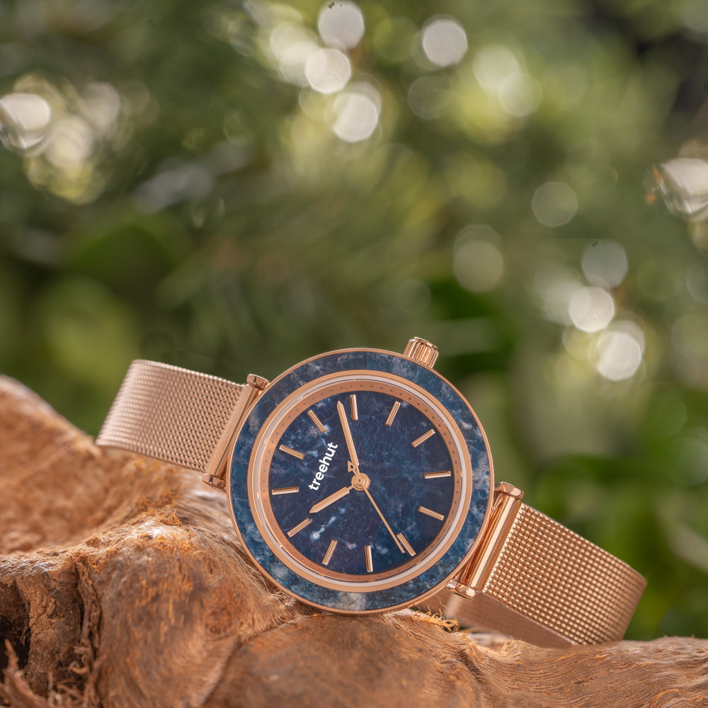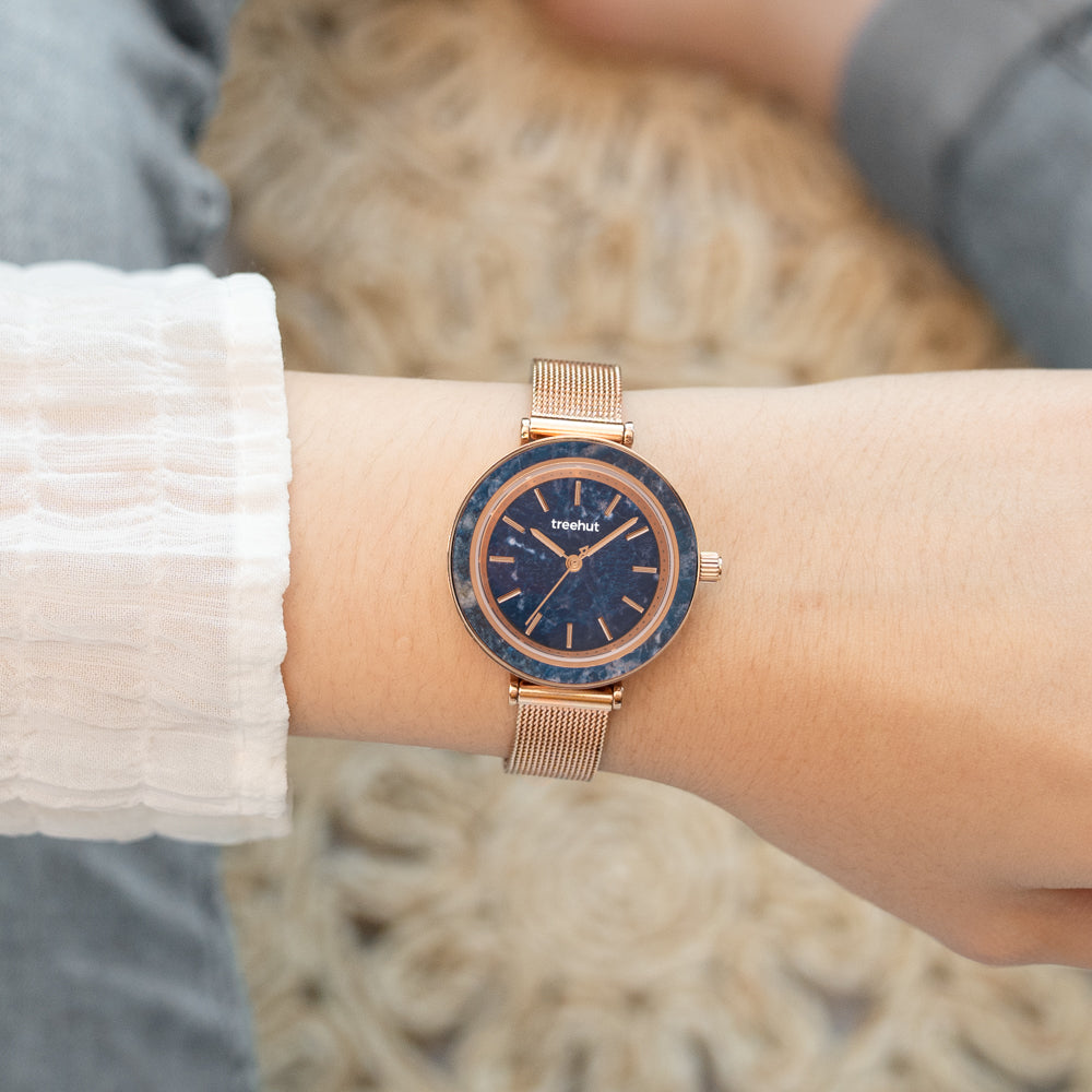 The Skyler Blue Marble Mesh is a fresh take on blue dial watches. Its deep navy marble dial and bezel bring in natural stone texture, paired with a rose gold mesh strap that keeps the overall look crisp and modern.
