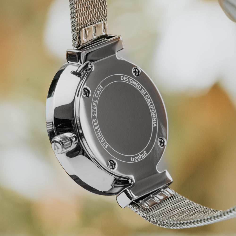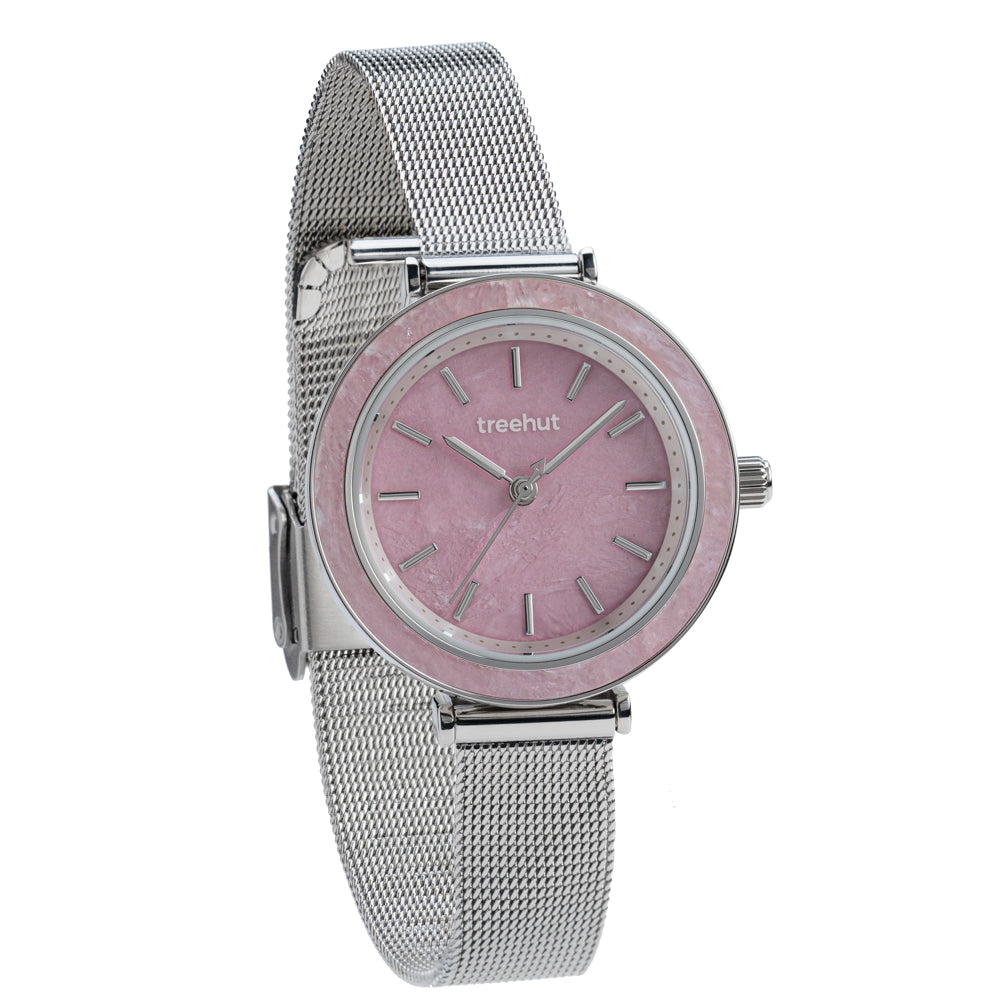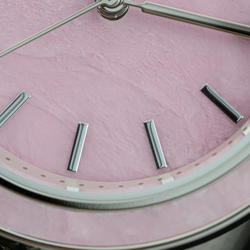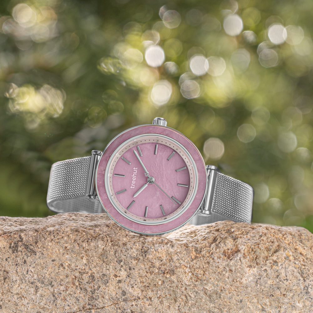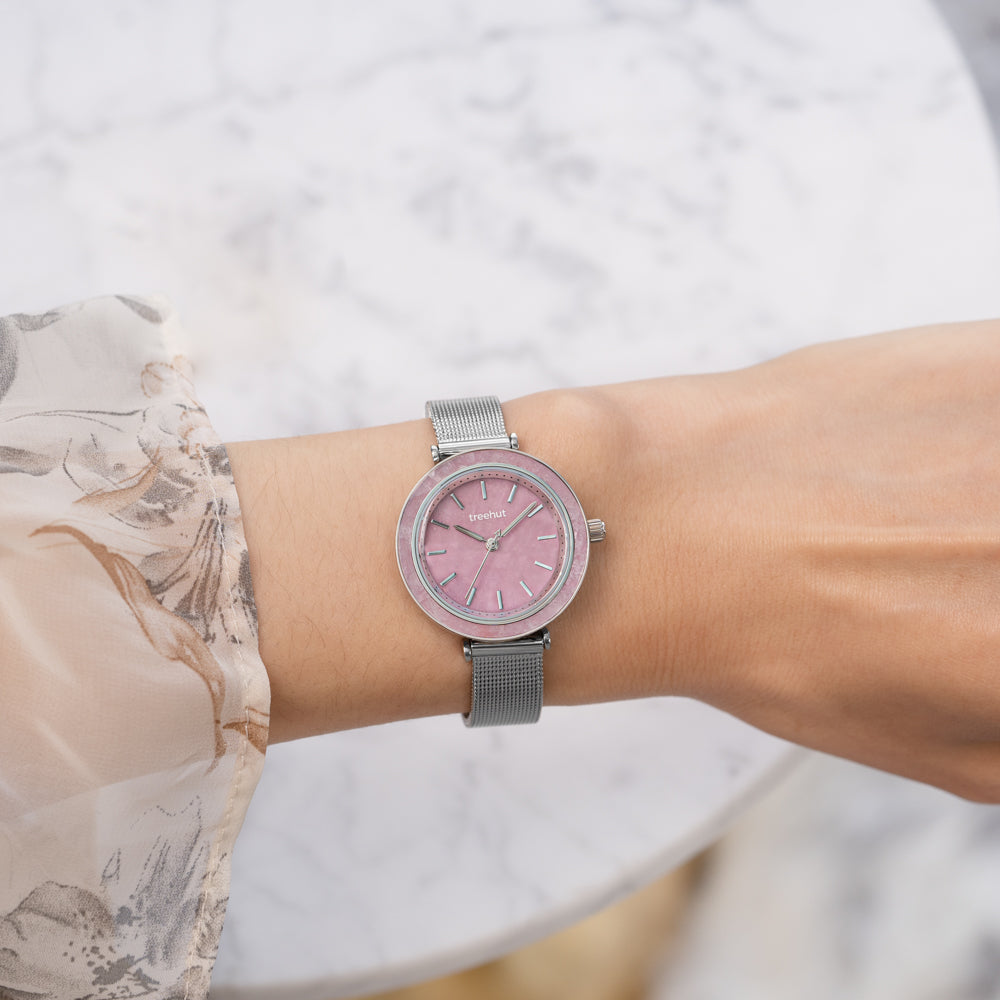 The Skyler Pink Marble Mesh is a pink dial watch that brings a little color play to your wrist. The dial and case are carved from genuine pink marble, so every piece has its own swirl and shade. No repeats here – each watch is one of a kind.