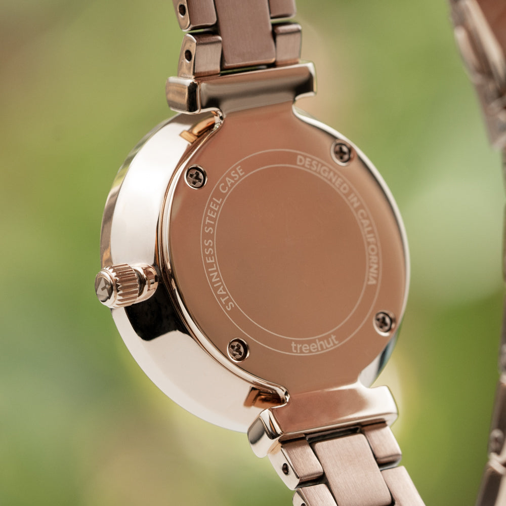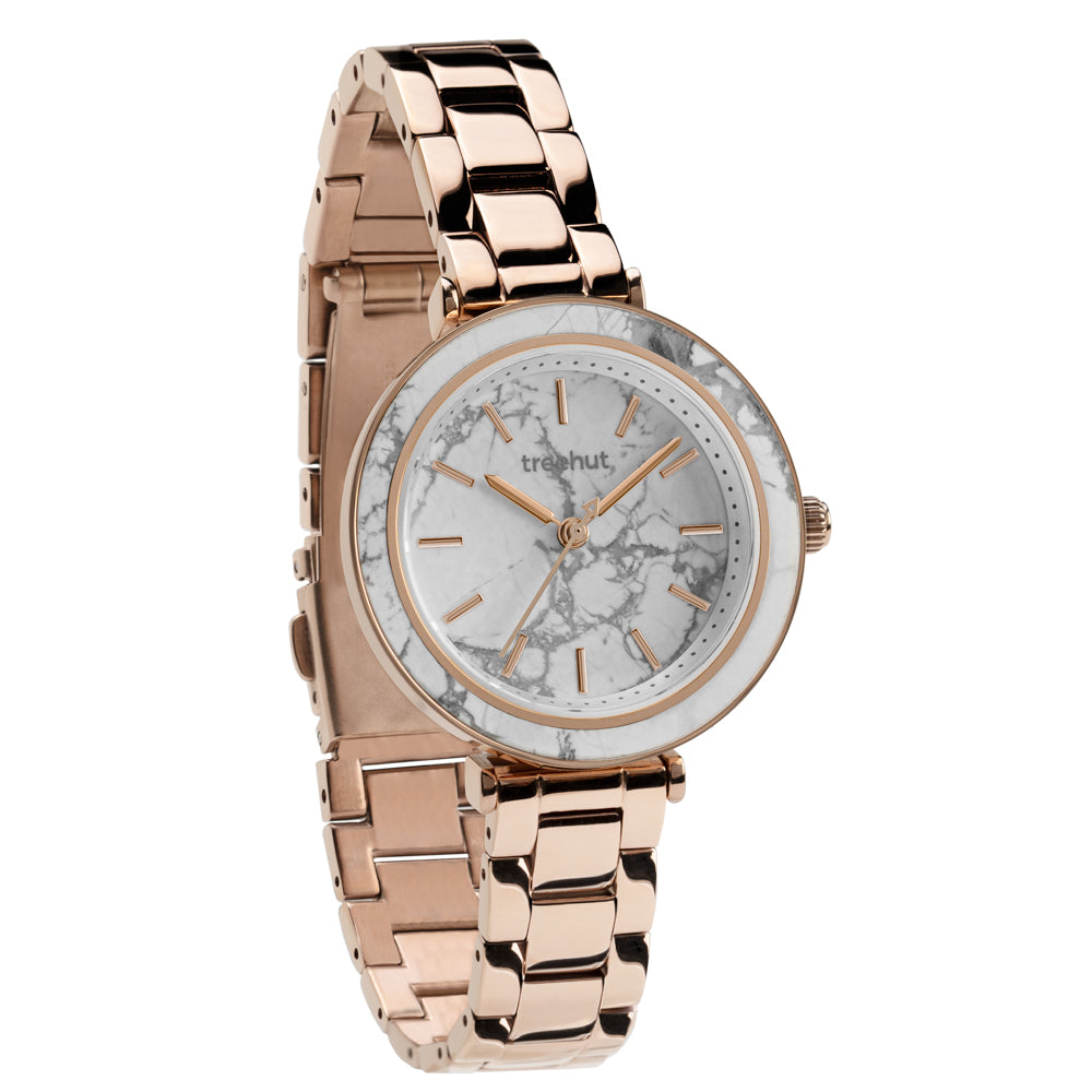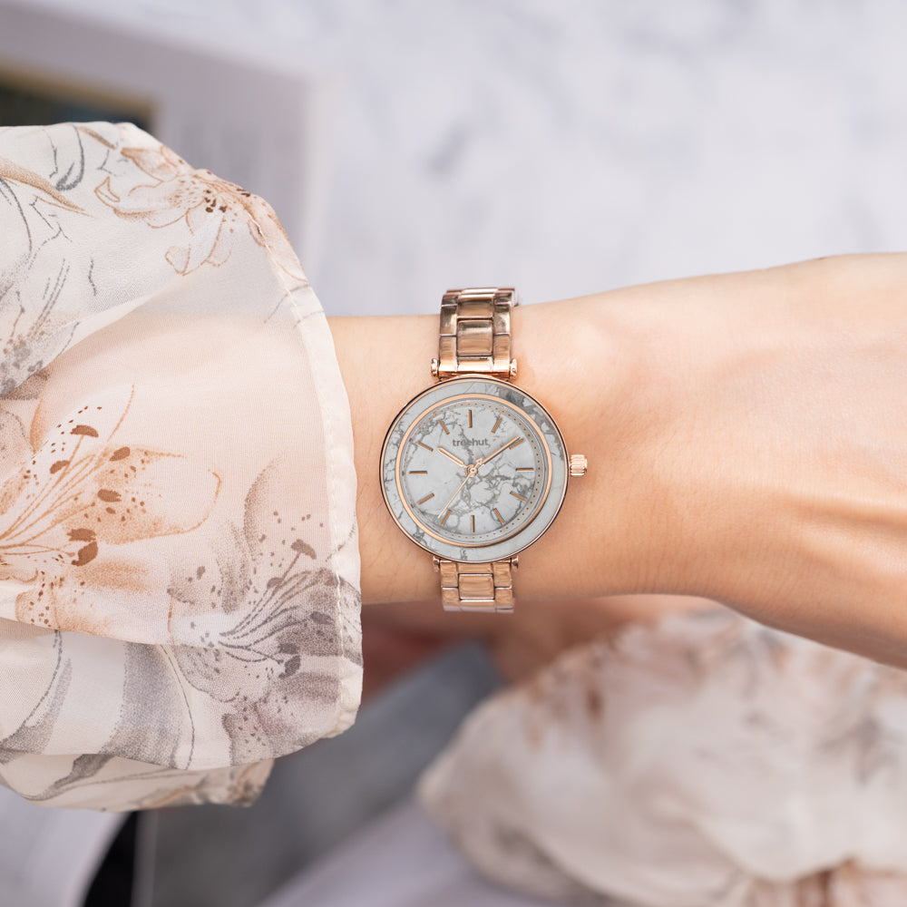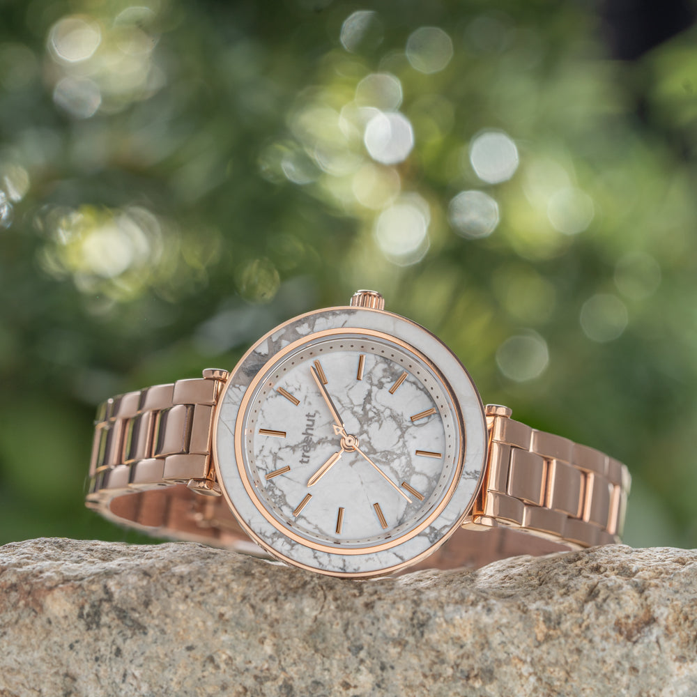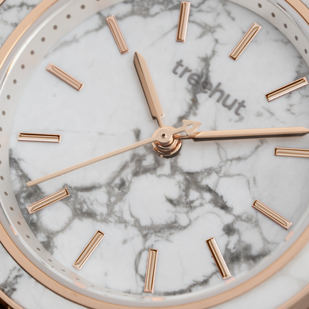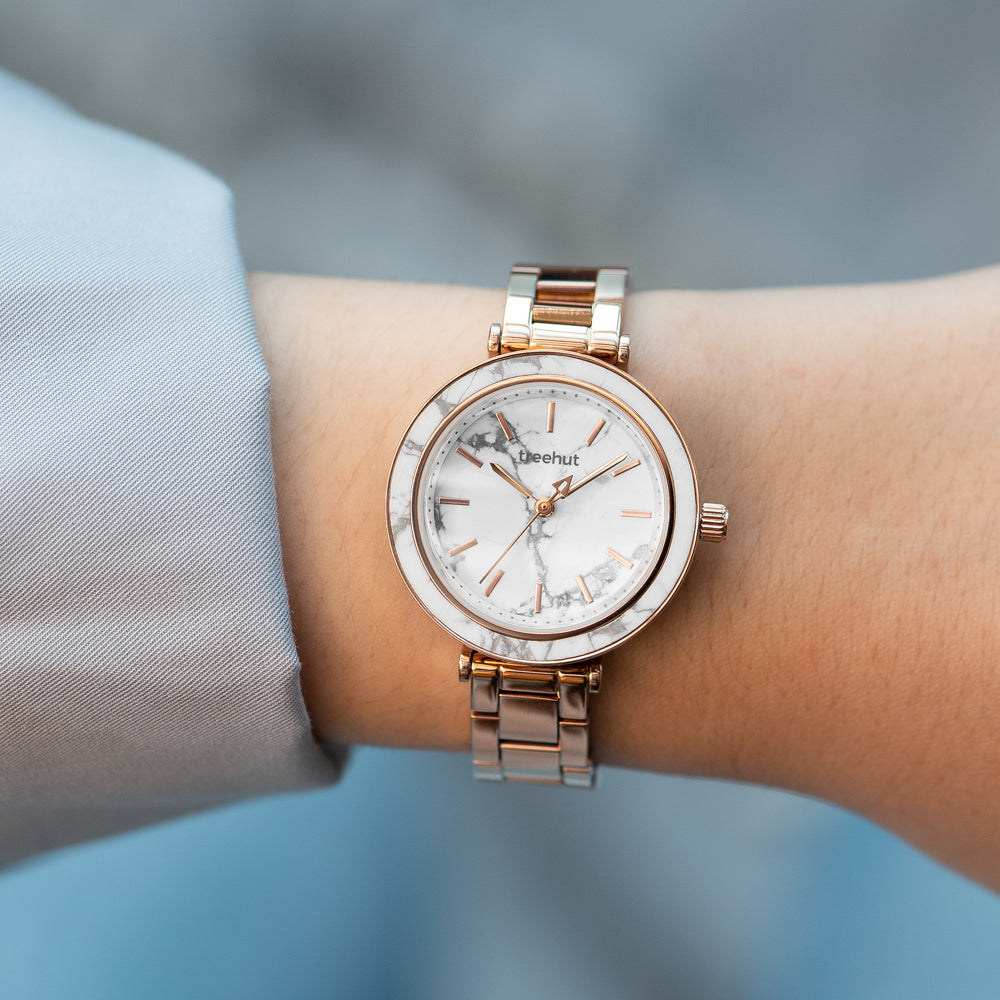 The Skyler White Marble is a white dial watch that pairs natural stone with a modern band. The dial and case are cut from genuine white marble, so every piece shows its own unique pattern. A rose gold bracelet adds contrast, giving the watch a mix of warmth and brightness.