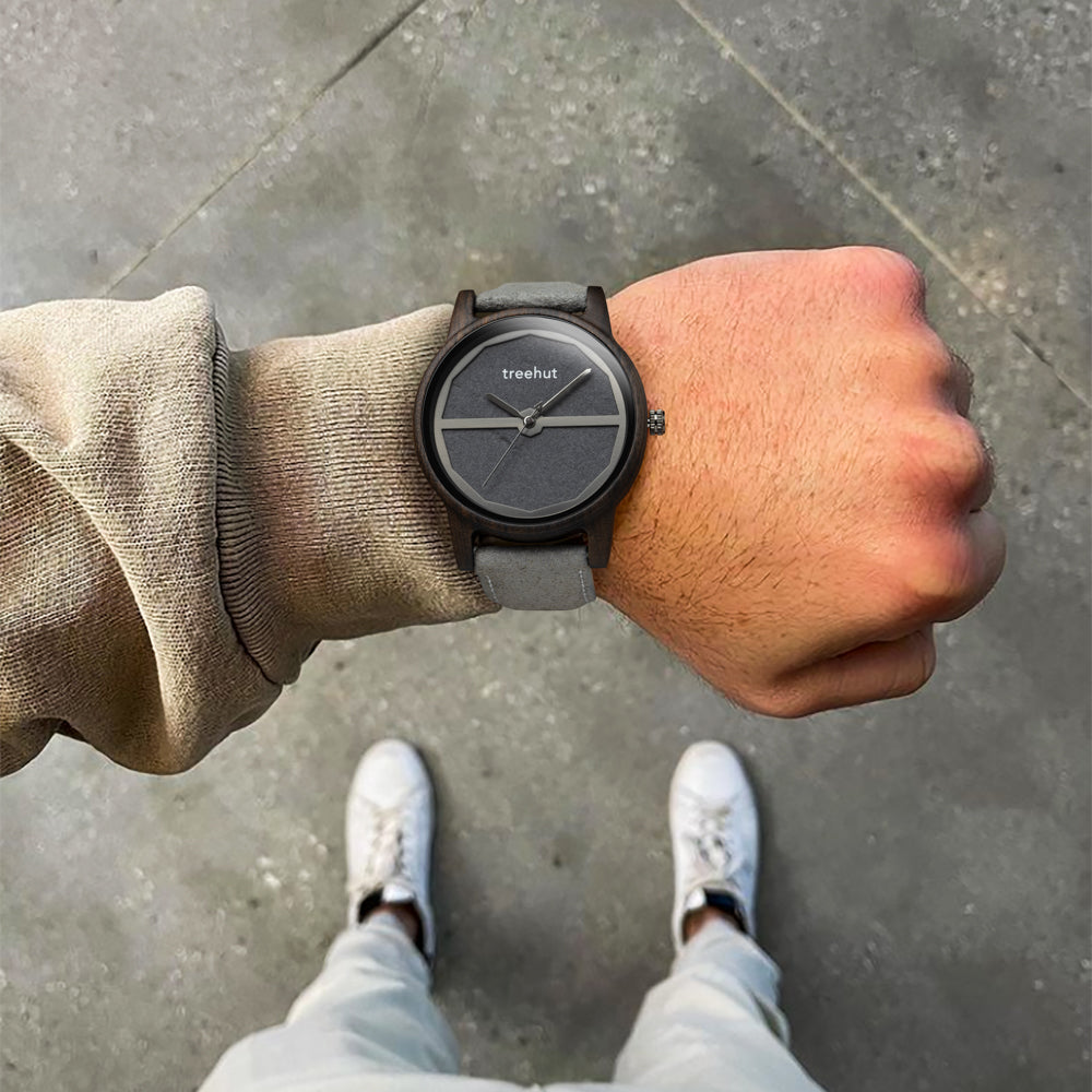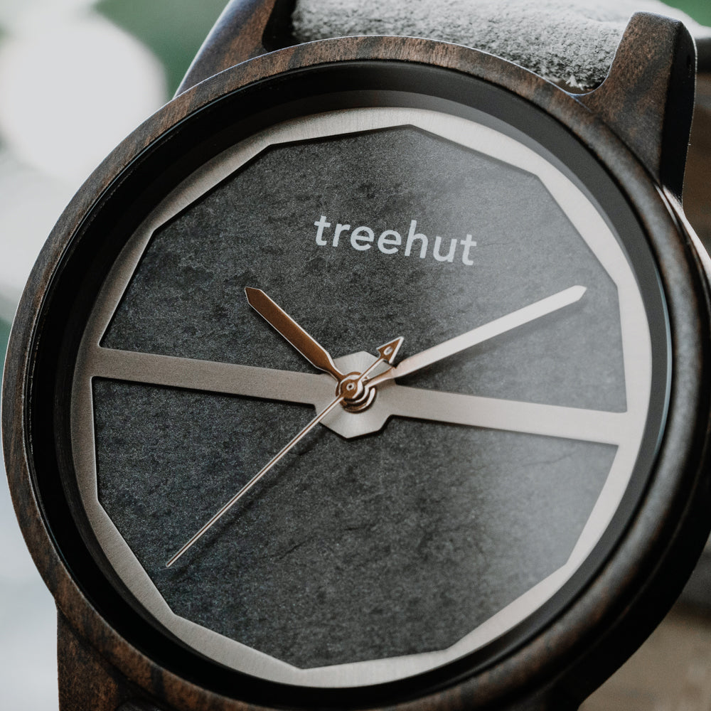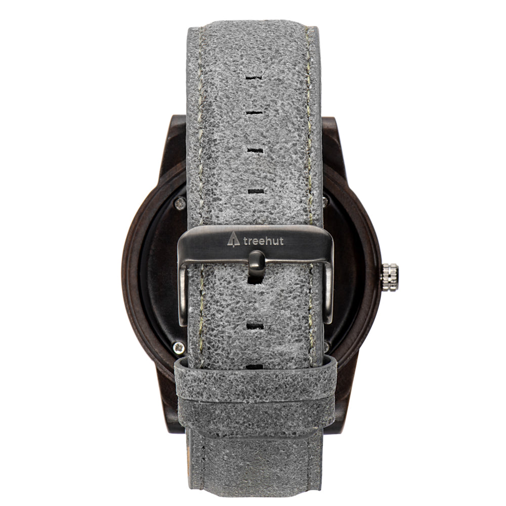 The Summit Stone Grey Vegan pairs an all-natural ebony wood case with a grey vegan leather strap for comfort and versatility. Its raw stone dial ensures no two watches look alike, while its clean design makes it an ideal grey wooden watch for both outdoor trails and office days.