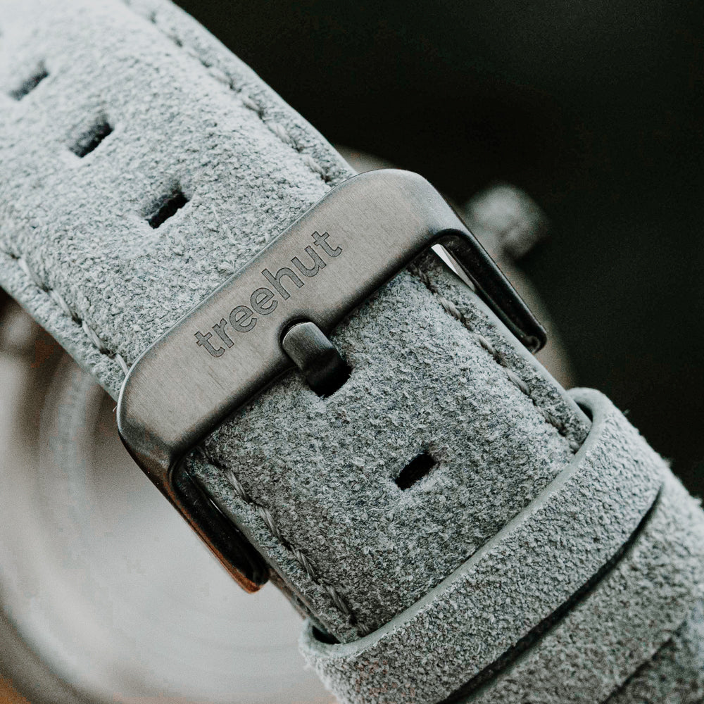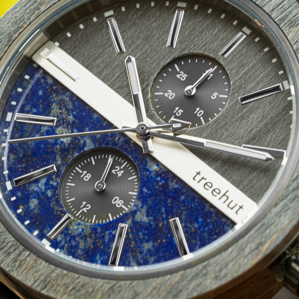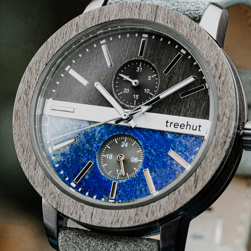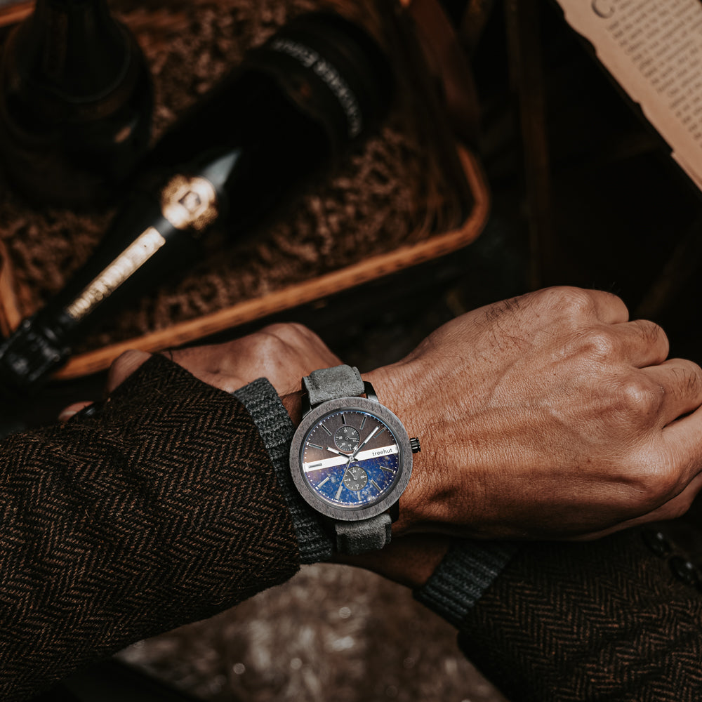 This timepiece is equipped with vertically placed sub-dials for 24-hour military time and date, along with mountain index hands for precision. A soft vegan strap in grey completes the look, pairing comfort with clean style. Among grey wooden watches, this piece shines as a contemporary option for those seeking a luxury wood watch. For anyone exploring wood watches with personality and purpose, this model makes a lasting impression.