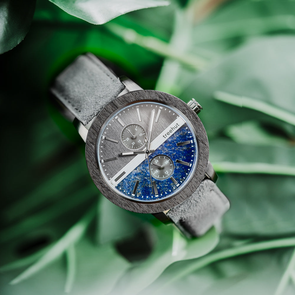 The Tao Collection takes inspiration from yin and yang, blending elements into balance through artful design. The Tao Blue Marble Grey Vegan men’s watch reflects that principle with dual-dial construction, combining natural grey maple and real blue marble. It sits confidently among wood watches, offering a distinctive mix of organic texture and modern detail. The layered grey maple and stainless-steel case frames the design with strength and clarity.
