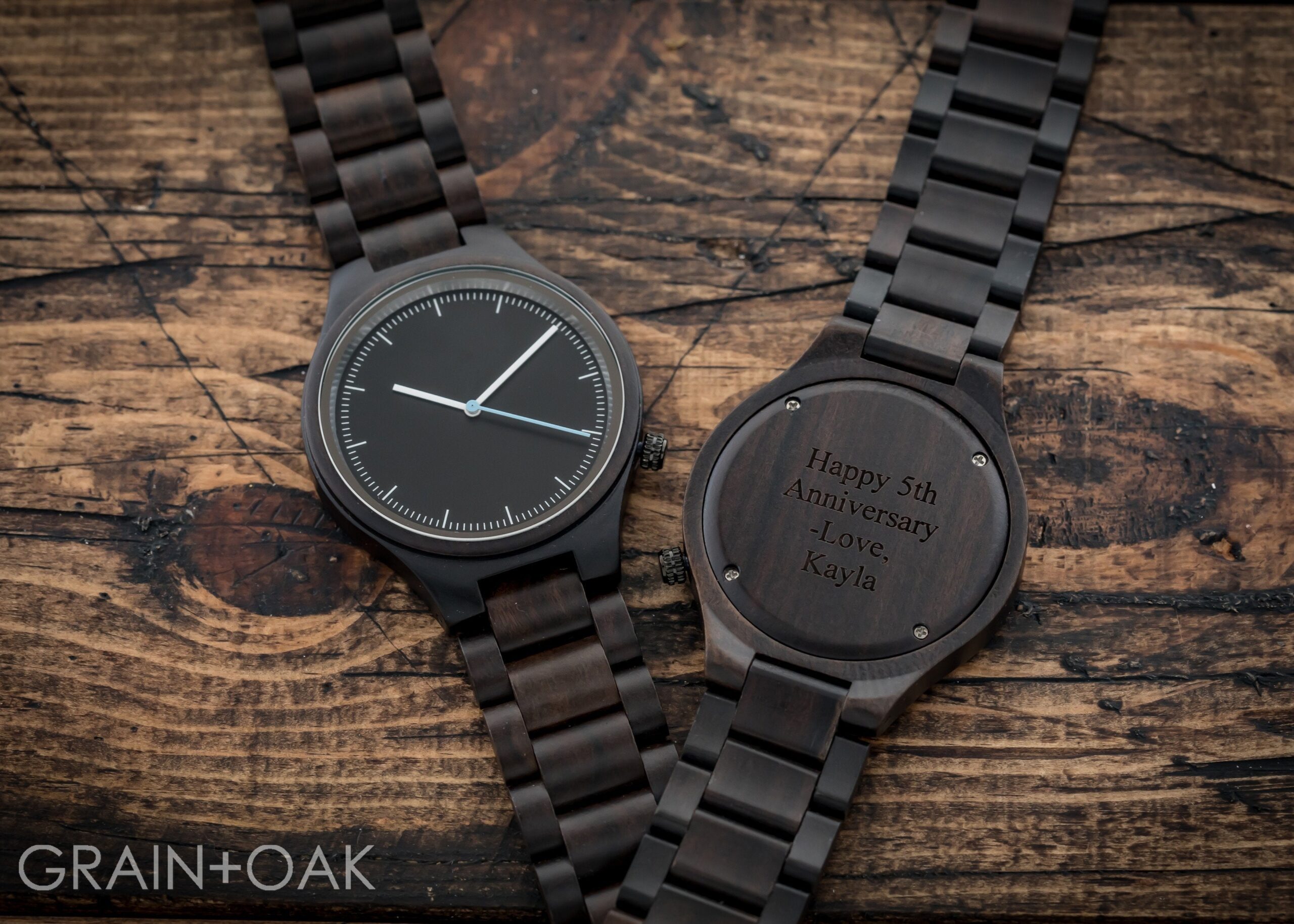 Whether you’re dressed up or paired down, the Classic Ebony wooden watch makes a bold statement in any setting. Made with black sandalwood and accented with silver watch face details, this timepiece offers bold, long wearing style. Silver notched dial markers and a neon blue second hand allow for greater time-reading precision, making it perfect for the busy modern gentleman. A bold 1-inch oyster wristband features lightweight wood links for ultimate comfort. Superior design meets elite function with reliable quartz movement and a 1.75-inch watch face. Add custom engraving to create the perfect gift for any occasion. For extra impact, upload a photo of your handwritten message to enhance the unique, handcrafted quality of your gift.