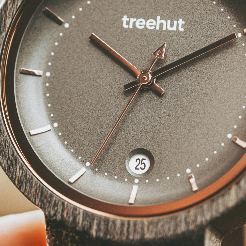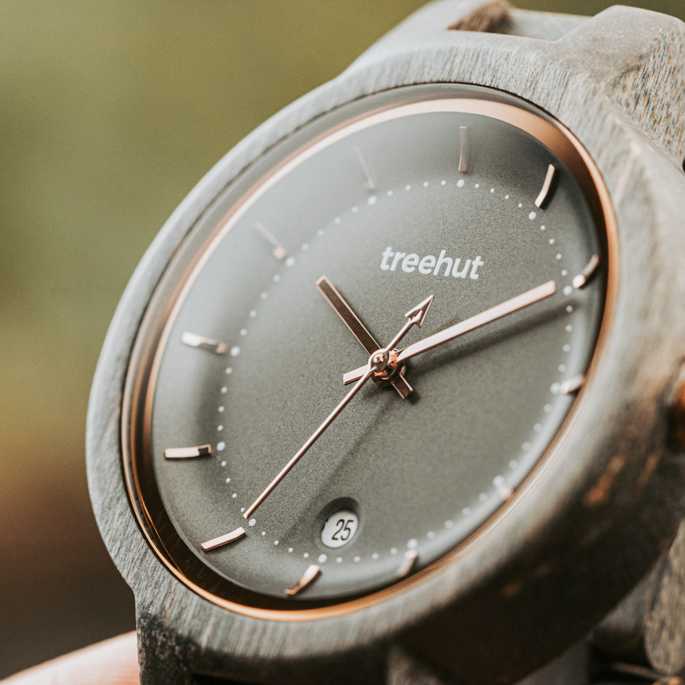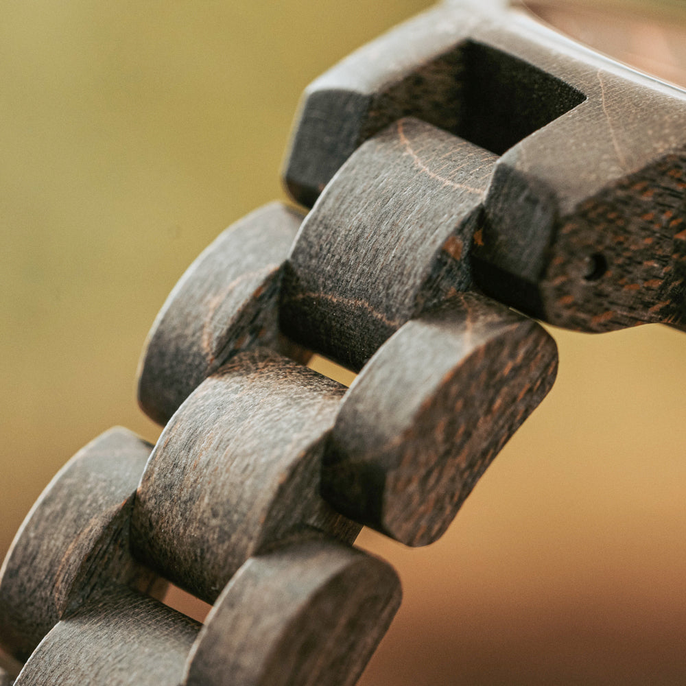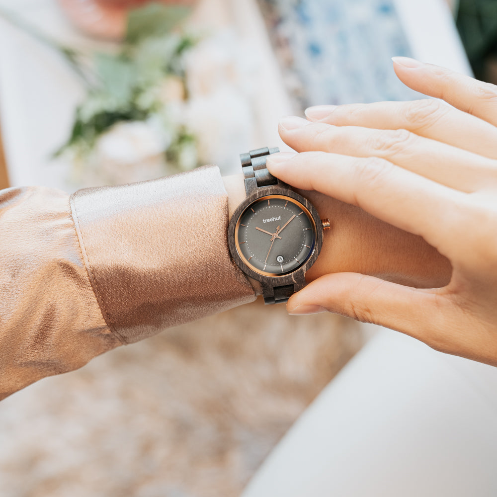 Handcrafted from real maple wood, this women’s wooden watch highlights the beauty of texture and contrast. The rose gold hour markers and date window at 6 o’clock add a soft touch of color against the cool grey tones. This grey watch for women is light on the wrist and easy to wear, whether for daily routines or unplanned moments.