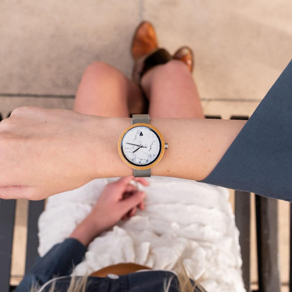 Designed by women for women, the Theory Silver Bamboo Marble keeps the focus on simple detail and natural elements. The unique dial makes the Theory Silver Bamboo Marble stand out as a white dial watch, while the lightweight bamboo adds contrast and warmth to the design. If you’re looking for a marble watch for women that mixes character with practicality, this one belongs in your collection.